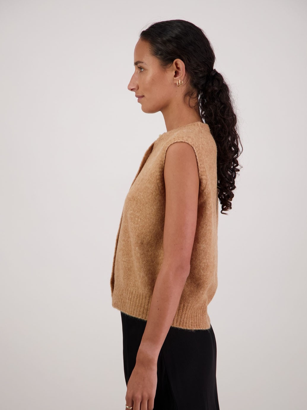 Crafted from a soft, luxurious blend of alpaca, wool, nylon and spandex, the Frankie Vest offers warmth with a beautifully comfortable stretch. Designed as a classic button-through vest in timeless colours, it’s an effortlessly versatile layering piece that adds understated polish to any outfit.