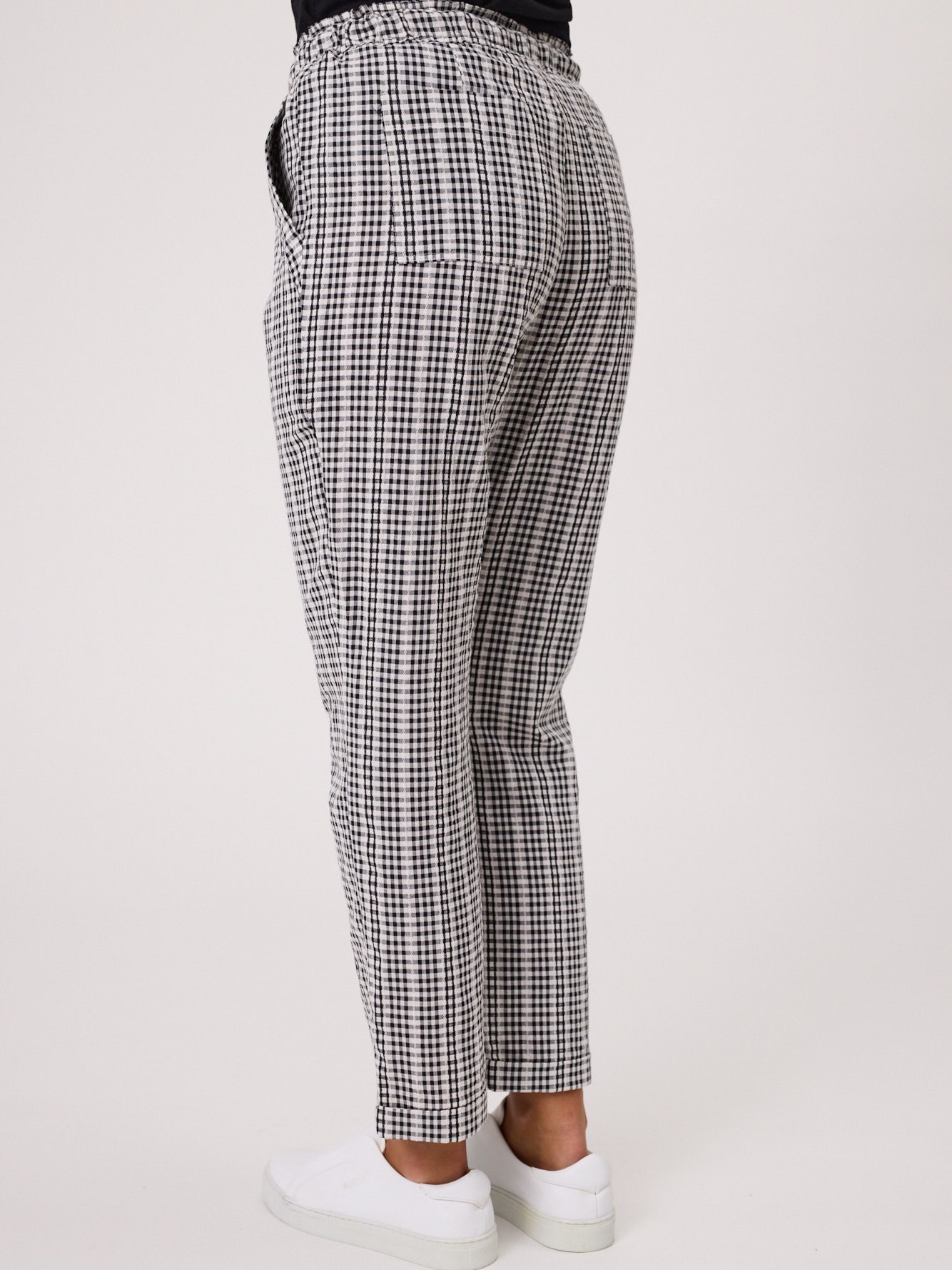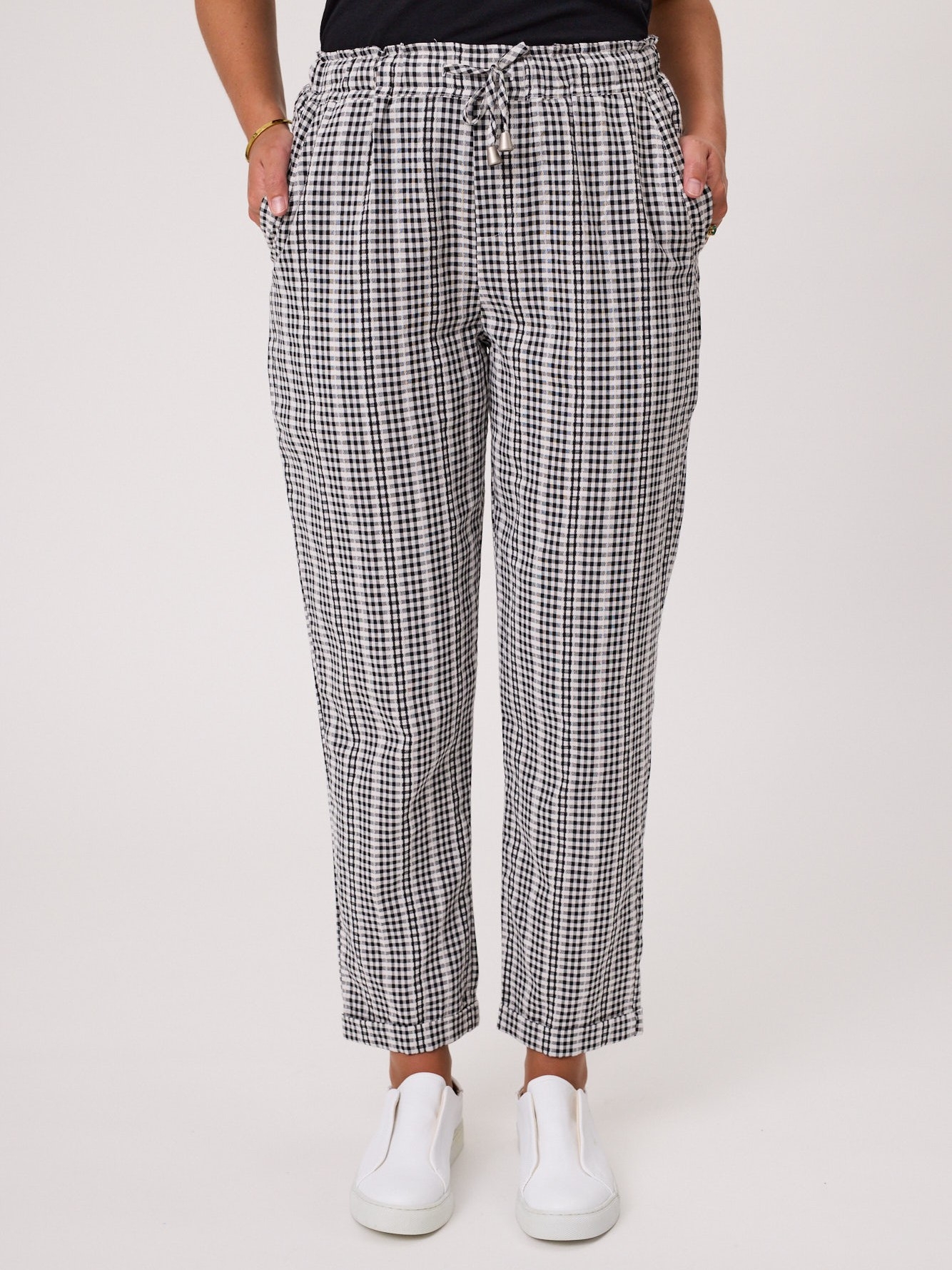 The elasticated waist with drawstring ensures a flexible, adjustable fit, while the side pockets provide practical storage without sacrificing style. Finished with a turn-up hem, these pants add a contemporary touch to a timeless check pattern, making them perfect for both relaxed and dressed-up looks.