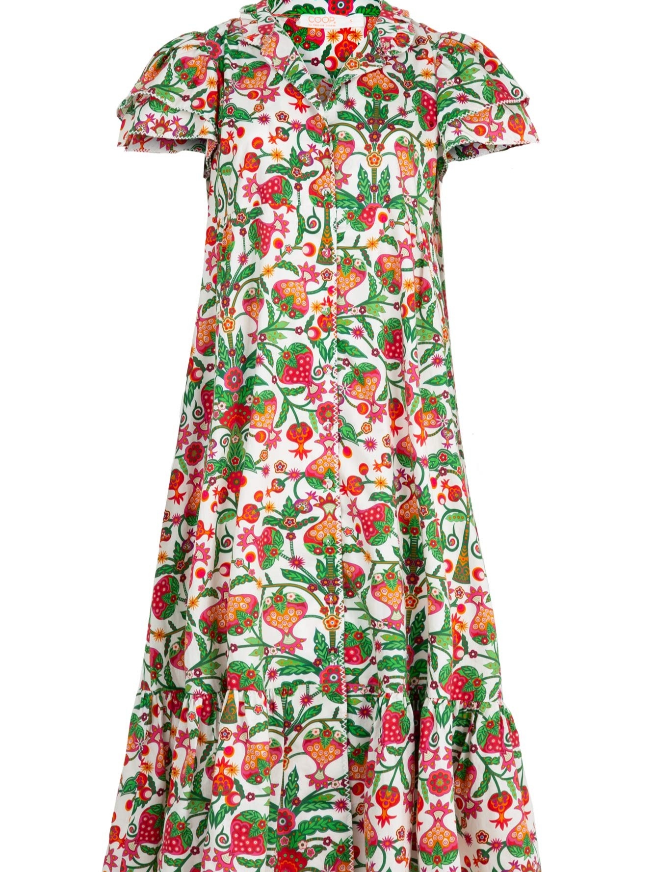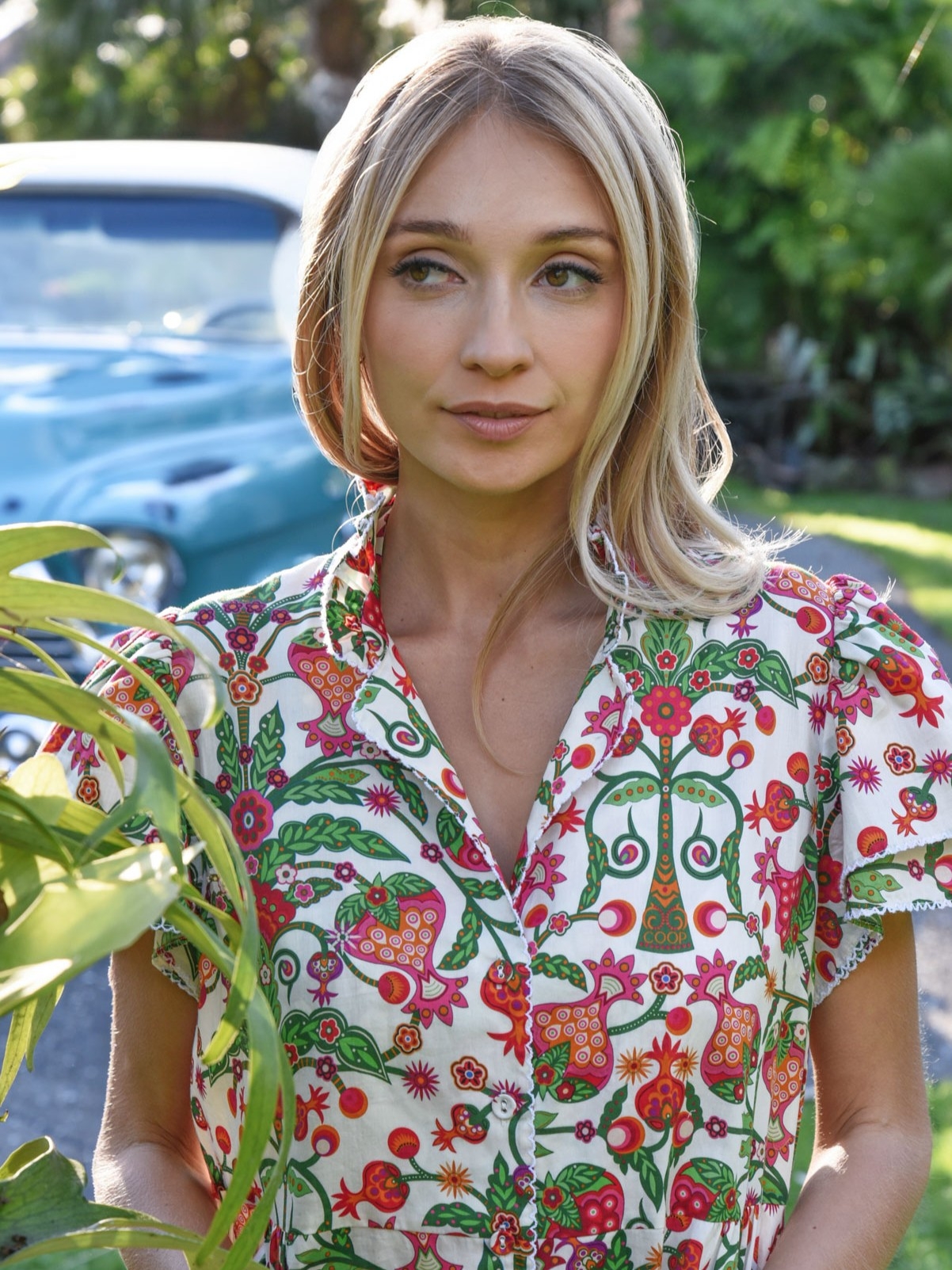 Luxe cotton sateen and a whimsical print come together to present the ‘A Little Flair’ dress. Crafted in the ‘Berry Good’ cotton sateen, this dress sports a button through front, complete with covered buttons, layered flutter sleeves and a gathered hem tier. A delicate embroidered trim polishes this charming dress to perfection.