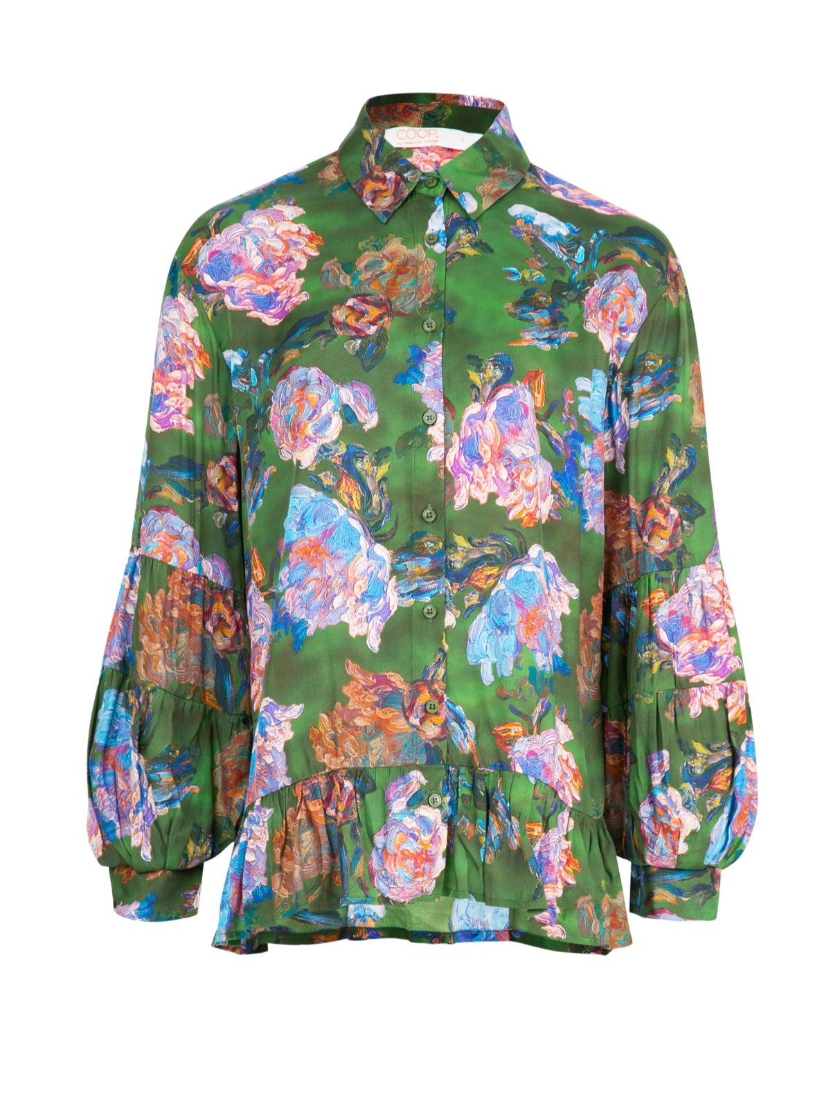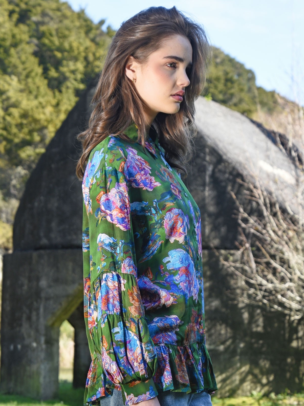 From daytime chic to evening elegance, the ‘Flounce On’ blouse is a showstopper ready to turn heads, thanks to the bold and vibrant ‘Brush Stokes’ fabrication. With details alluding to romance, this blouse boasts balloon sleeves with gathered panels, a button through design, and a frilled hem tier, perfect for a touch of drama and intrigue.