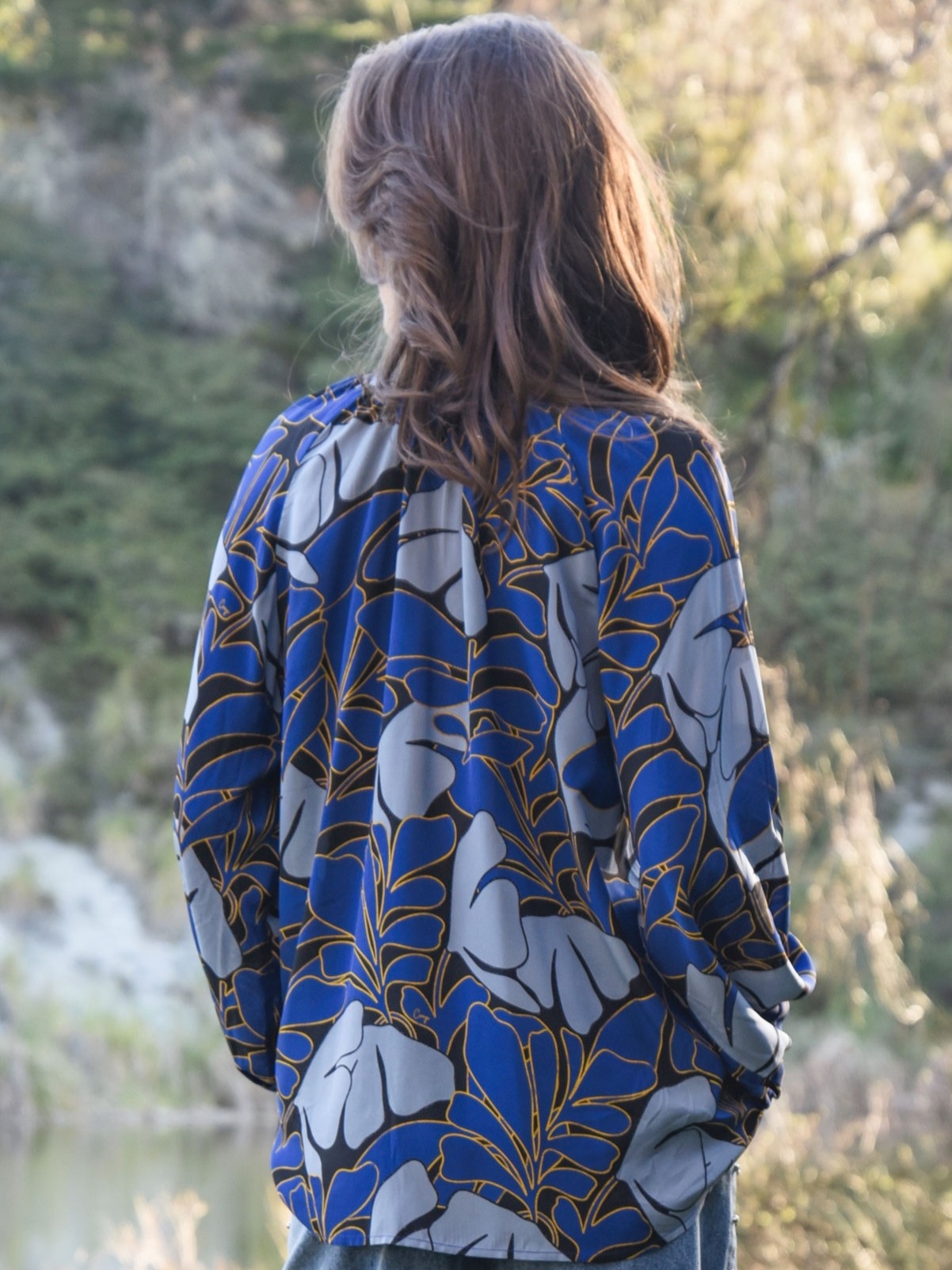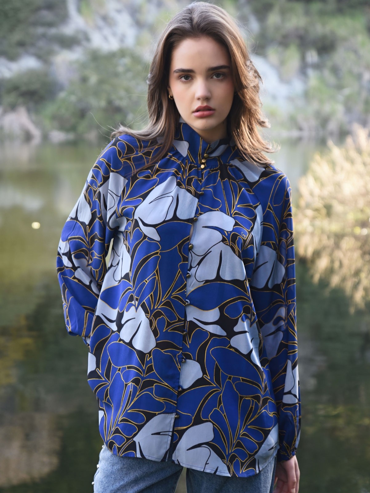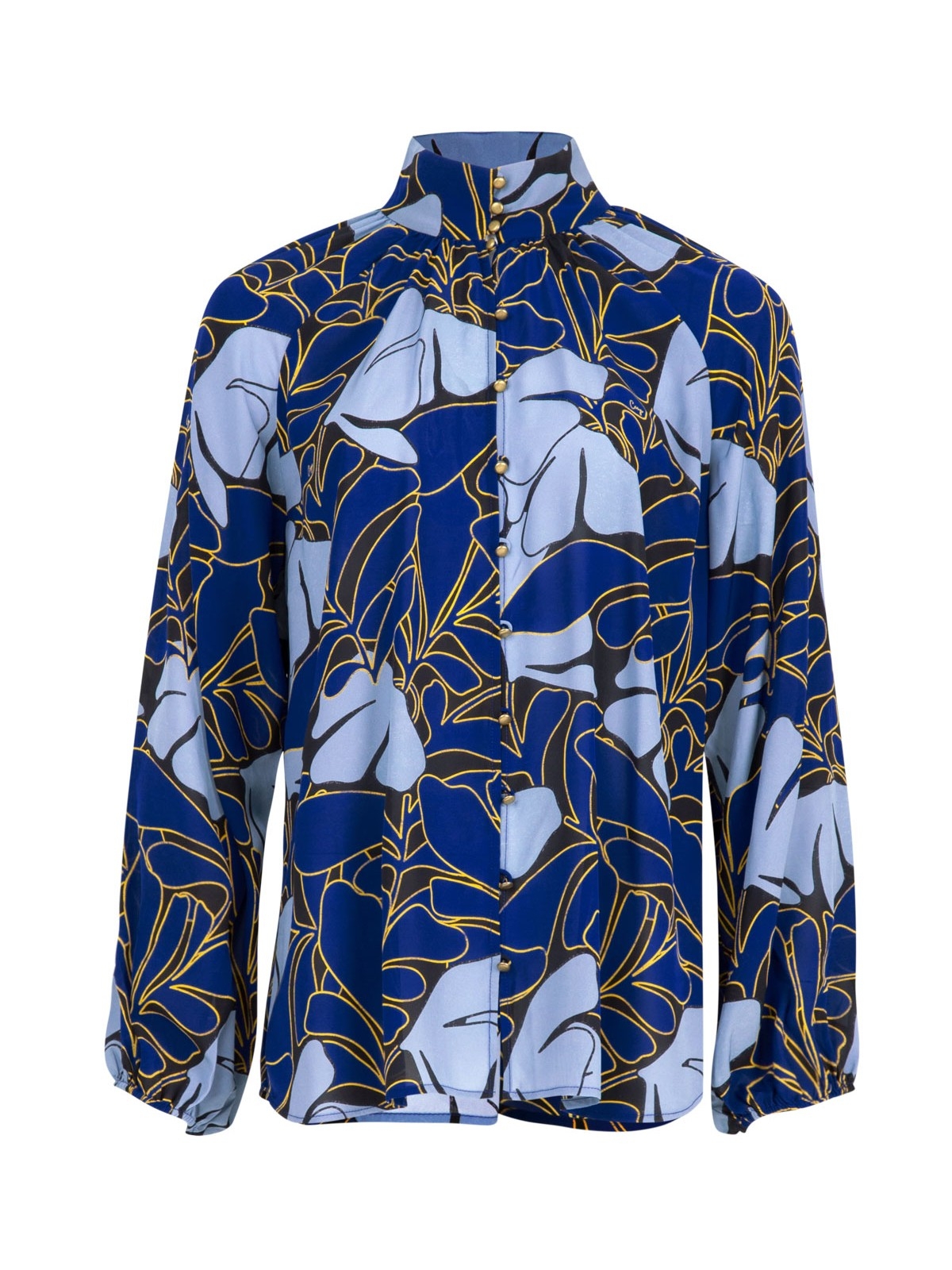 A bold blue abstract floral dances across the 'High & Mighty' blouse, crafted in 'Leaf It to Me' printed viscose. With a stand collar, delicate rouleau loop buttoning, raglan inset blouson sleeves, and softly elasticated cuffs, it balances expressive artistry with effortless, fashion-led elegance.