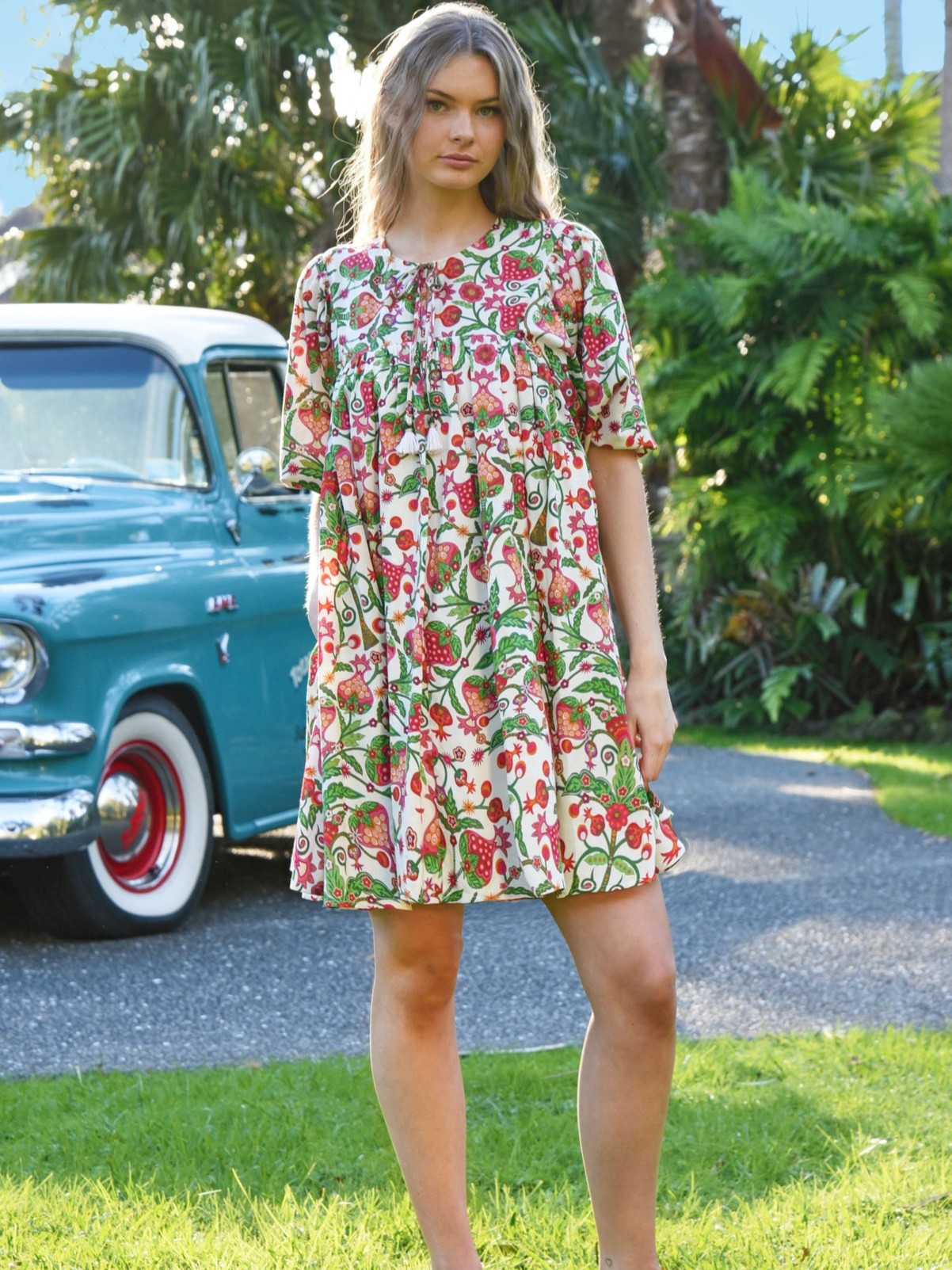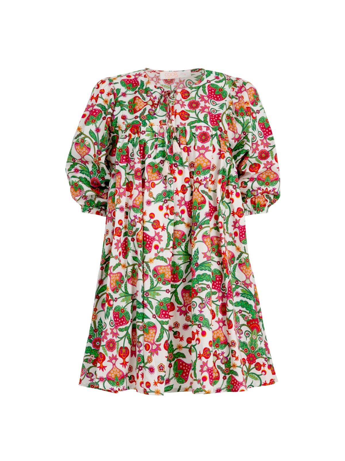 Balancing both a vibrant print and a shorter hemline, the ‘Short and Sweet’ dress is intelligently designed for summer. Crafted in the ‘Berry Good’ cotton sateen, this luxe feeling cotton is gathered from the yoke, creating a whimsical baby doll silhouette. Complimented with puff sleeves and a demure neck tie, this dress is a summertime must-have.