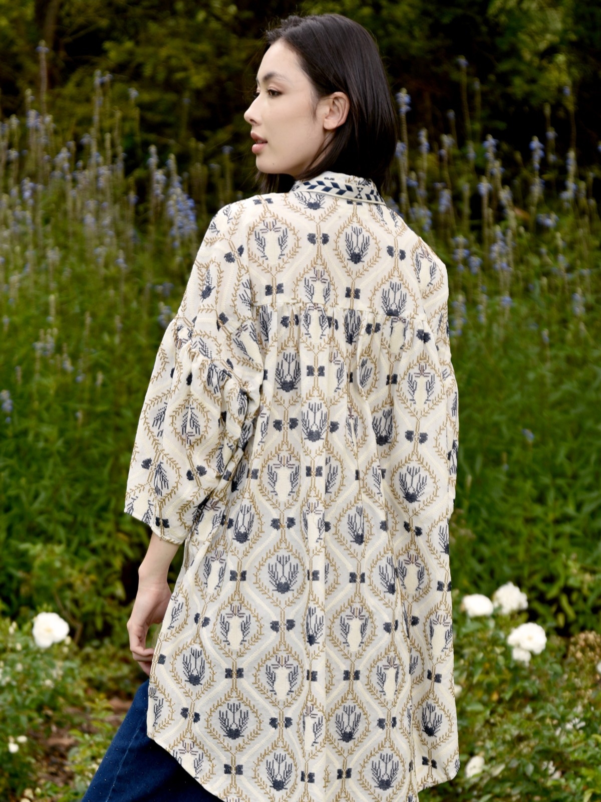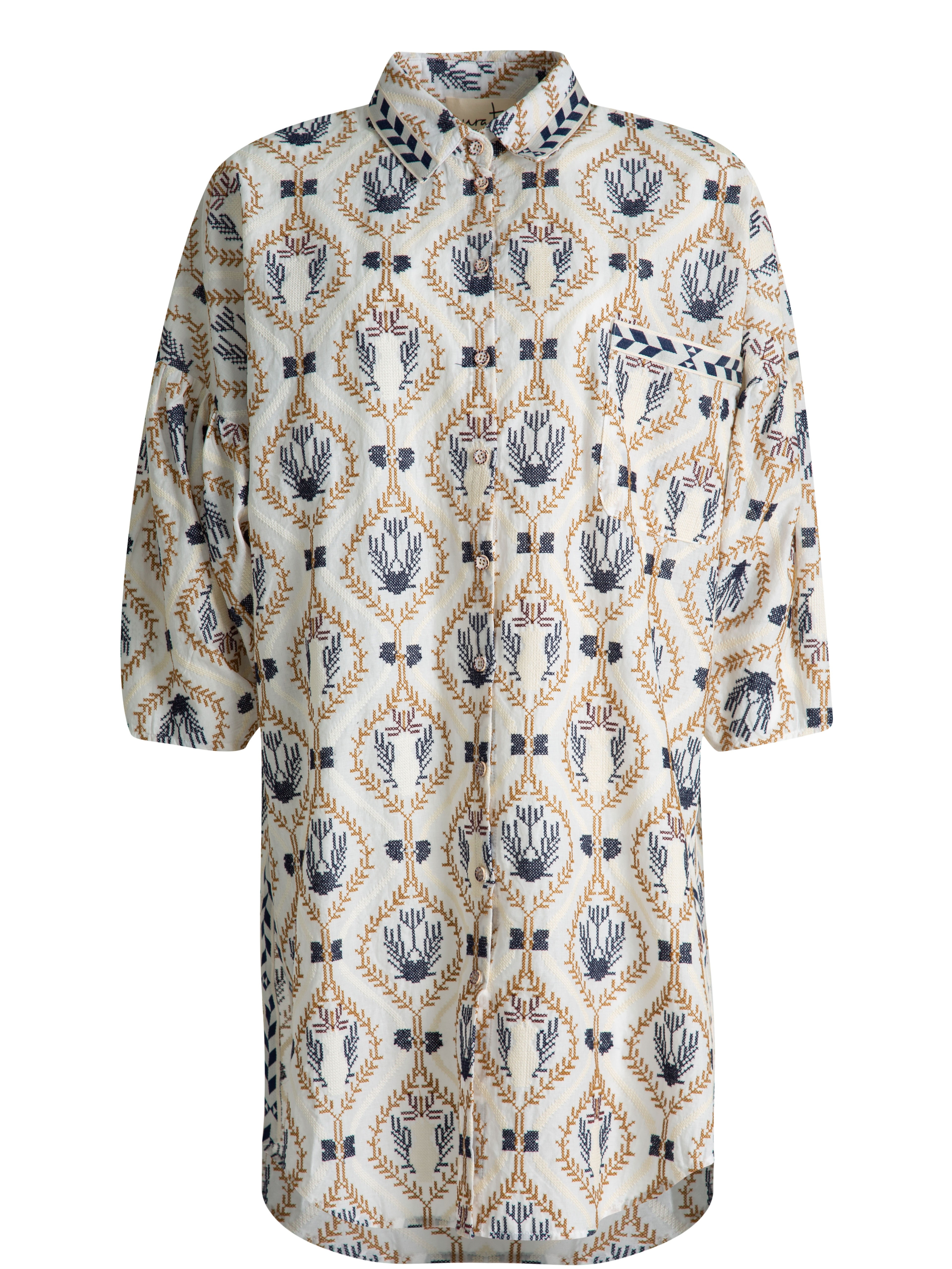 Charming cross stitch embroidery takes this classic Curate staple to new levels. Crafted in the embroidered ‘Stitch by Stitch’ cotton, the ‘Something Borrowed’ shirt cuts a relaxed silhouette with a longer-line allowing for multi-dimensional layering. Printed tape lines the collar and patch pocket to add a contemporary pop. Push and puff the sleeves with the elasticated sleeve cuff for a care-free, stylish look.