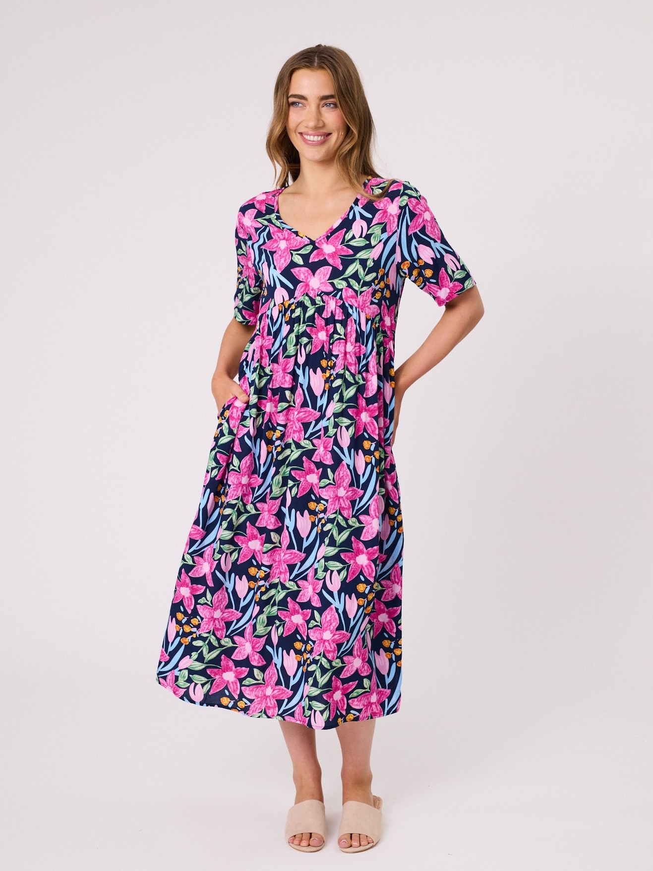 V front and back dress with pockets.