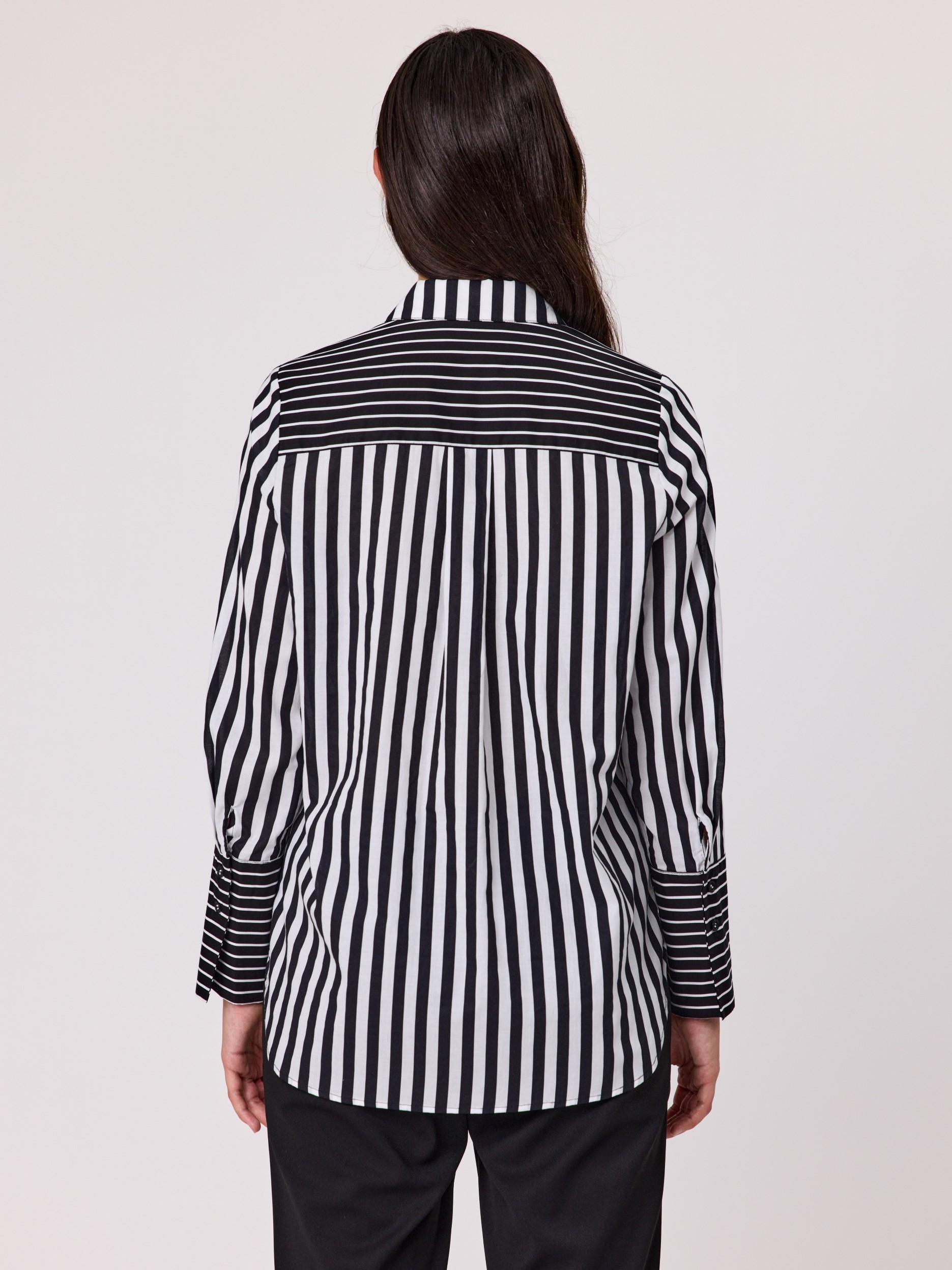 This eye-catching Black & White Stripe Shirt, designed with a collared neckline, long sleeves, and a classic button-front opening. The shirt features a dynamic mix of stripe widths—thin stripes on one side and bold, wide stripes on the other—creating a visually striking contrast.