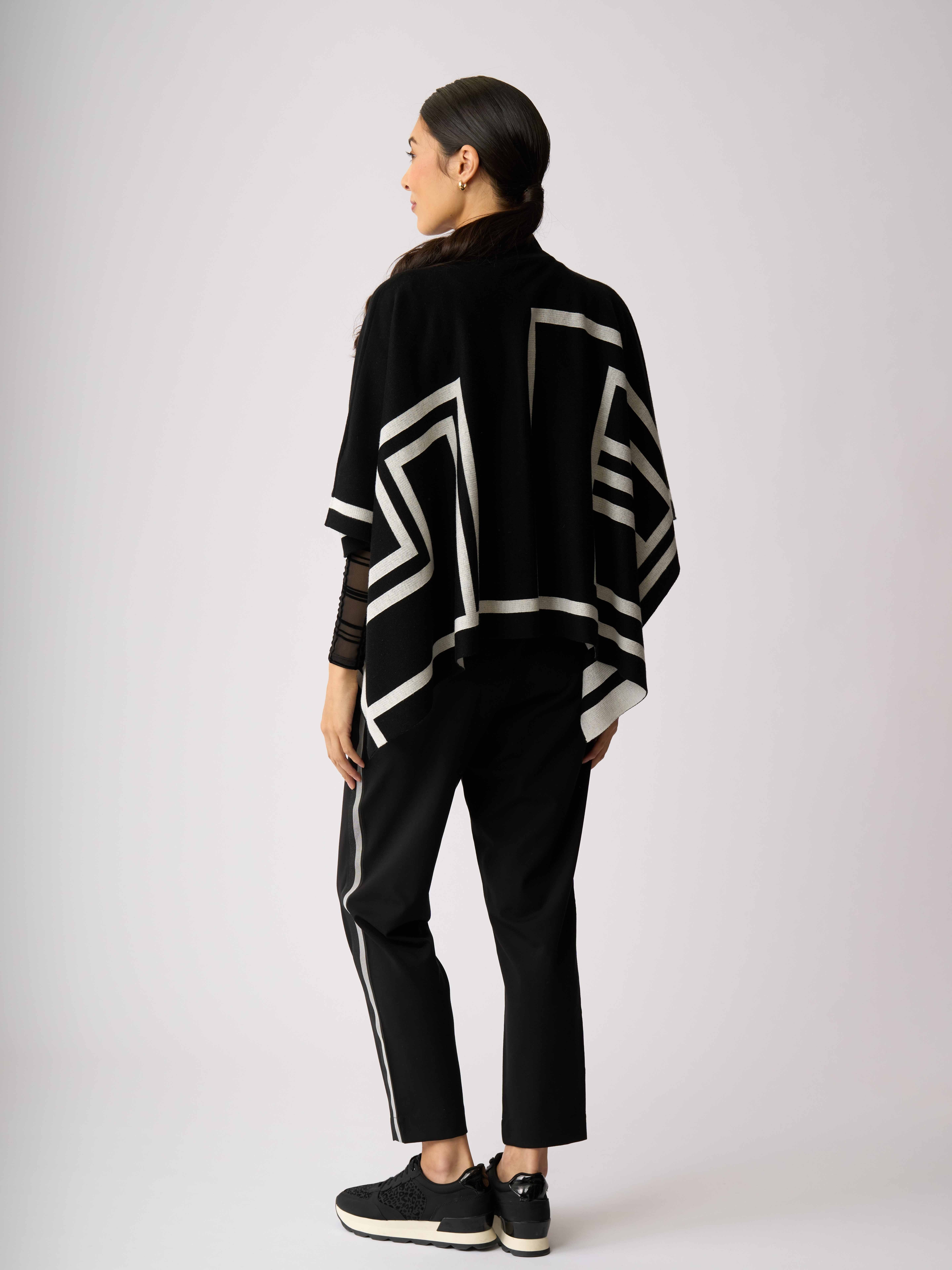 - Ready to go poncho with a high neck and monochrome abstract design.