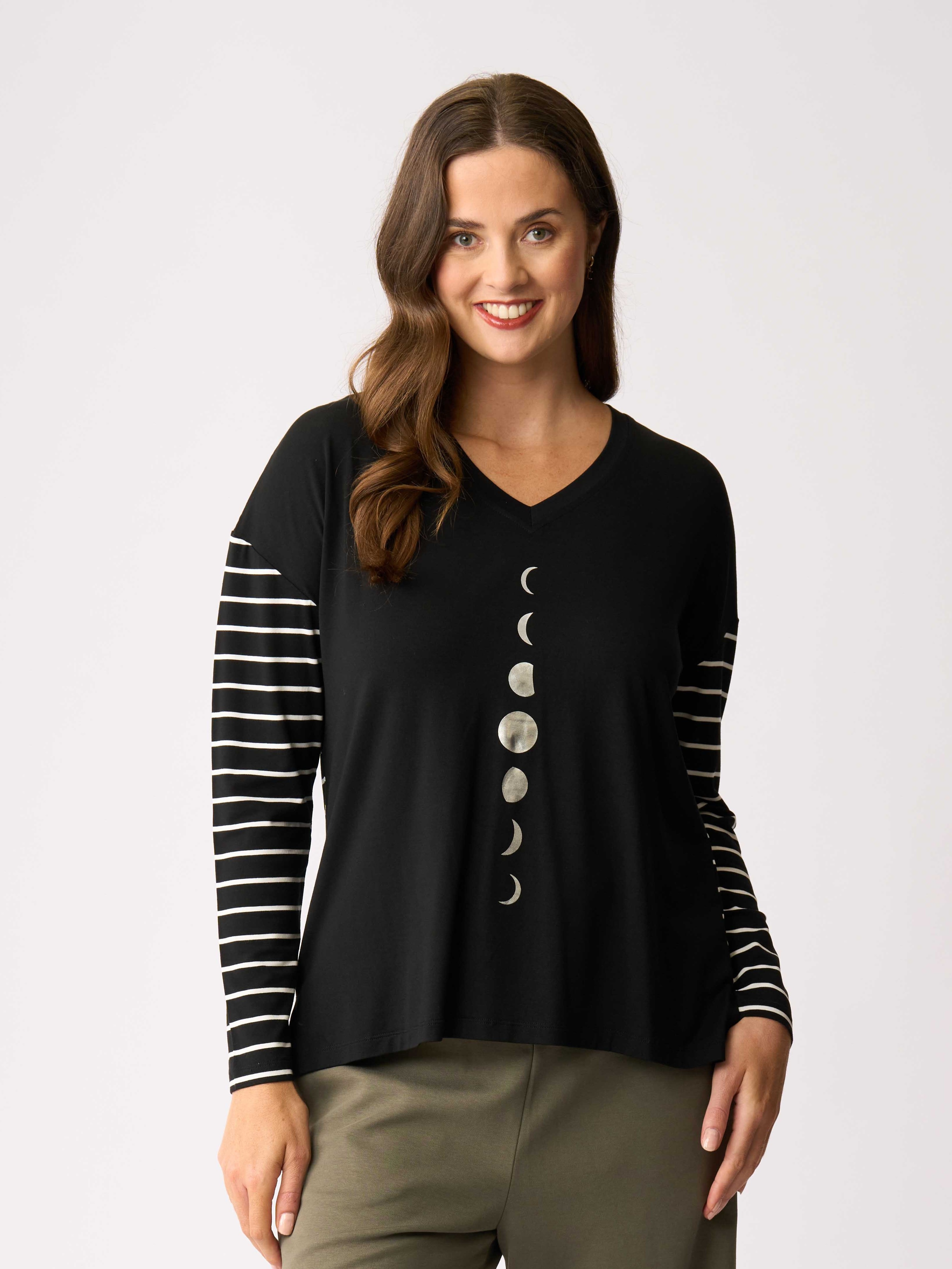 - Combo print top featuring a plain front body with stripe detail on the back body and sleeves.