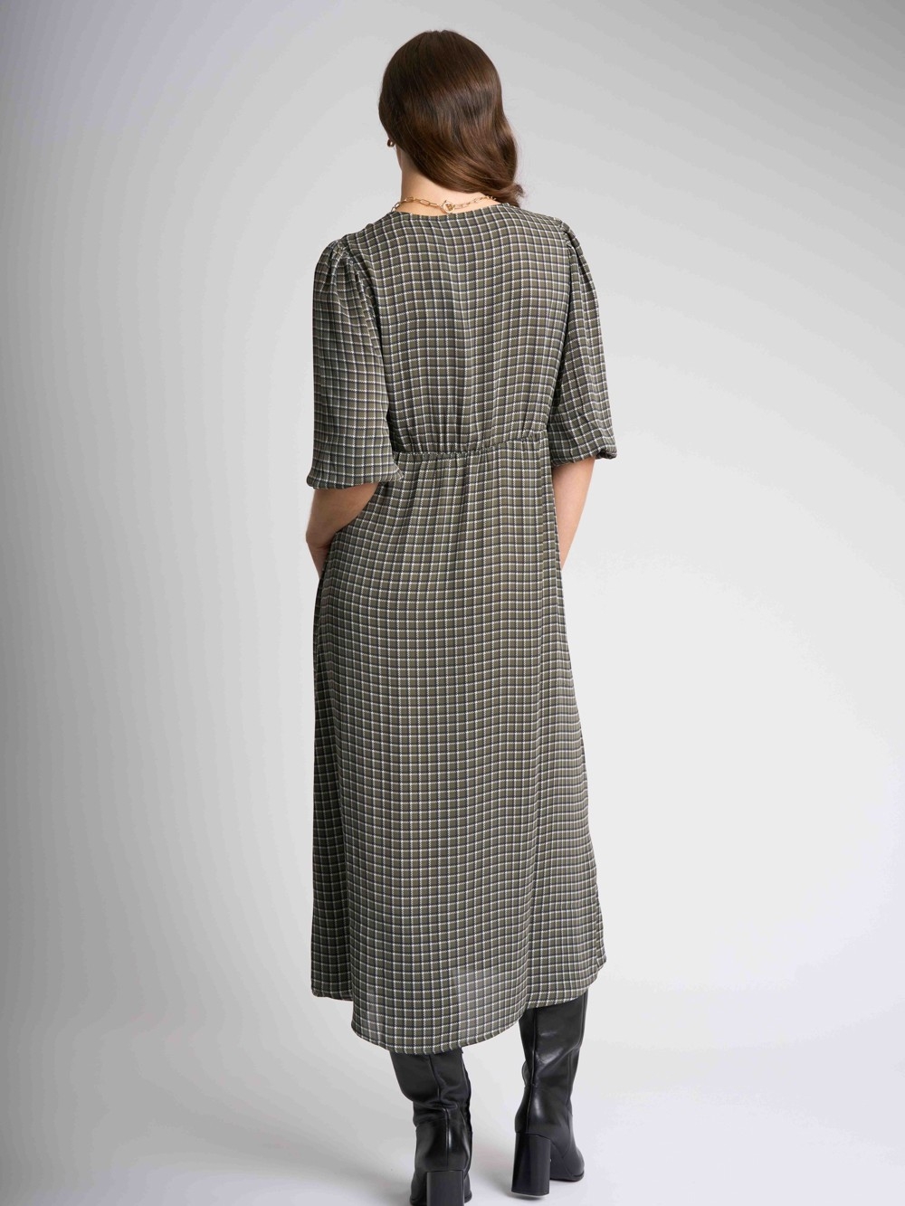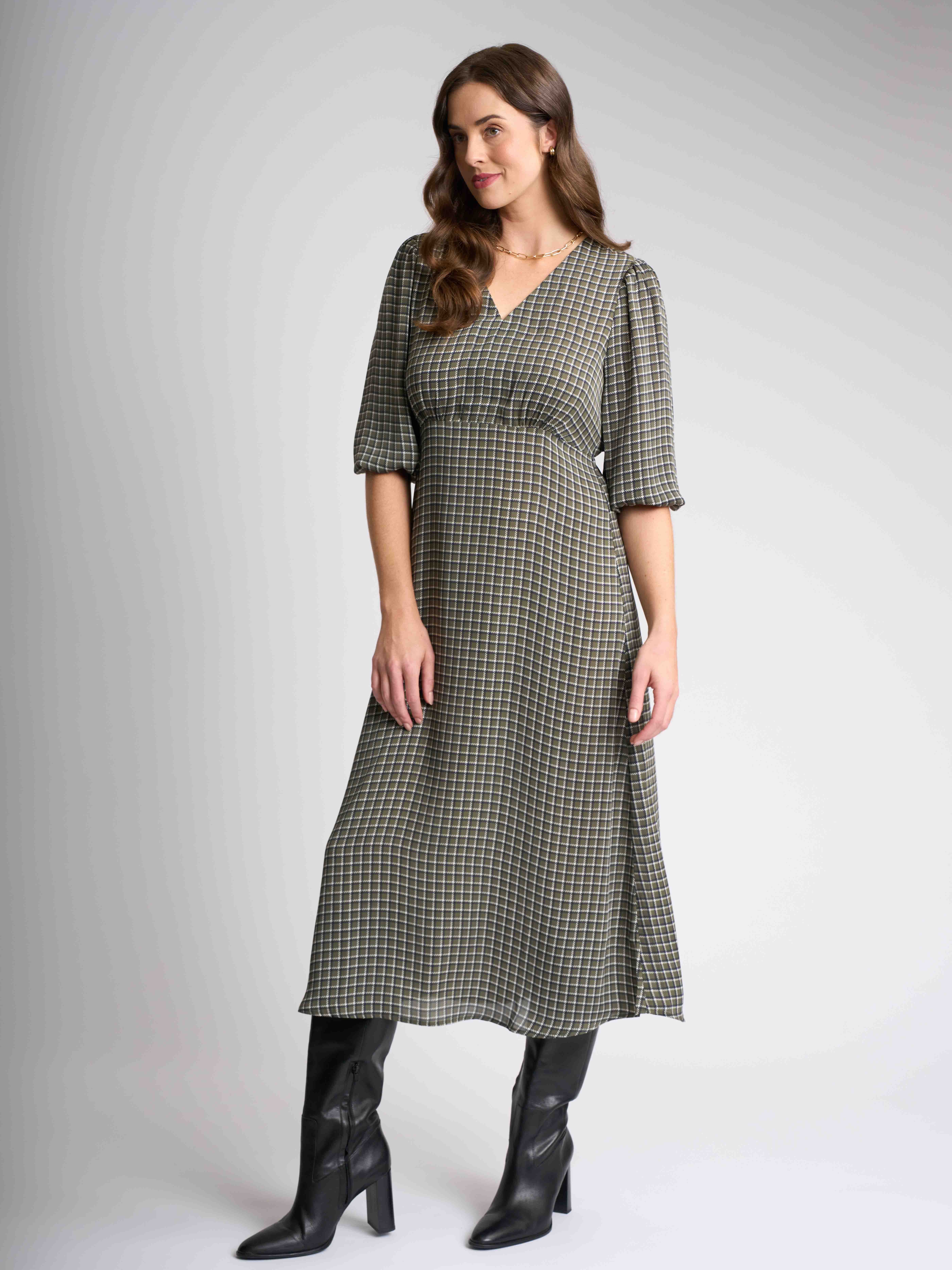 Step into effortless elegance with our V-neck midi dress, perfect for any occasion. Designed with flattering gathers and an elastic waist, it ensures a graceful silhouette. Its long sleeves offer a touch of sophistication while the flowing length promises comfort and style all day.