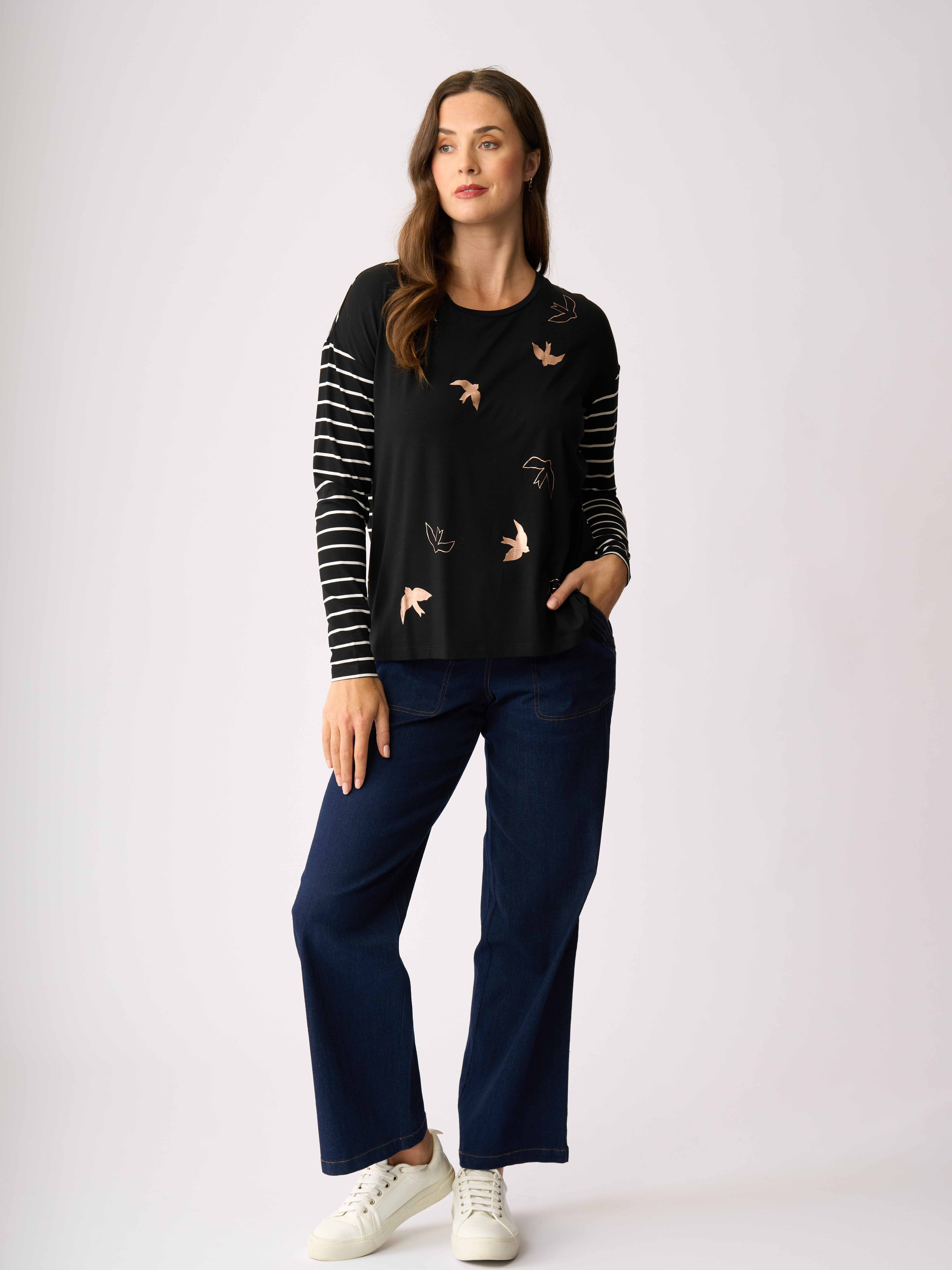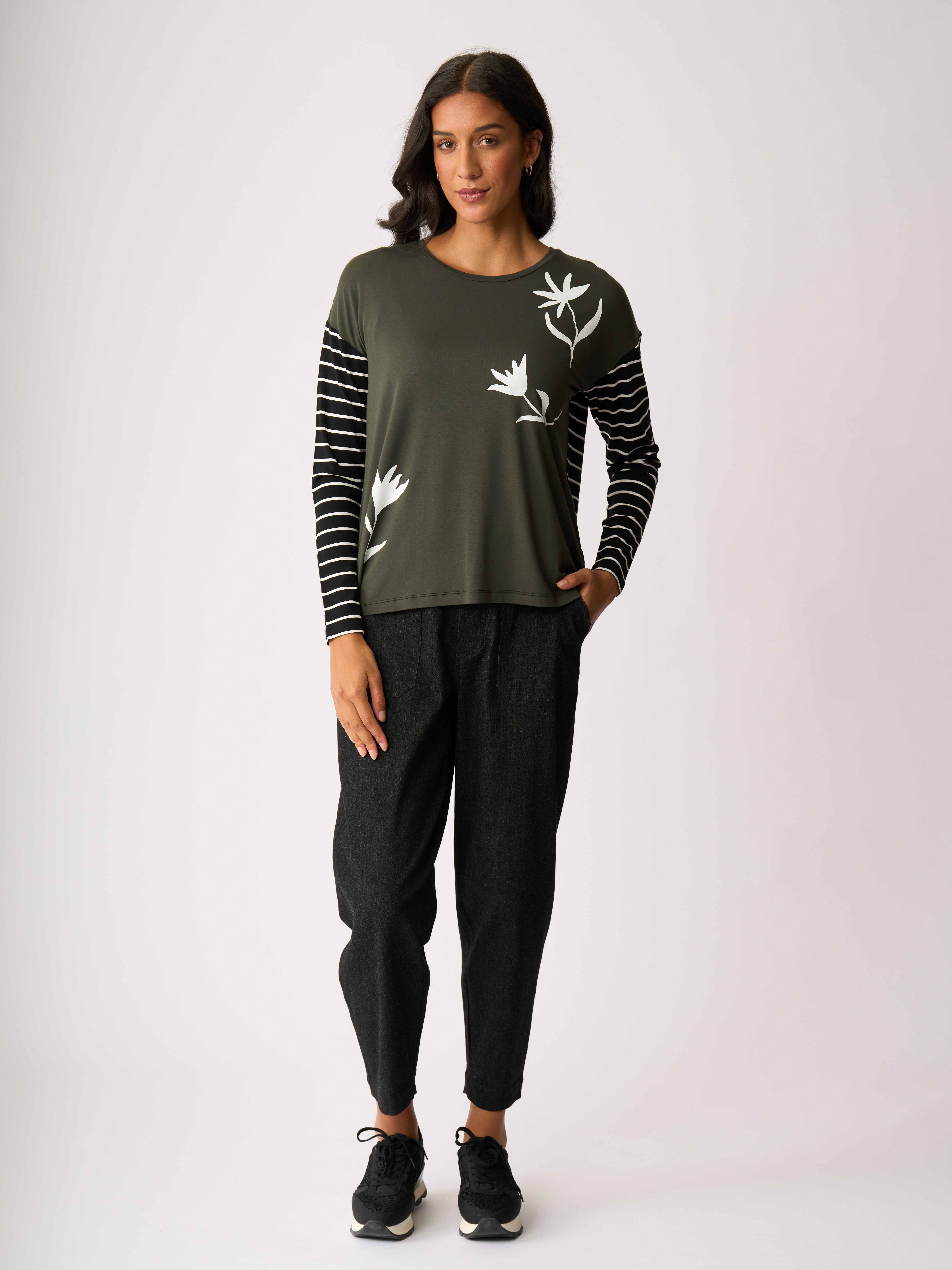 - Contrasting plain with stripe & placement print.