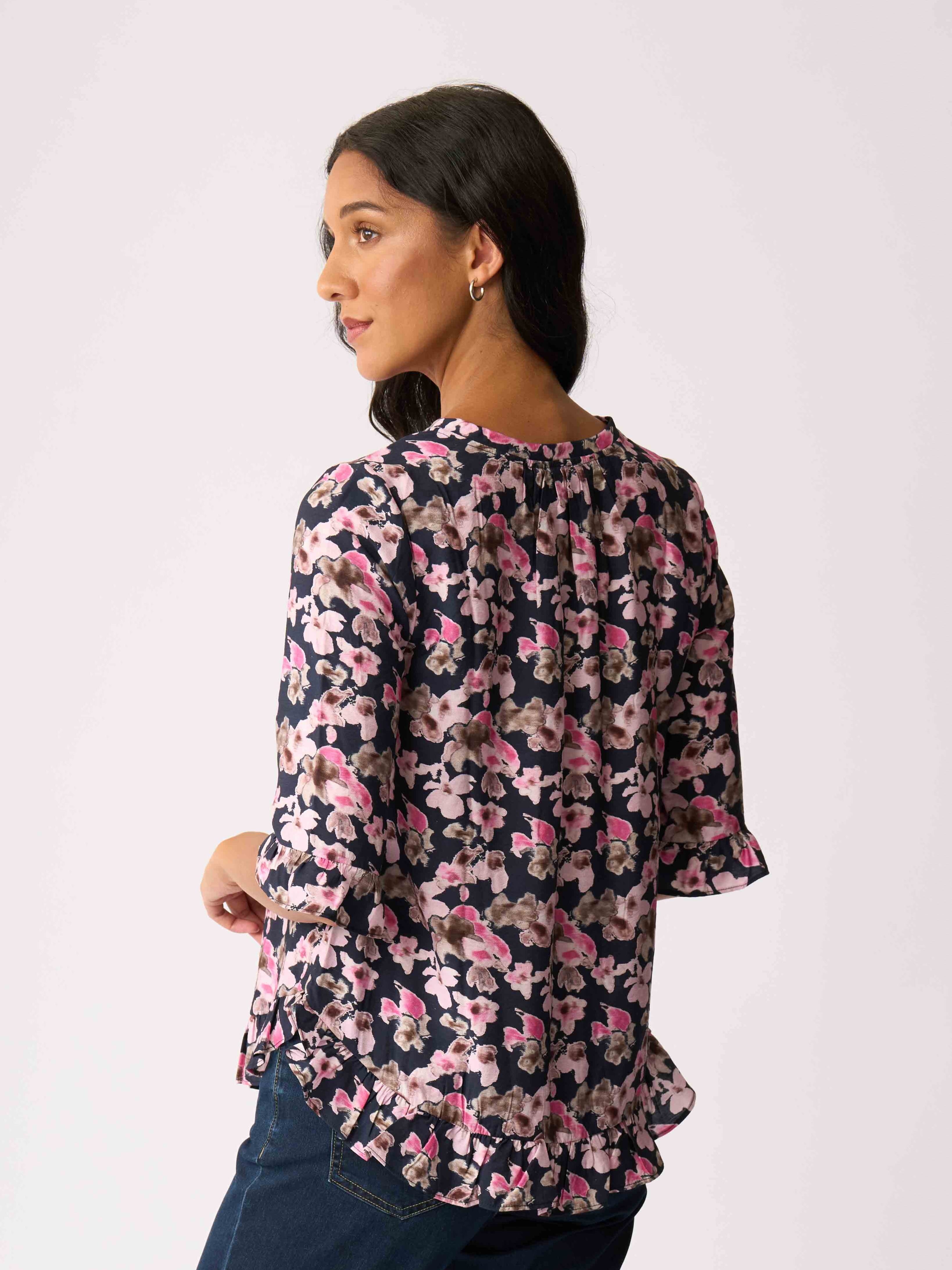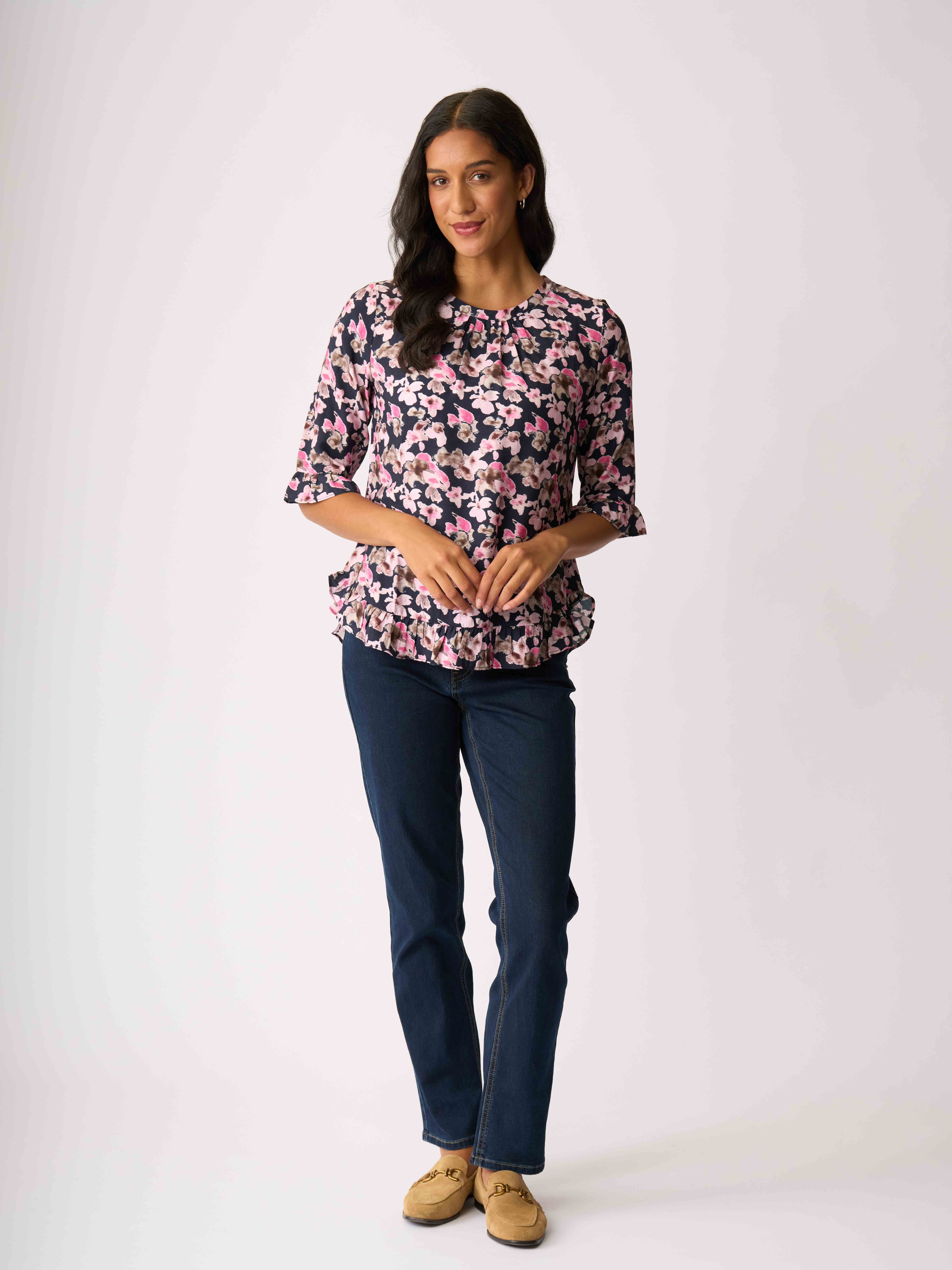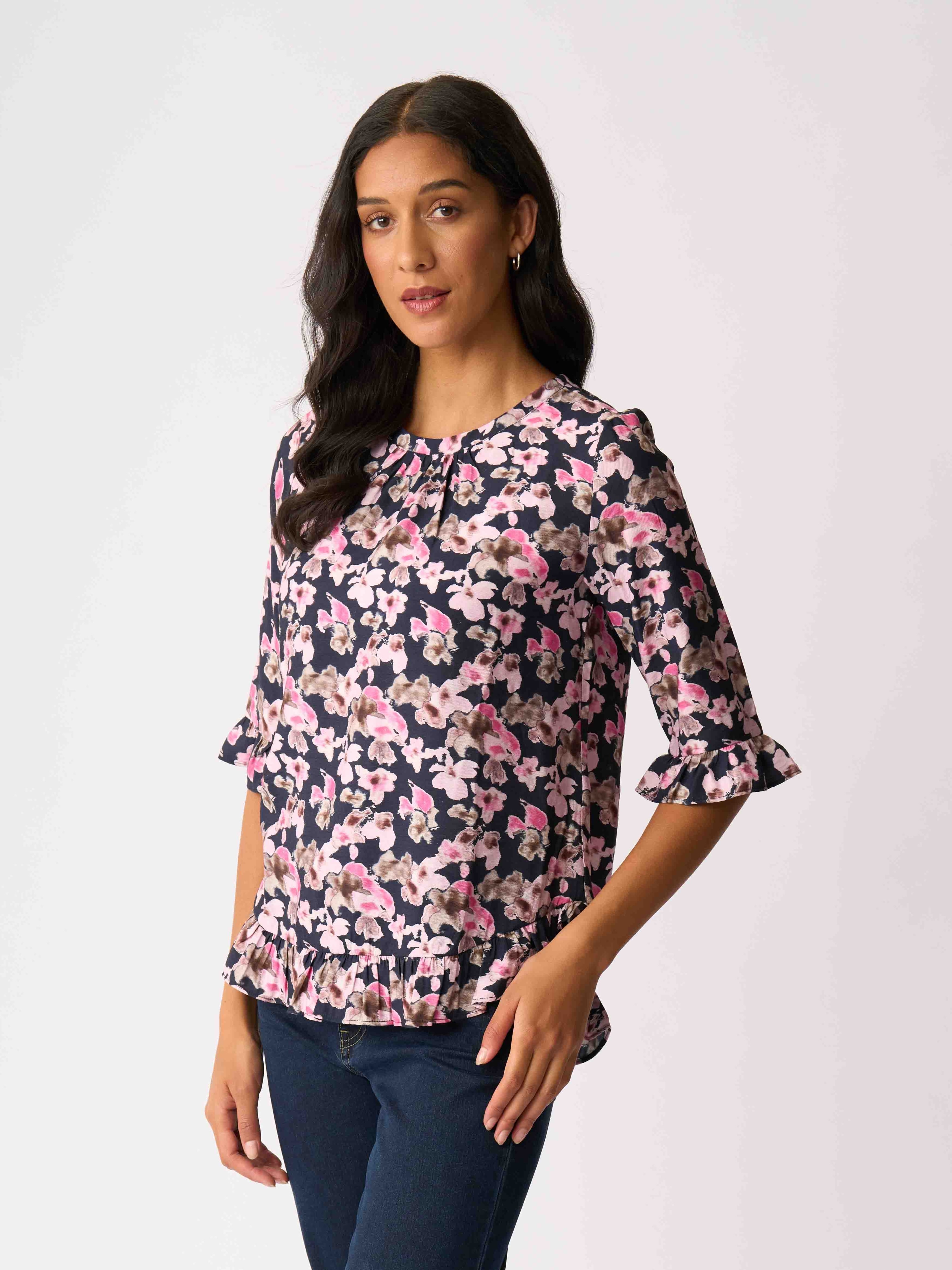 - This top has ruffles at the cuffs and hem with a scoop neckline and 3/4 sleeves.