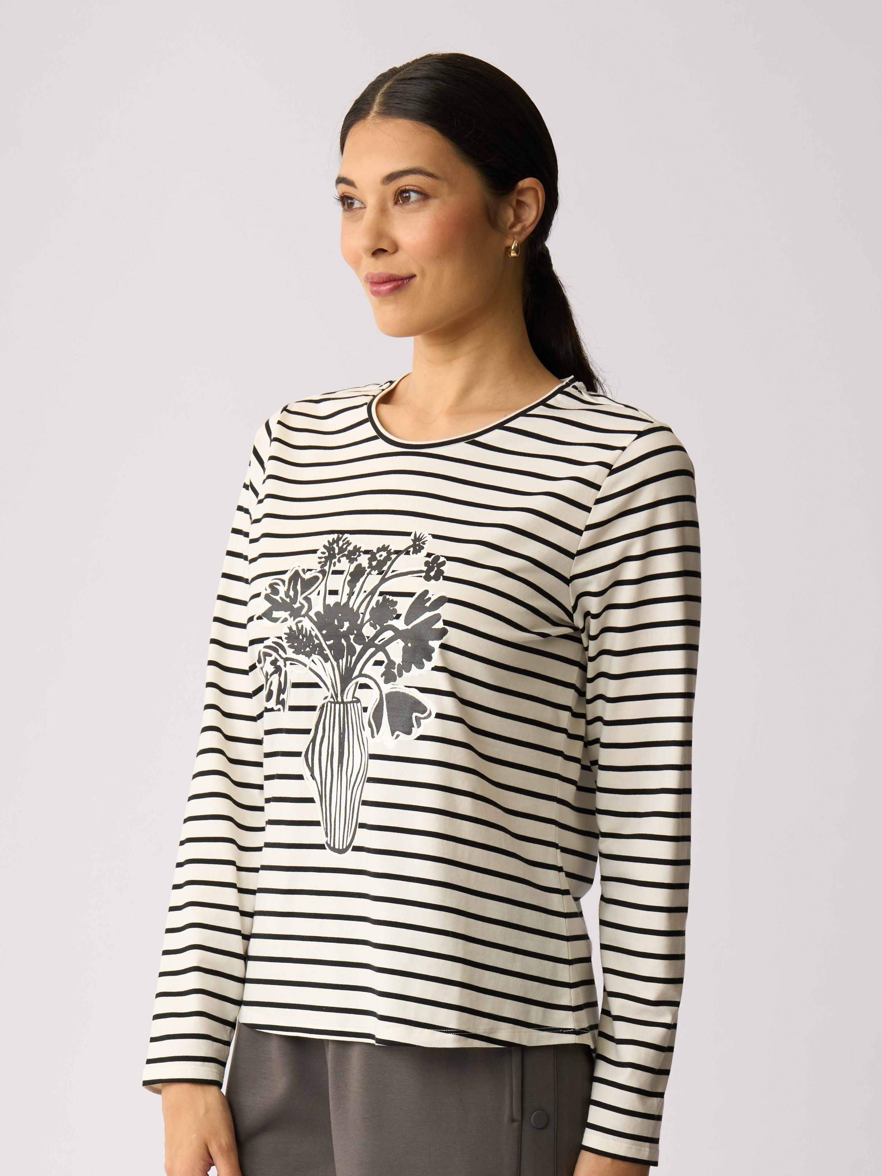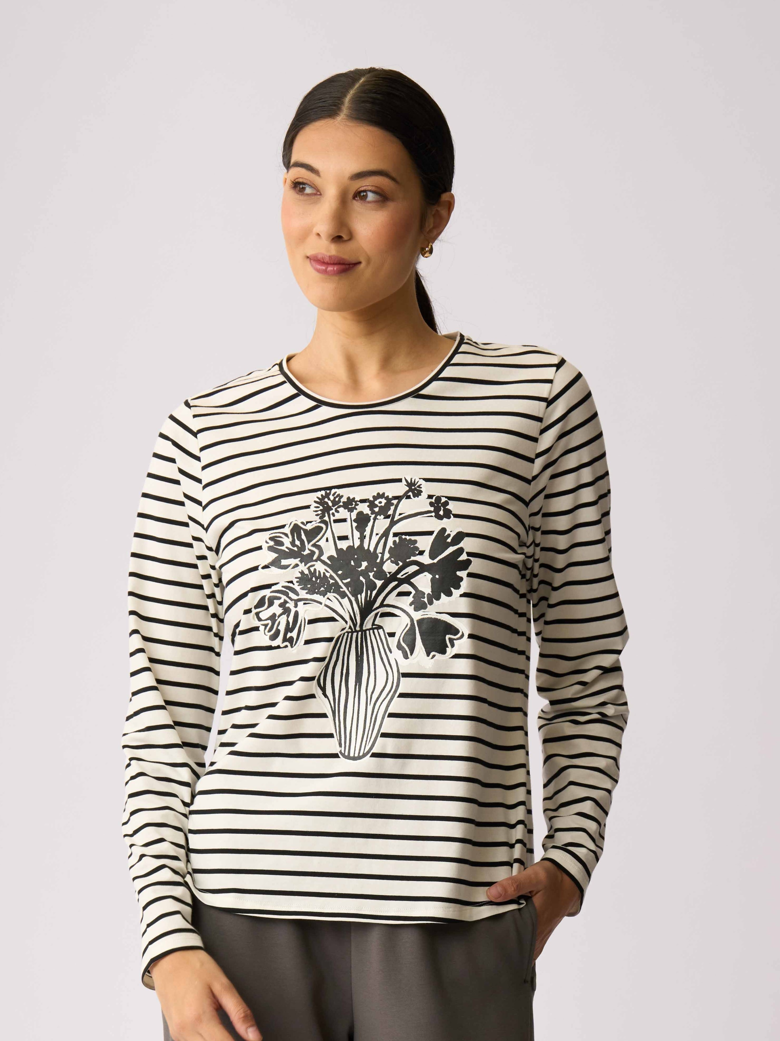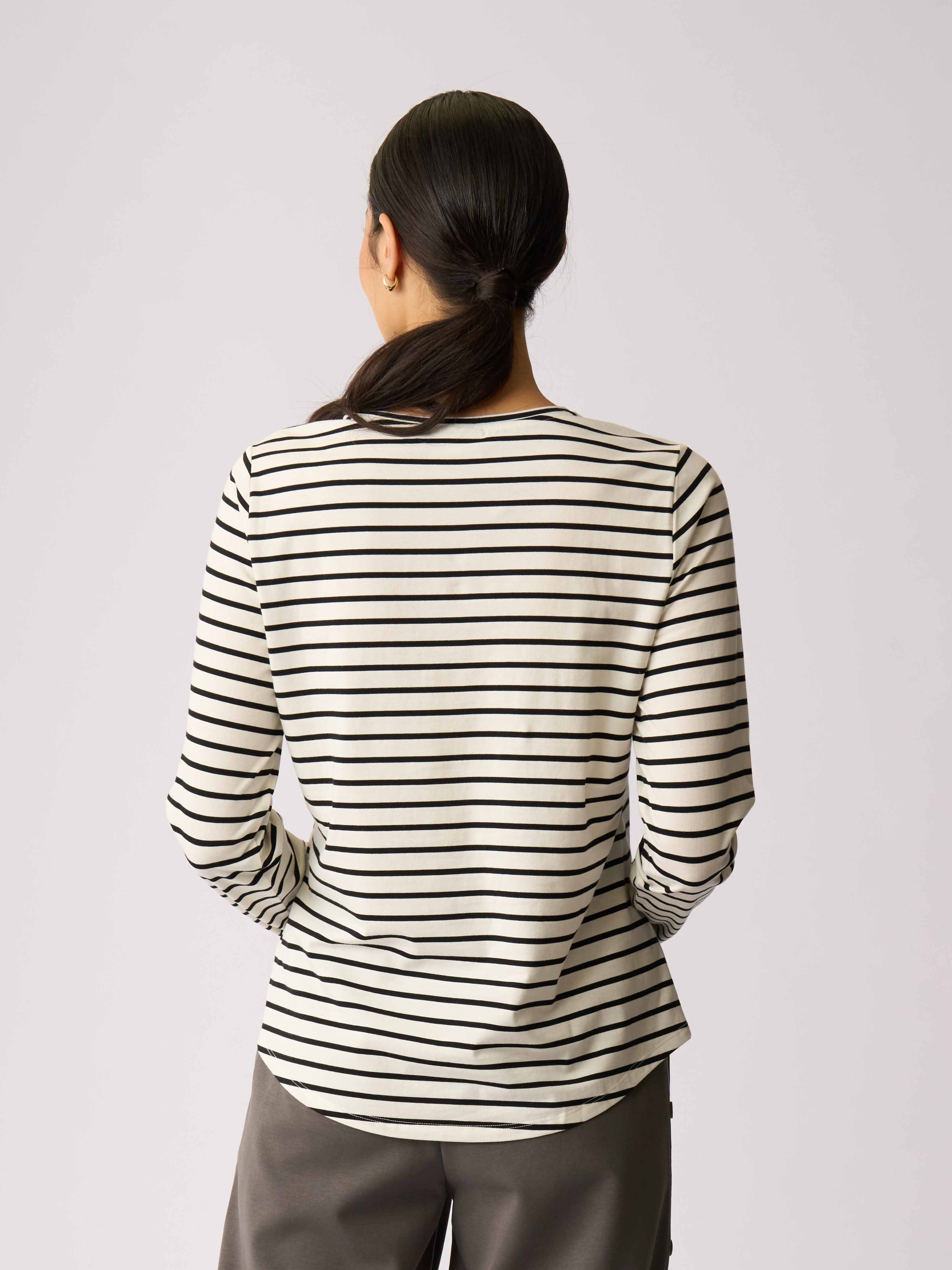 - This t-shirt has full-length sleeves, a scoop neckline and a curved hem.