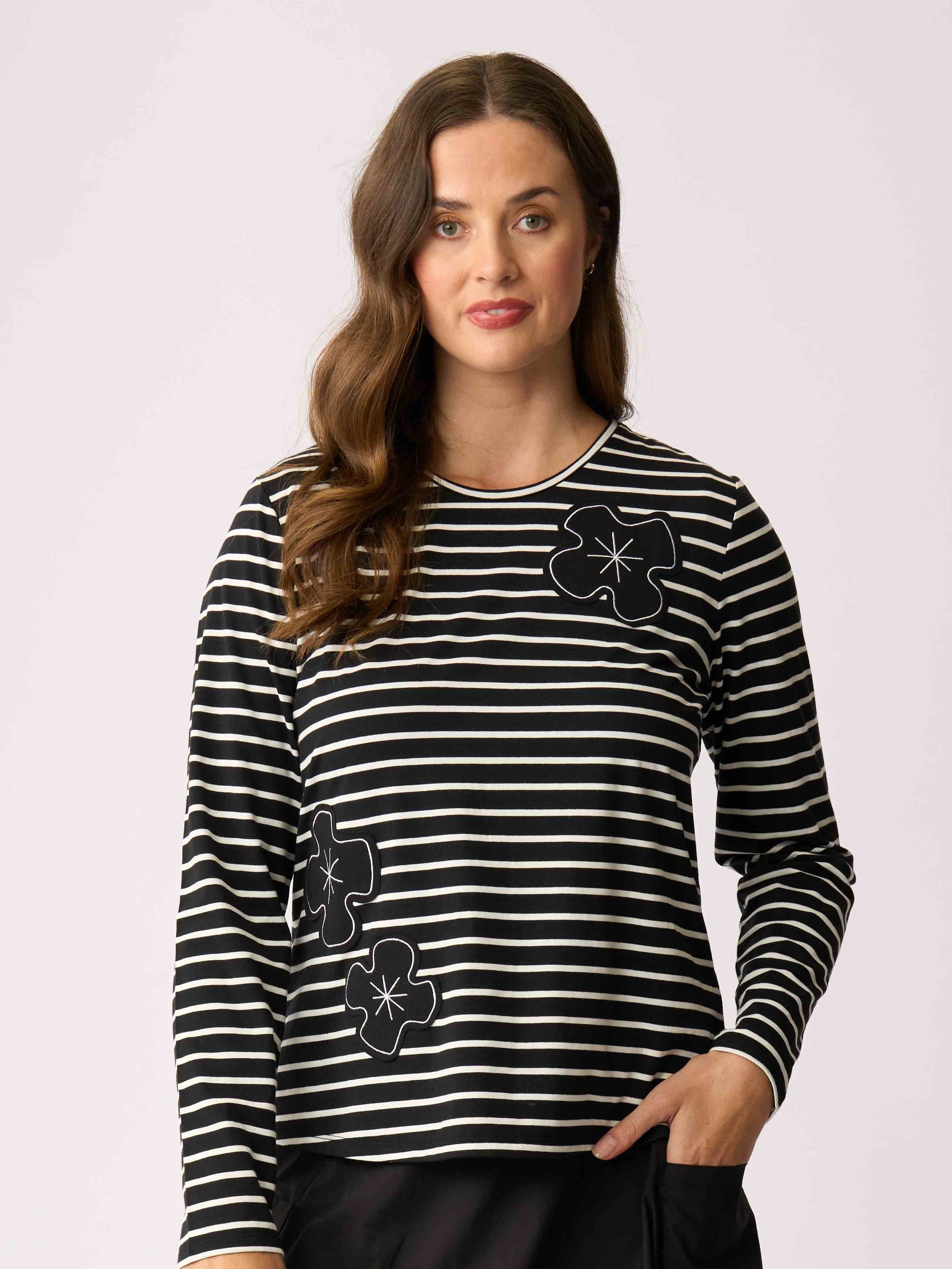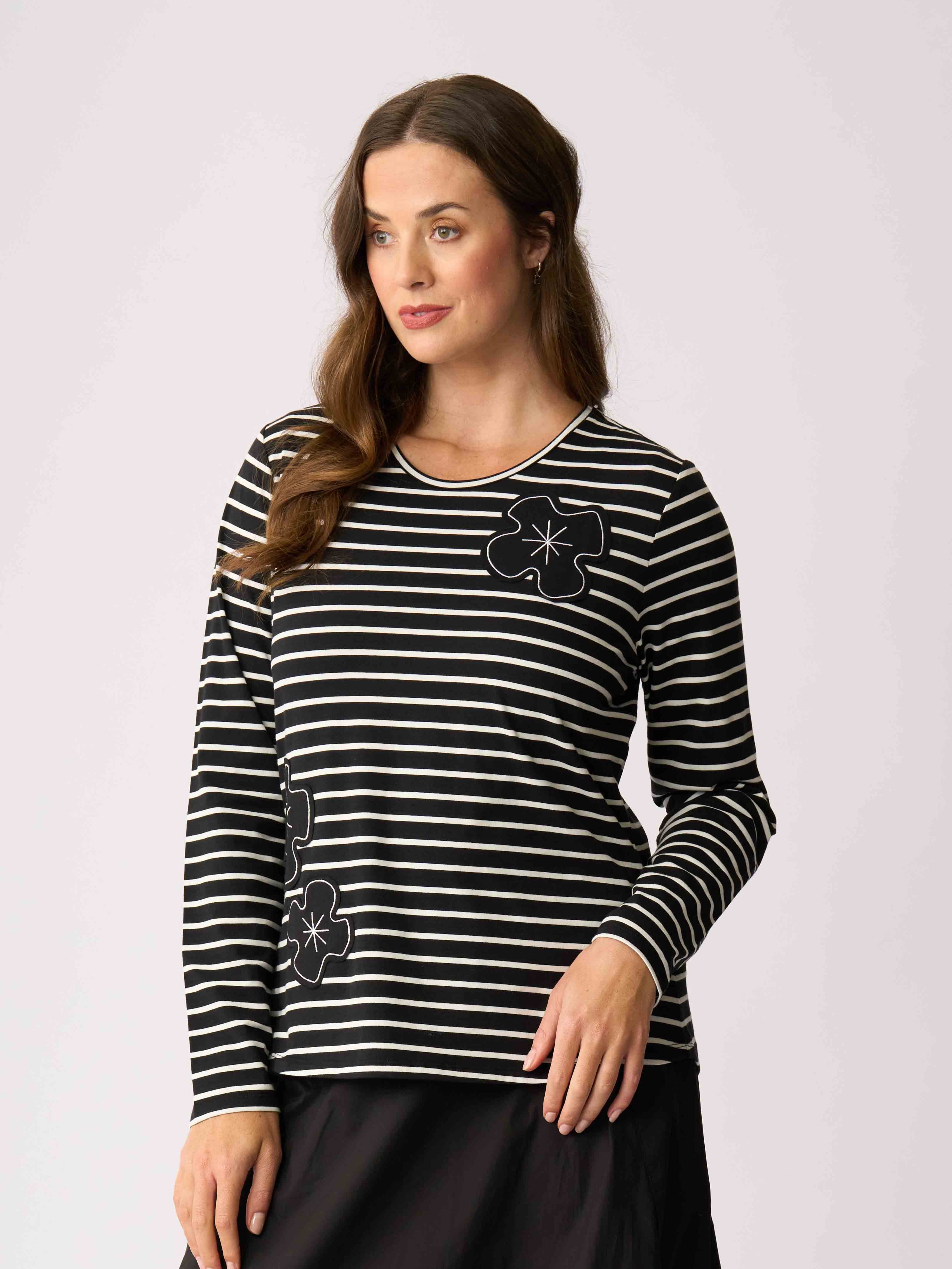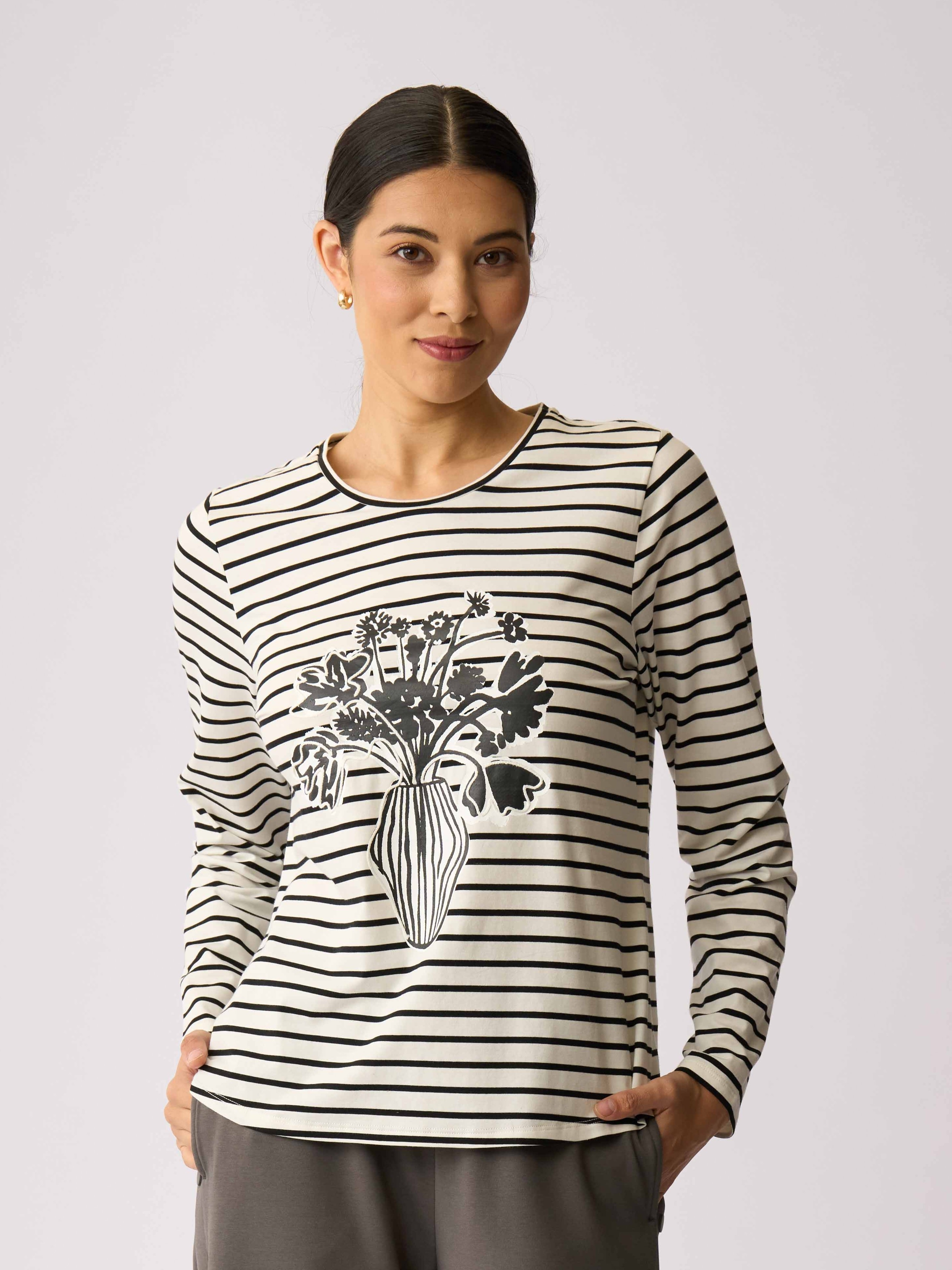 - This t-shirt has full-length sleeves, a scoop neckline and a curved hem.