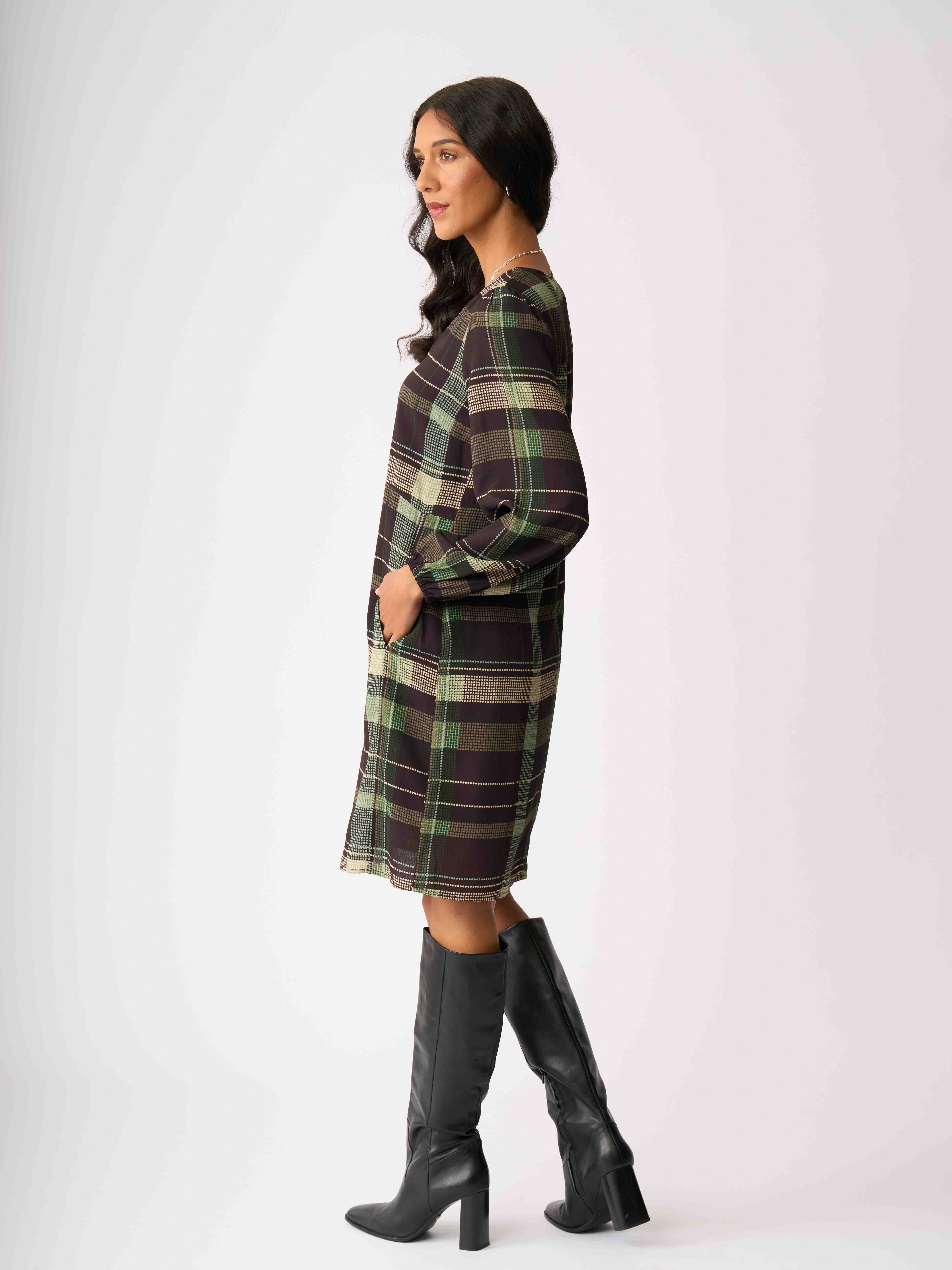 - Empire line dress with slight gather at the neck.