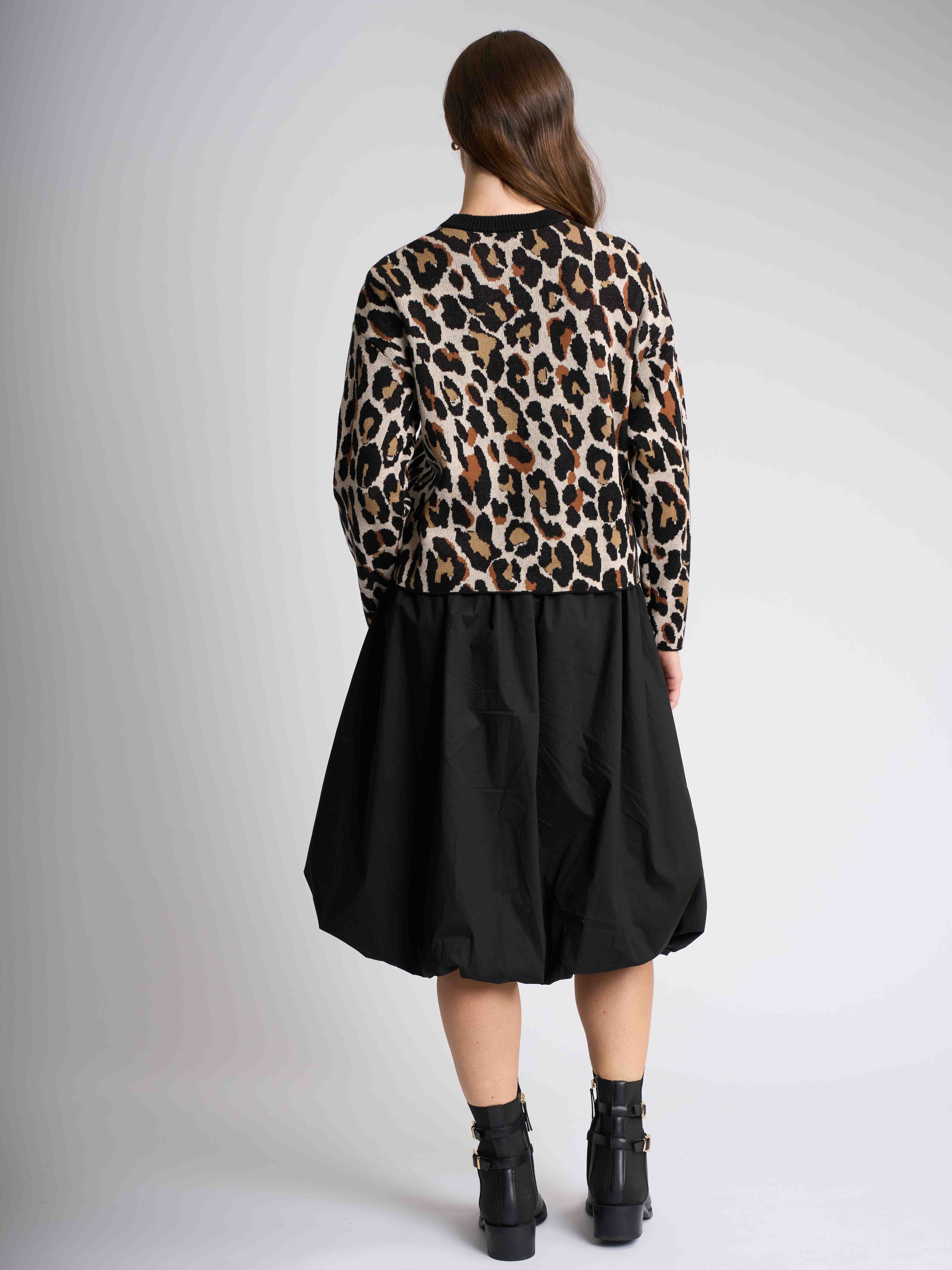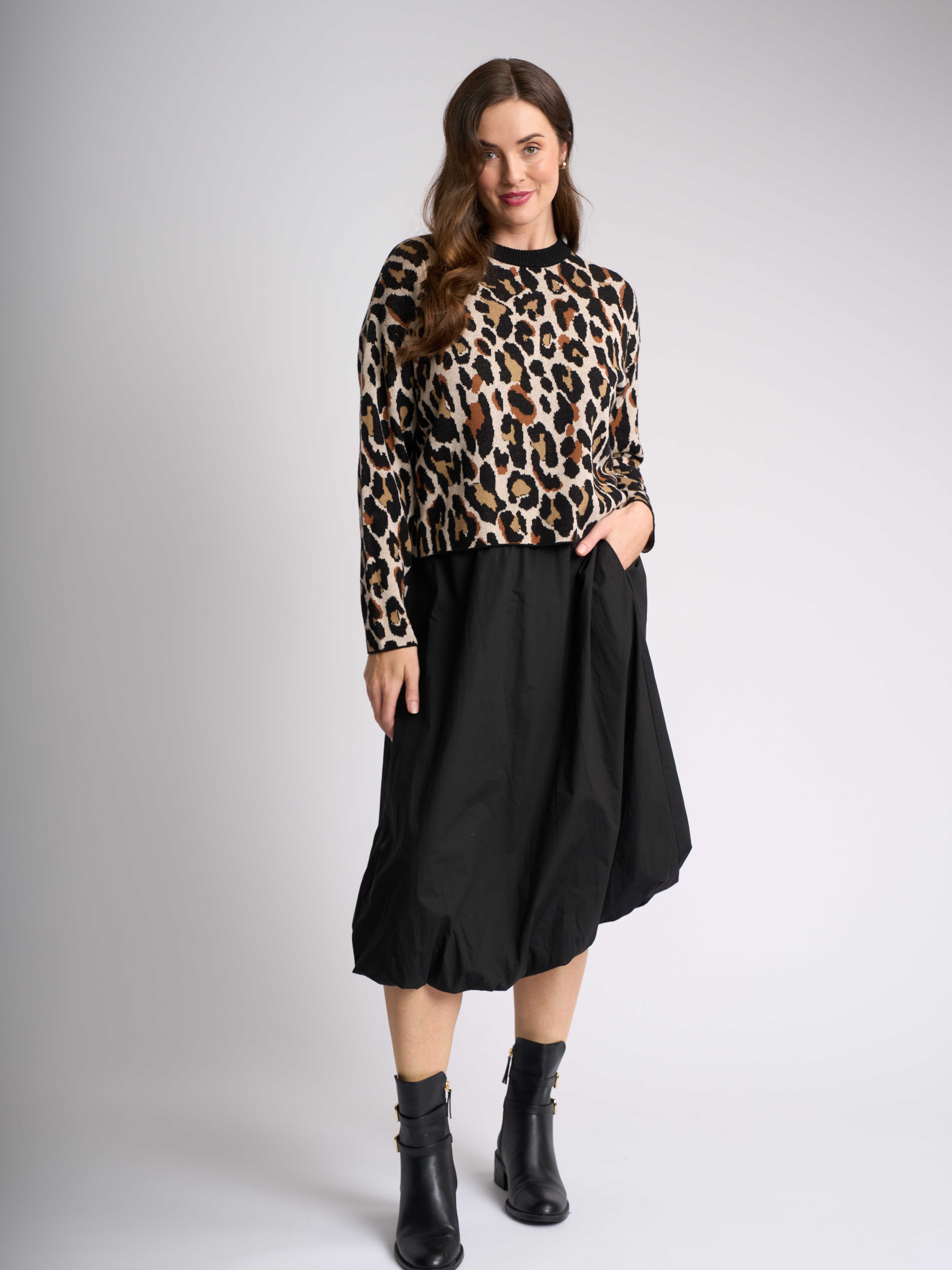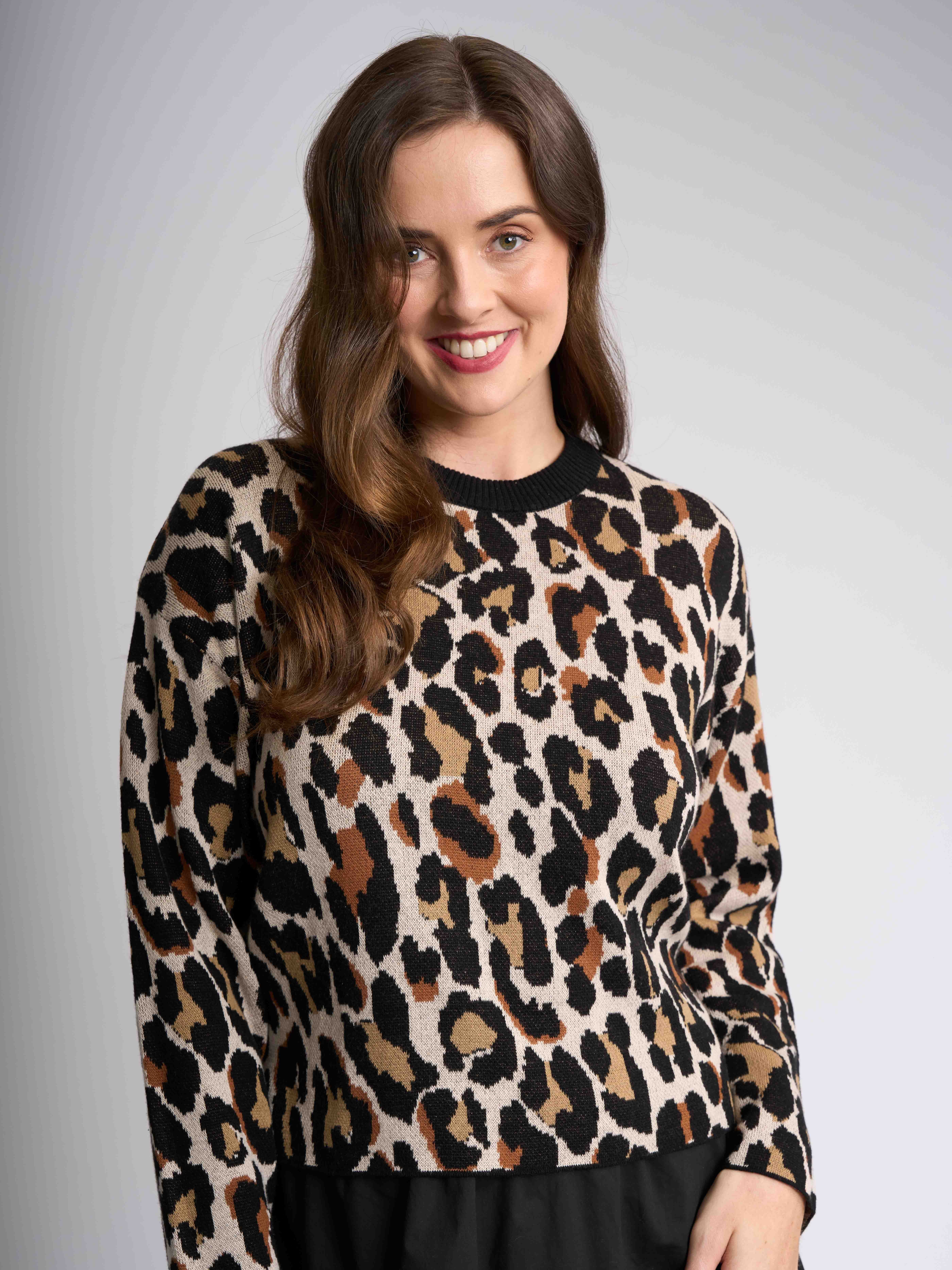 Our chic animal print jumper, designed to make a bold statement while ensuring comfort. Featuring a solid colour rib neckband, this stylish piece offers a flattering fit with a body length of approximately 51.5cm from shoulder to hem (size small). Perfect for layering or wearing solo, this jumper effortlessly combines fashion and versatility, making it a must-have addition to your collection.