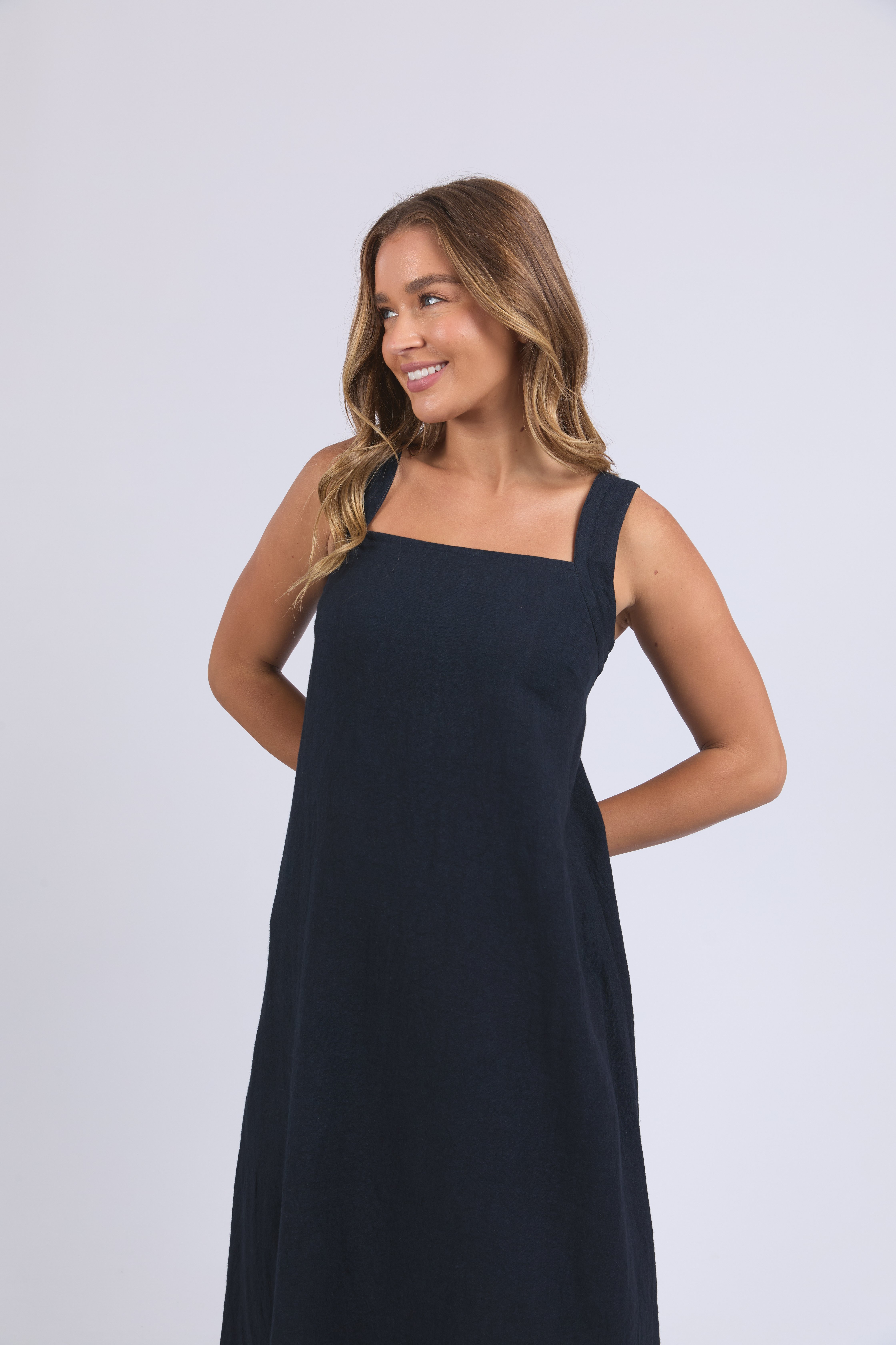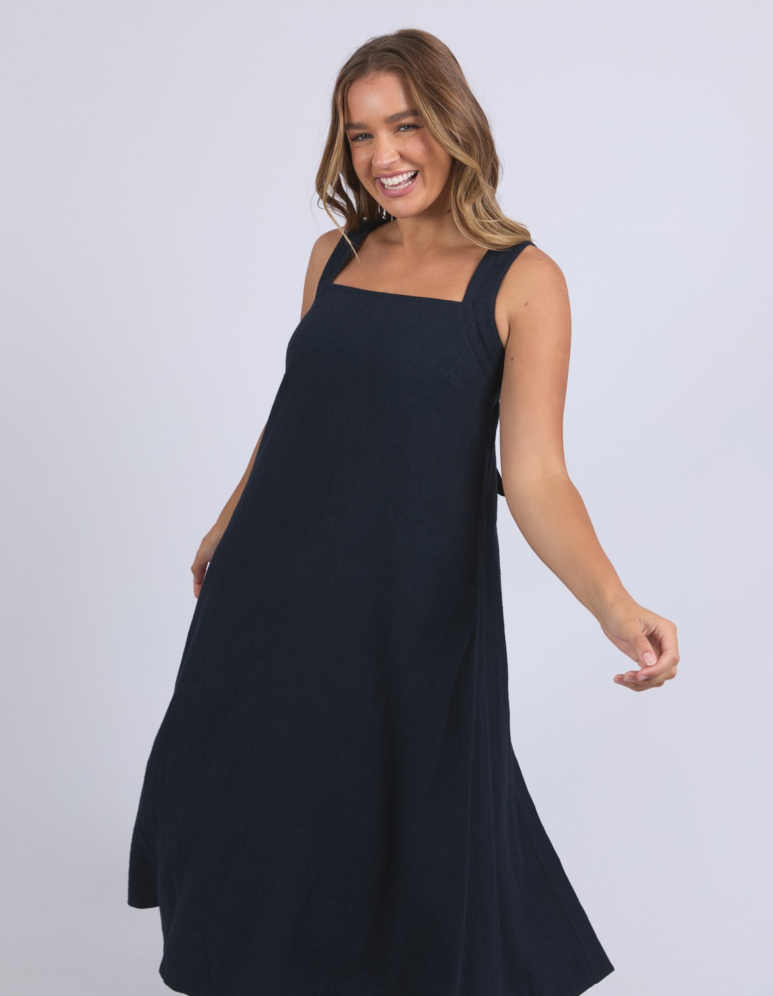 Easygoing with a playful twist. The Lourdes Dress features a relaxed fit with an open back, layered underlay, and a sweet back tie detail that brings the charm. Light, floaty and full of personality—this one’s made for warm days and fun plans.