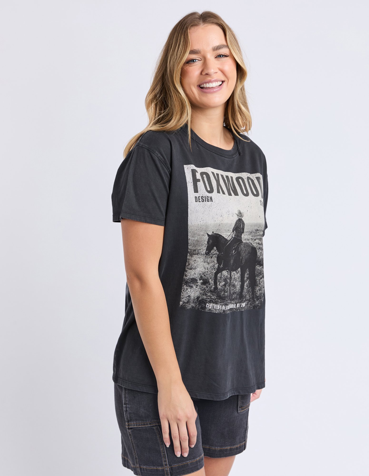 Saddle up in the Rodeo Tee - a playful nod to Western charm! Featuring Foxwood’s exclusive cowboy print and a vintage wash, this soft cotton tee is made for easy days and a little yeehaw energy. Pair it with denim for a laid-back, rodeo-ready look.