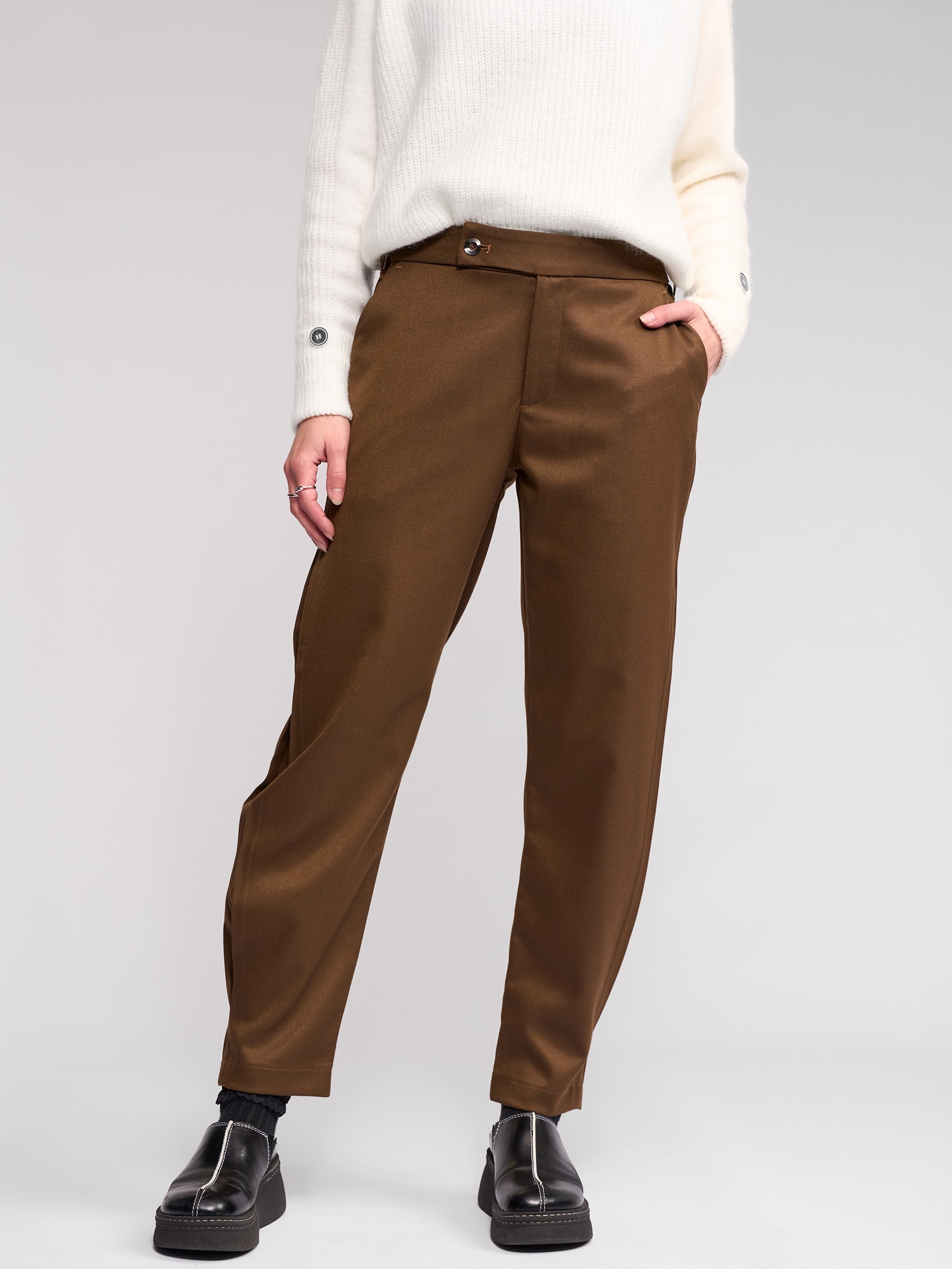 Relaxed-leg ankle-grazer pant in Cedar, a golden-brown colour. Designed with an inverted pleat running along the side seams, this style features an off-centre waistband closure with a buttoned tab, creating a clean, modern finish.