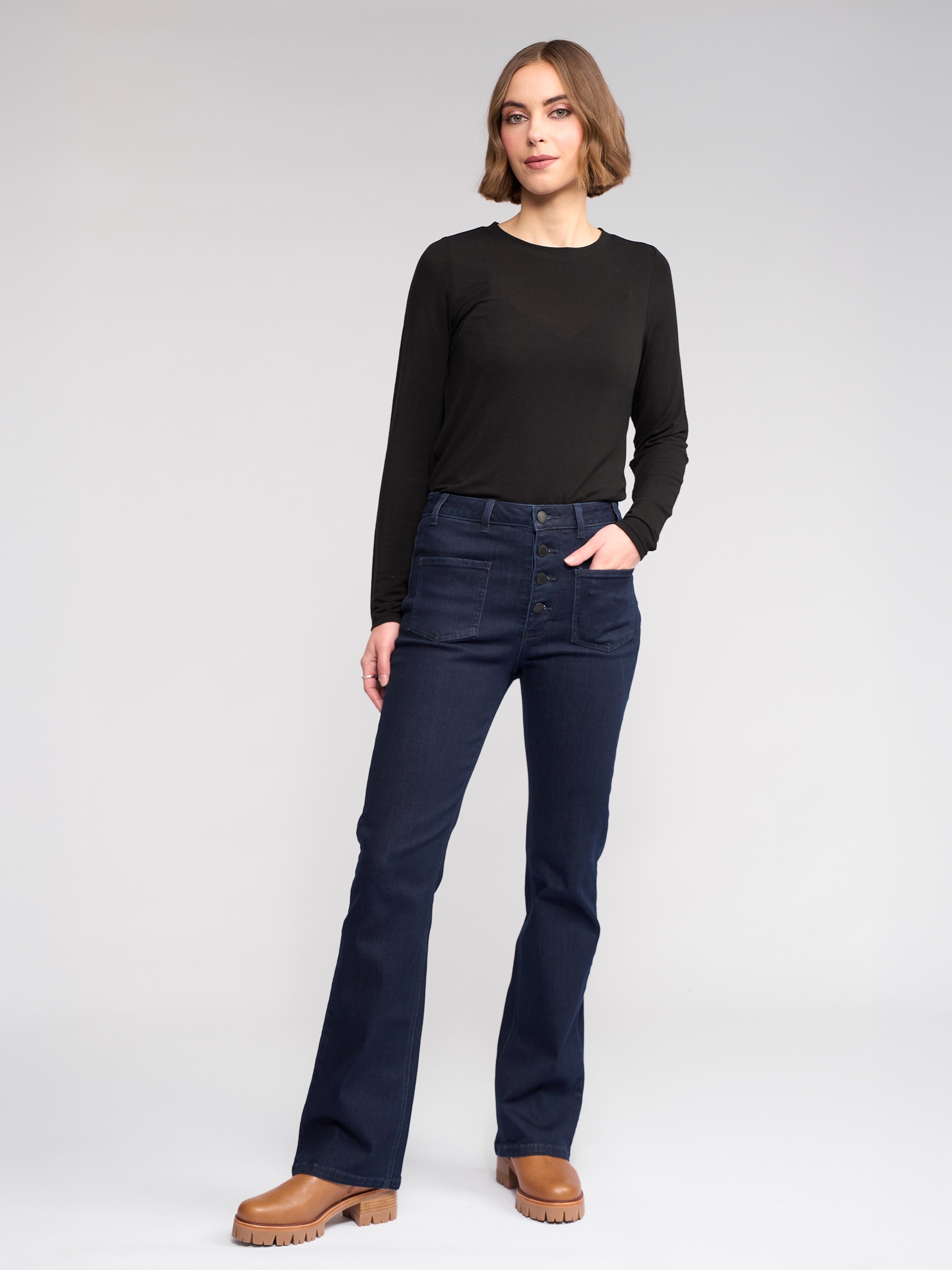 Full-length bootcut jean in Ink Denim, a dark blue wash. Cut from stretch denim for a comfortable, flattering fit.