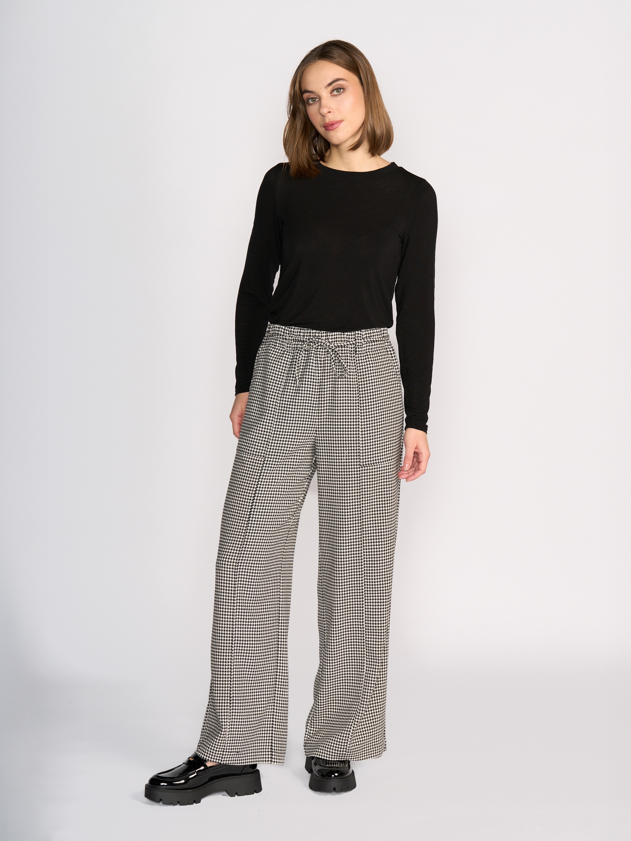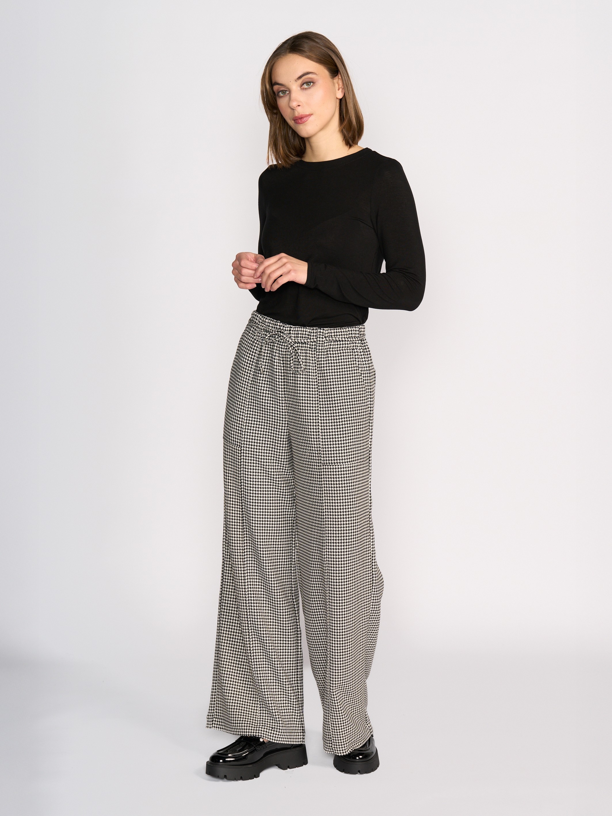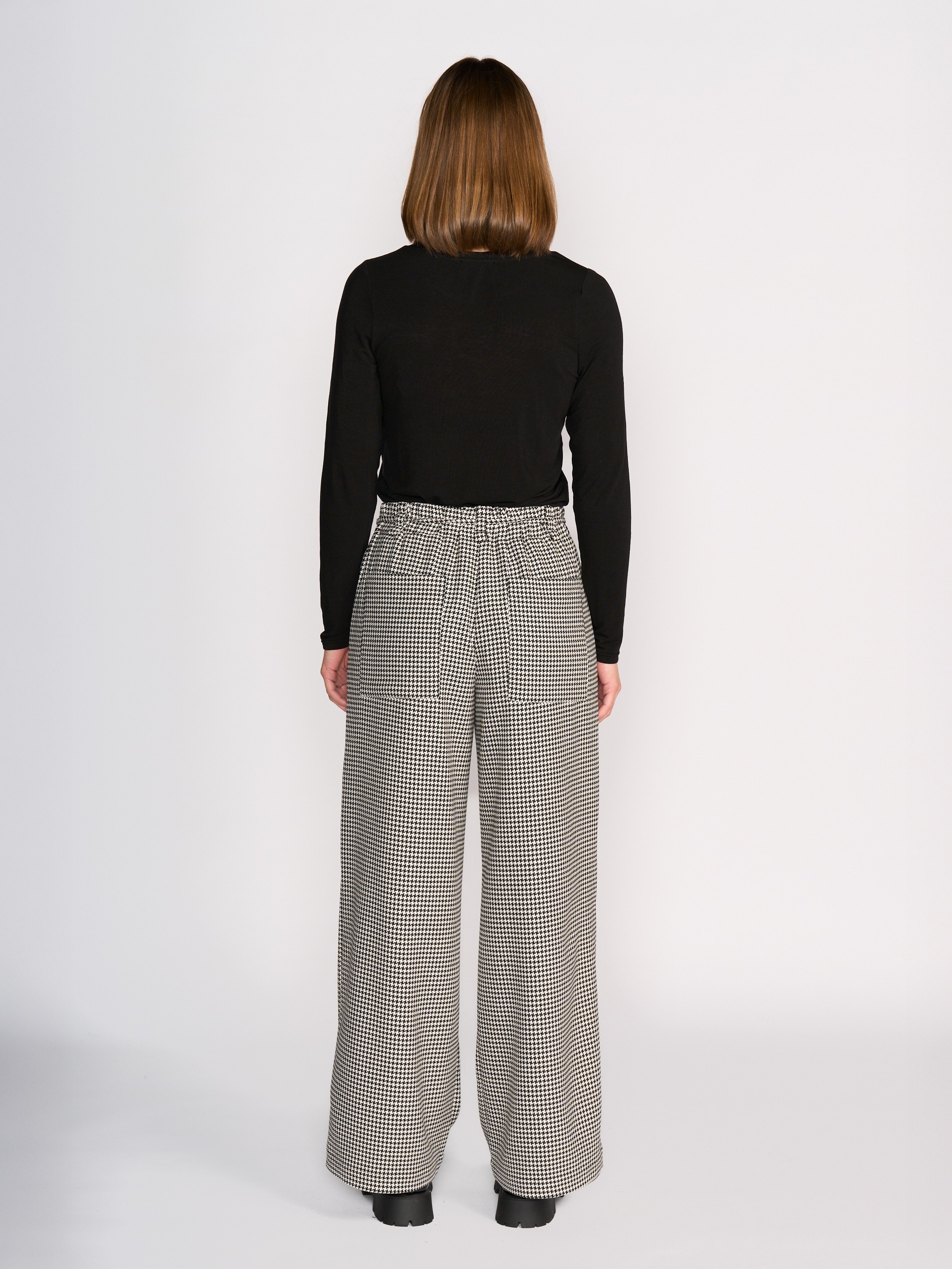 Full-length wide-leg pant in our Summit print — a classic black and white houndstooth. Designed with a drapey fit, this pull-on style features an elasticated waistband and a slim self-tie belt.