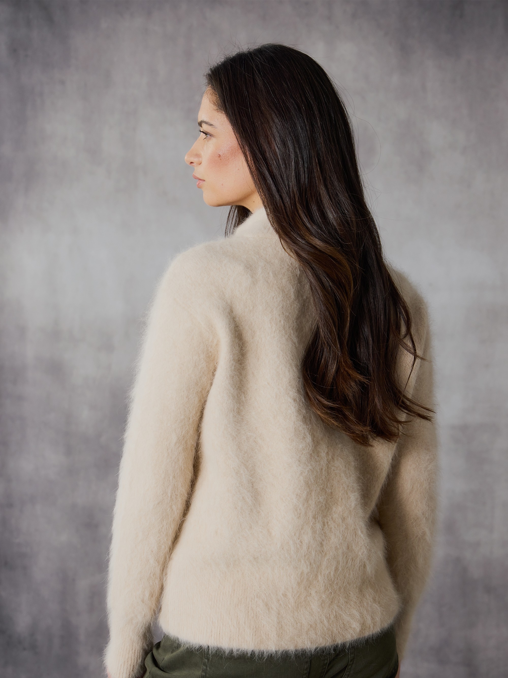 The Rogue Jacket is a luxuriously soft Angora blend knit Cardi, designed with high neck collar, internal pockets and centre front zip closure. Perfect for layering over dresses or pairing with jeans, this versatile piece adds warmth and elegance, making it an essential addition to your winter wardrobe.