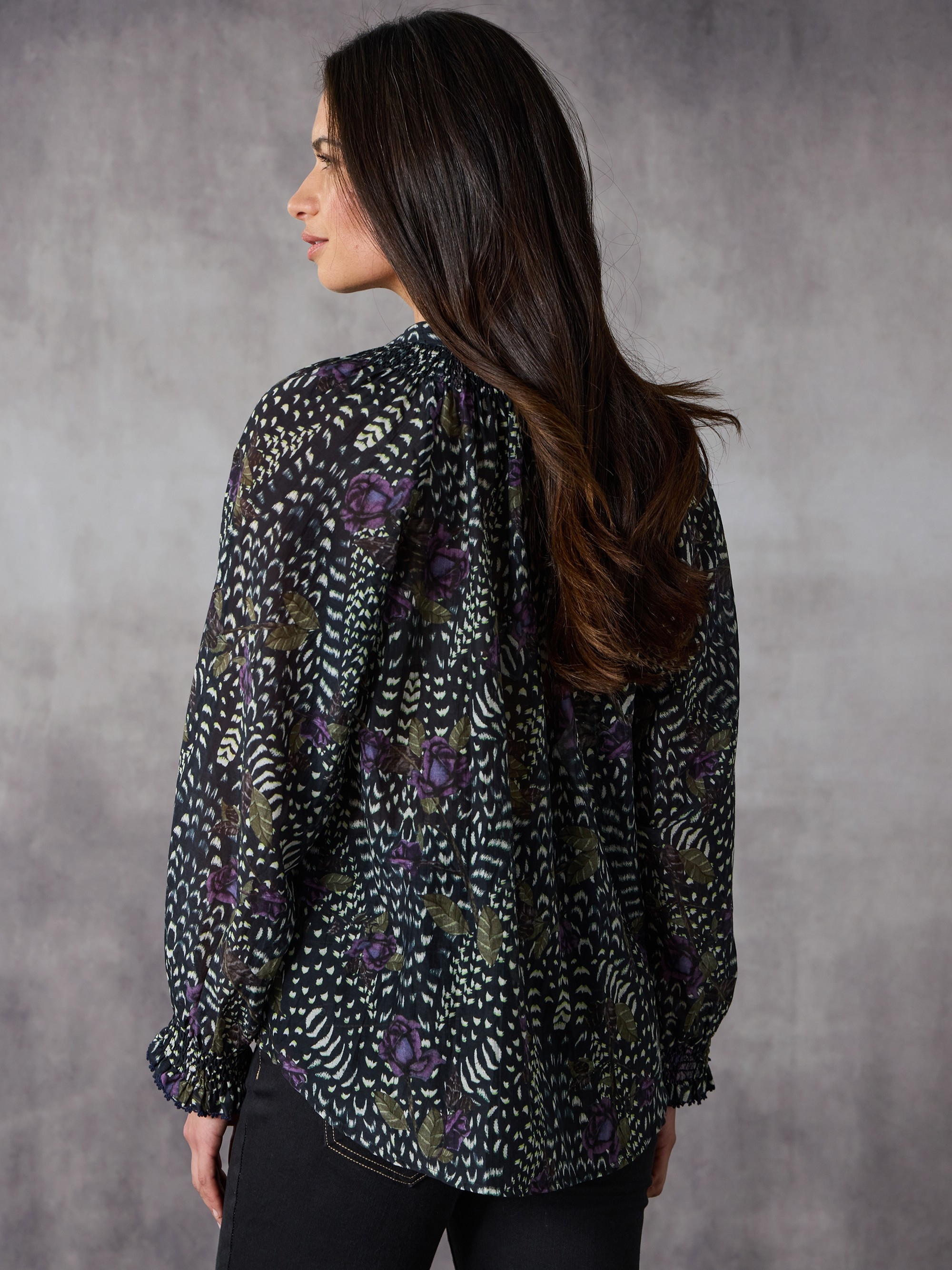 Embrace laid-back elegance with the Santiago Shirt, a relaxed fit floral printed Silk Cotton featuring button-though shirt with tonal dome glass butons, shirred neckline, and contrast embroidery detailing on the shirred cuff. The detailing adds a feminine touch as well as allowing the print standout.