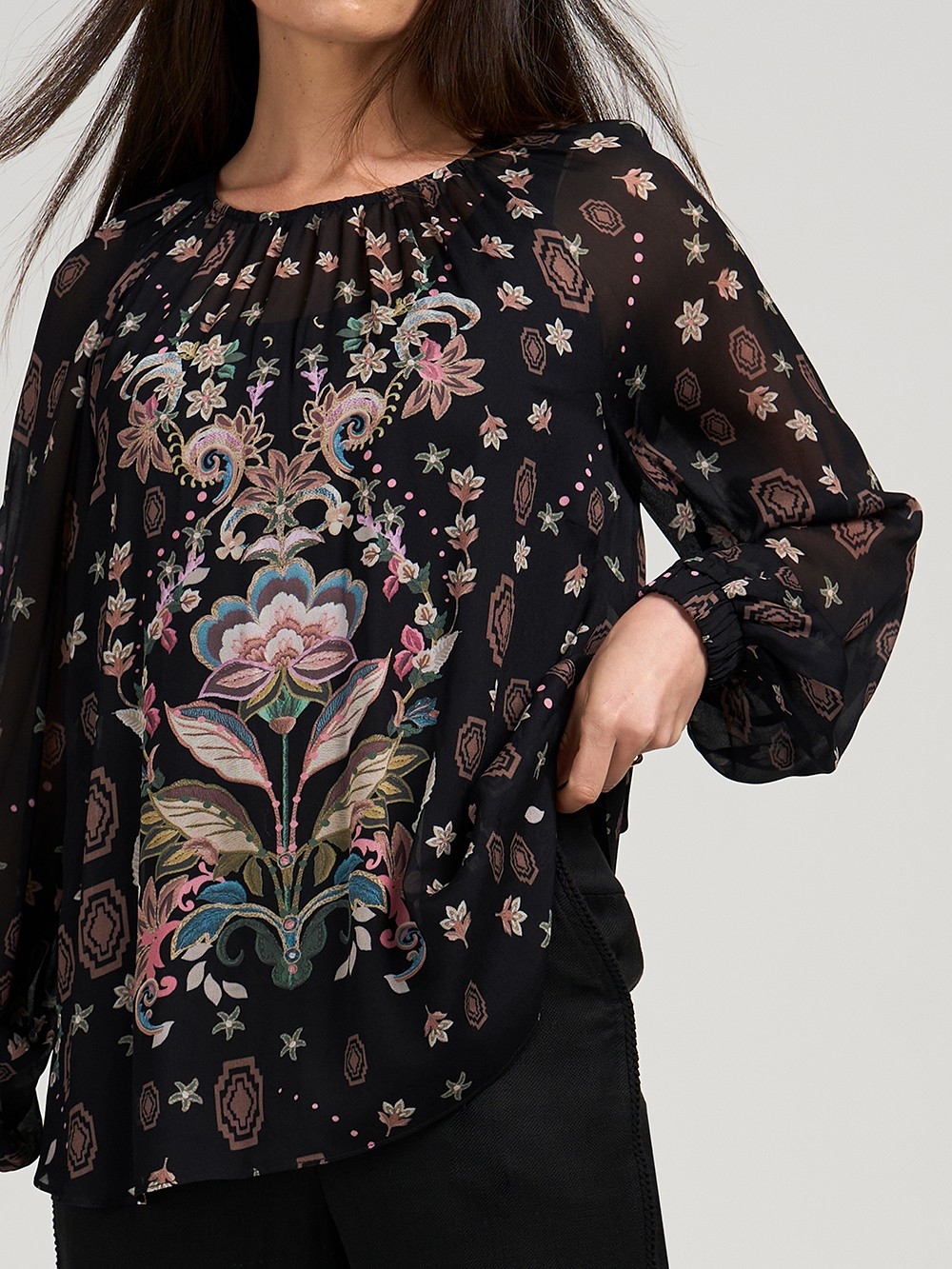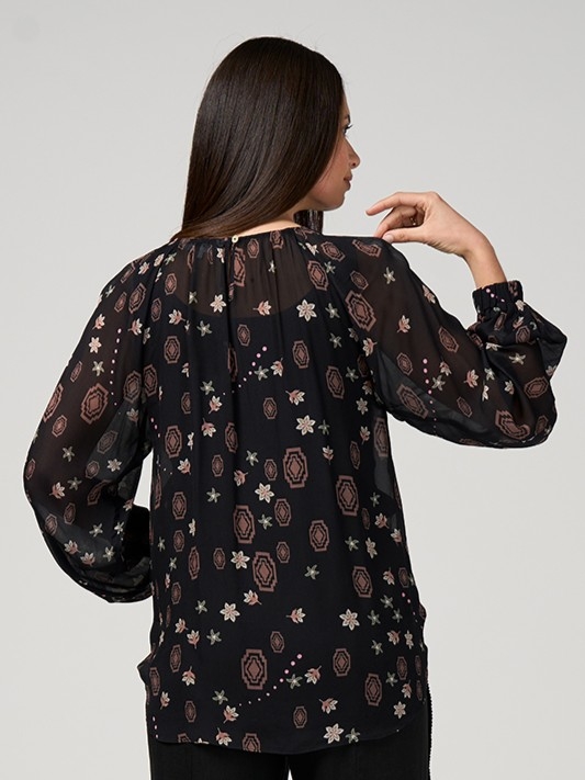 Floaty sheer blouse featuring a round neckline, with blouson sleeves with elastic cuffs. Comes with colour-matched A-line cami.
