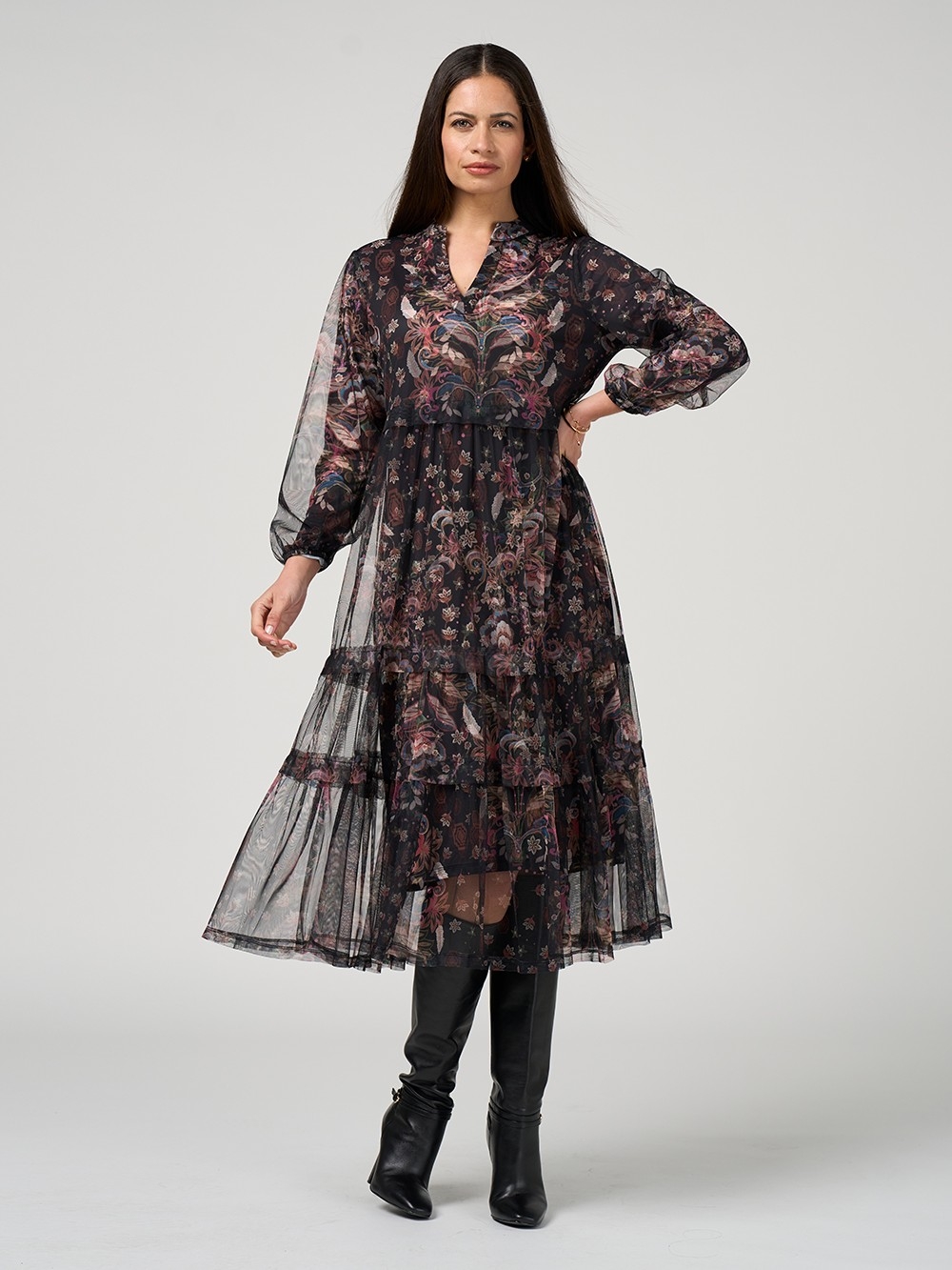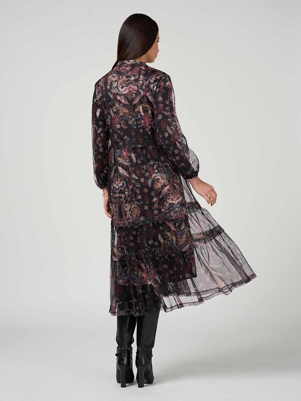 Printed tulle midi dress with a matching printed stretch lining, and a collared V-neckline. Featuring tucked tier seams, and blouson sleeves caught into the fitted sleeve lining, with elasticated cuffs.