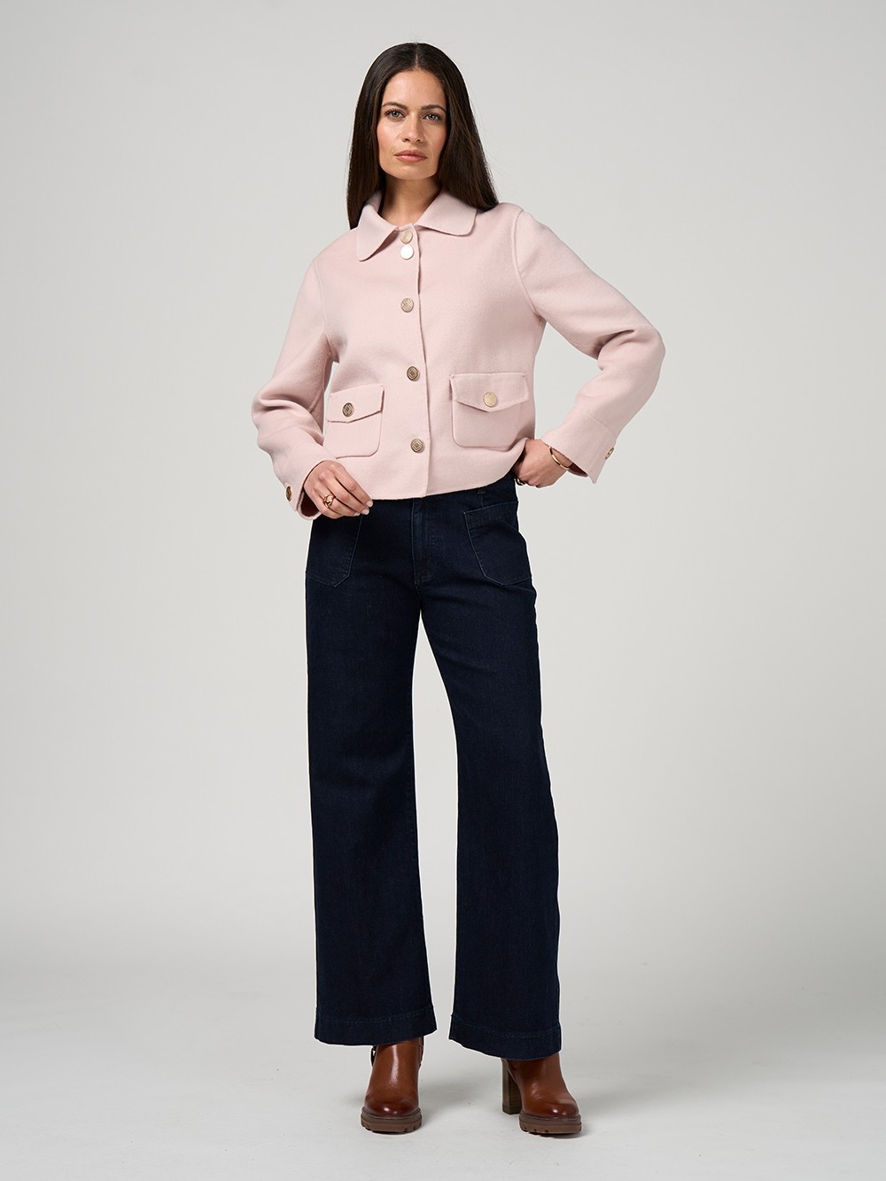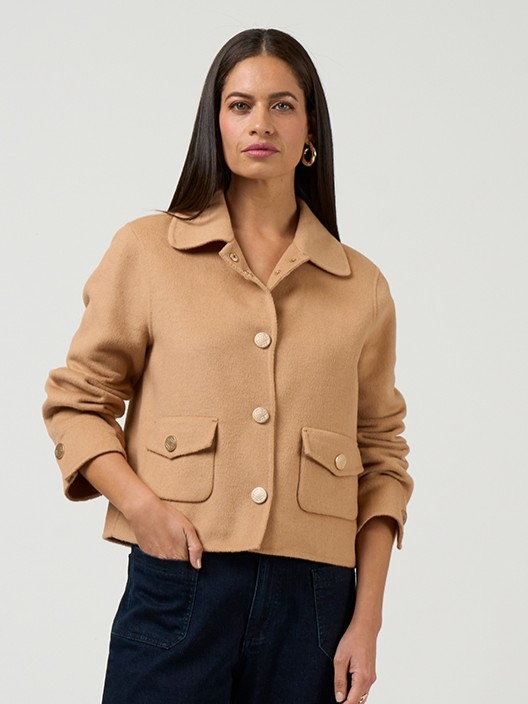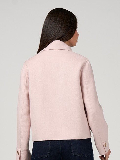 Cropped melton wool blend jacket featuring a modern collar with patch pockets, finished with custom matte soft gold dome buttons engraved with a Loobies design.