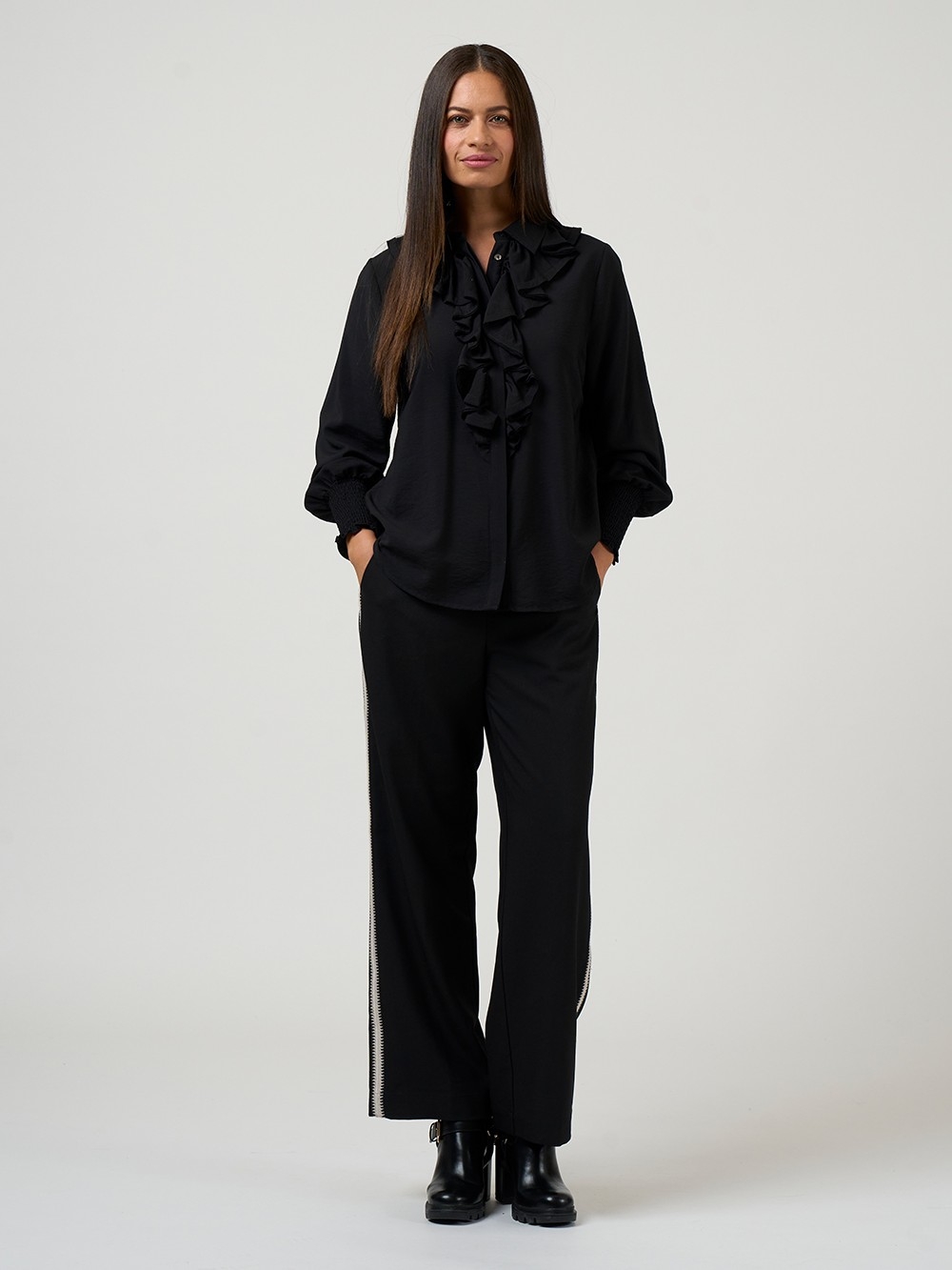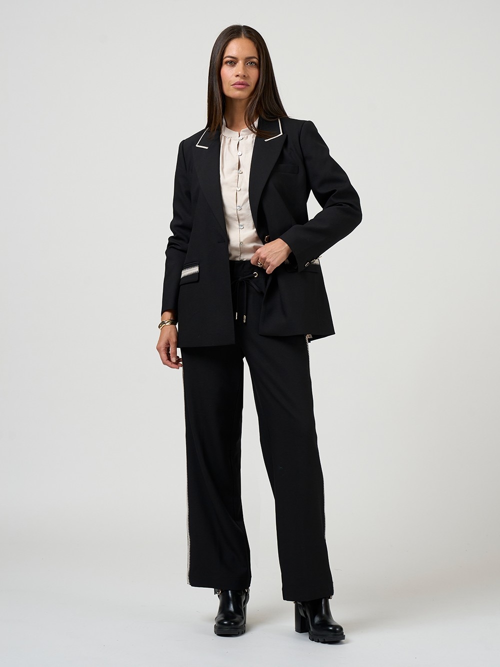 Mid-rise straight-leg pant with a drawcord waist, elasticated back, and a functional fly. Bold contrast embroidery detail along the side seams, with functional front side pockets.