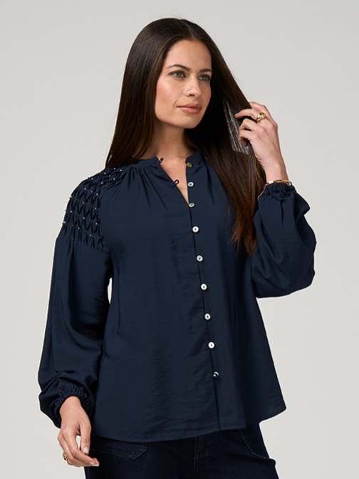 Floaty raglan blouse with a nehru collar and a button and loop closure. Featuring a smocked upper sleeve panel with delicately embellished metallic beads, with elasticated cuffs.