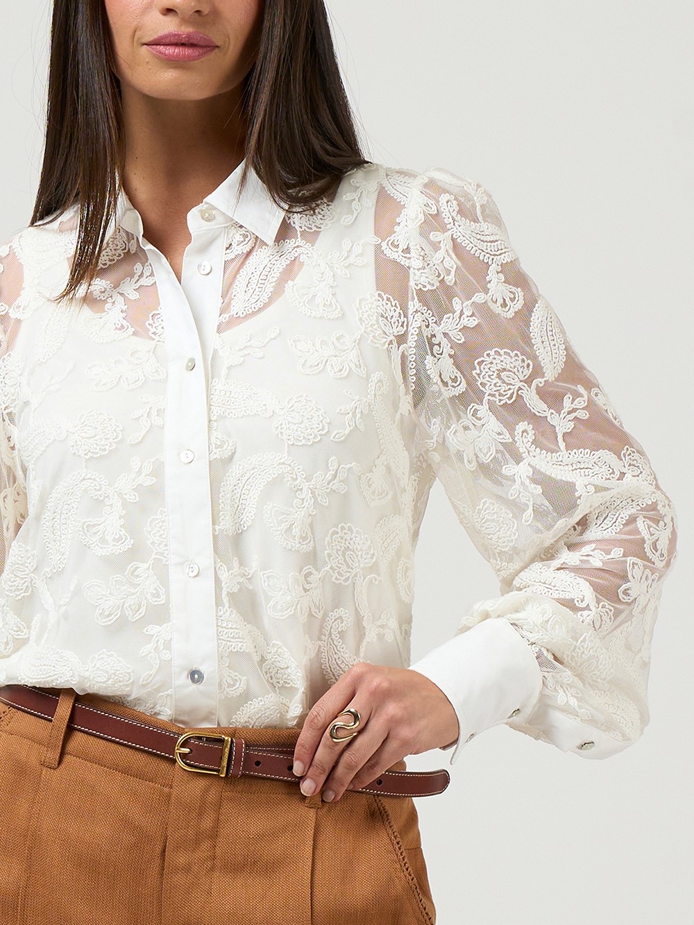 Embroidered tulle shirt with a crisp cotton sateen collar, button placket, and deep cuffs. The embroidery is placed to stop short of the hem, creating a subtle border. Comes with colour-matched A-line cami.