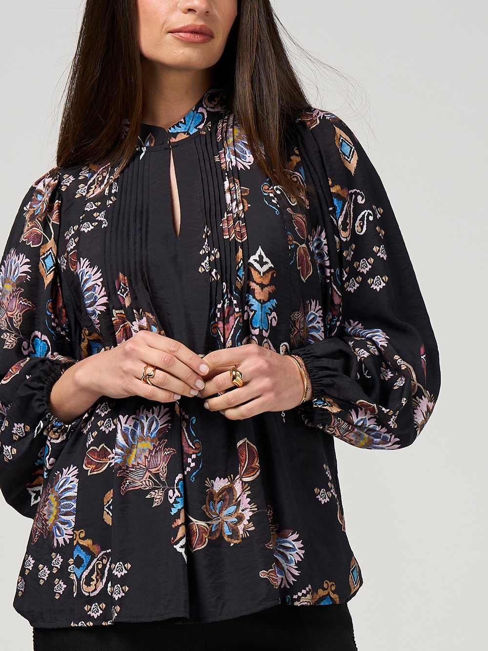 Floaty feminine blouse featuring a keyhole neckline with a hook-and-eye closure, featuring delicate front pintucks, and narrow elasticated cuffs for a soft, elegant finish.