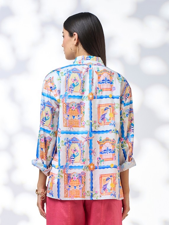 Printed lightweight, button through cotton shirt with a flattering collared neckline opening in a V neck. Featuring softly gathered sleeves and side splits.