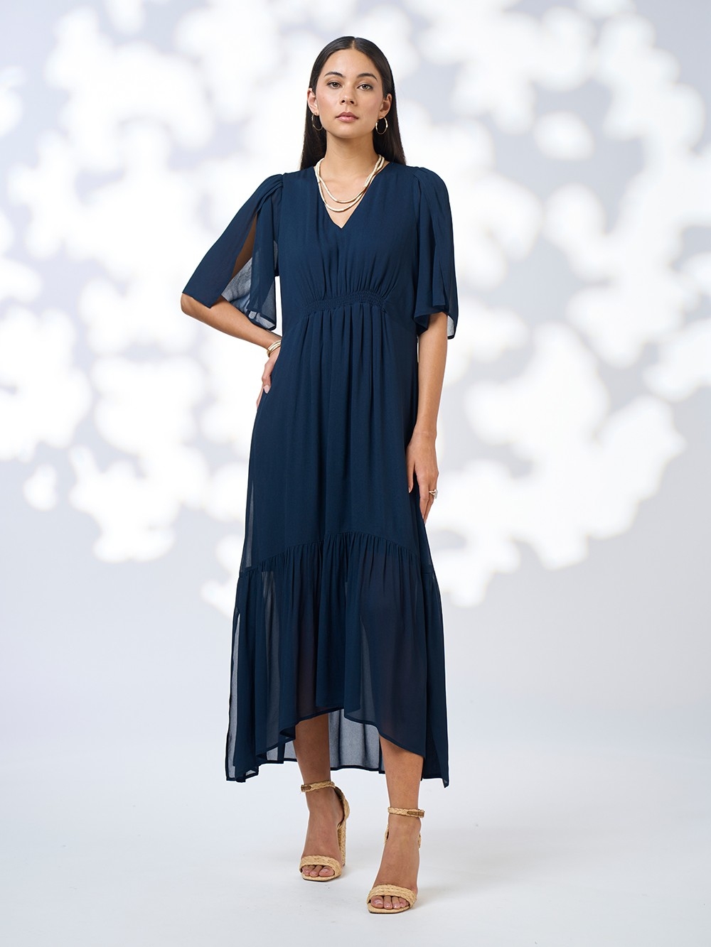 Floaty dress with a flattering V-neckline and shirred waist panels. Featuring delicate petal wrap sleeves and a high-low hem panel with side splits. Fully lined.