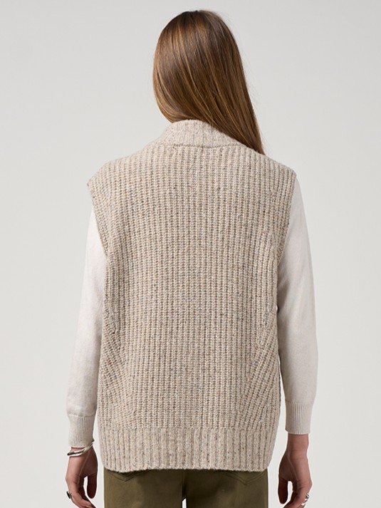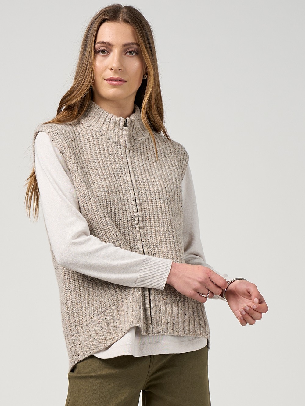 Relaxed fitting vest in a flecked lambswool yarn, with a zip front, featuring rib stitch design lines on the body and a rounded high-low hem.