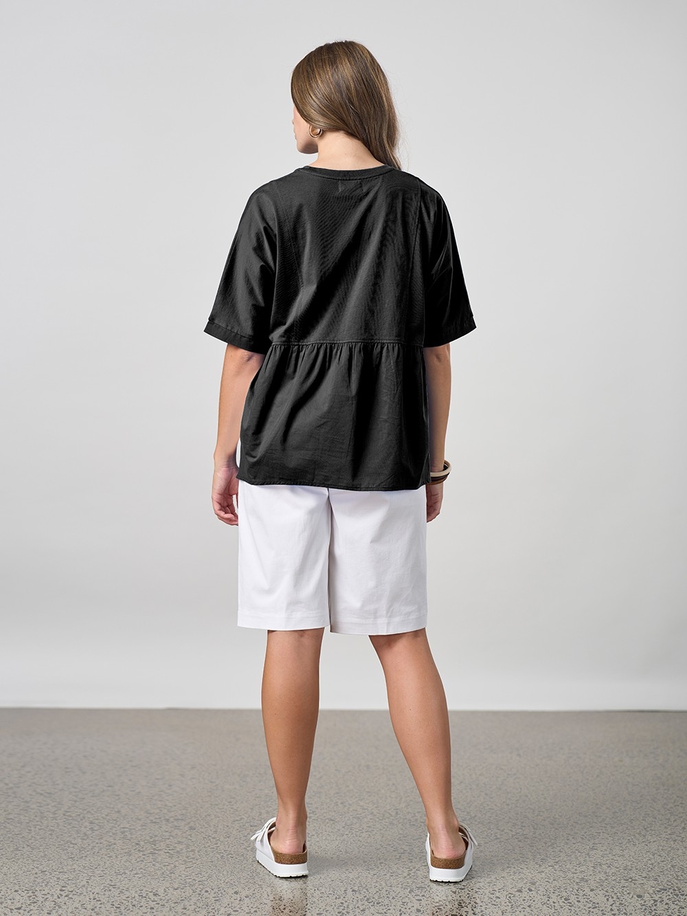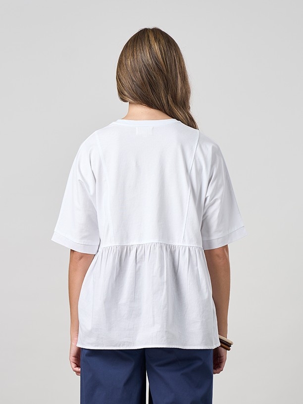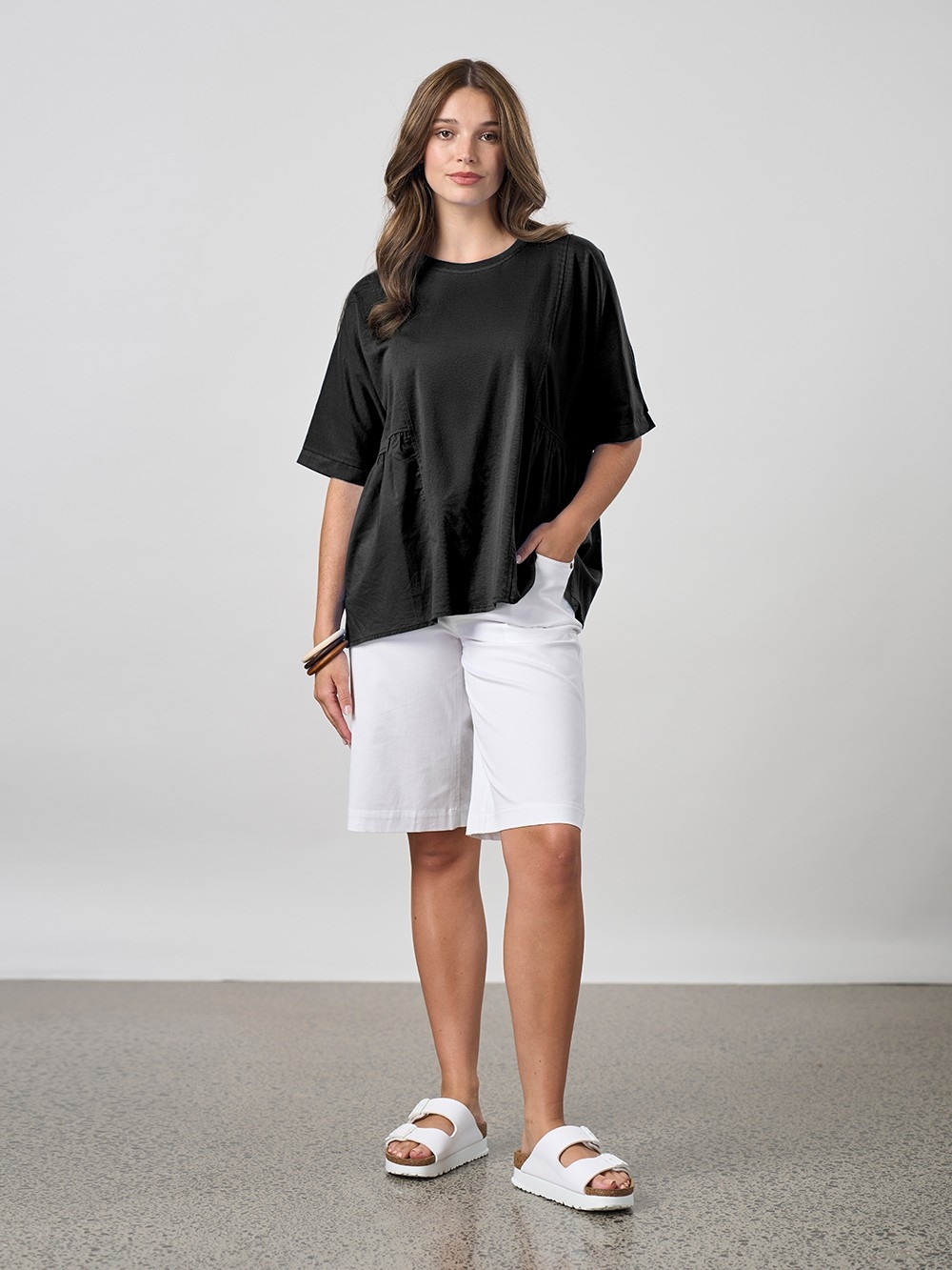 Soft cotton tee with a round neckline and grown on sleeves, featuring  panelling seams and contrast detailing.