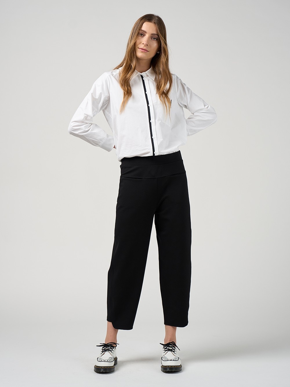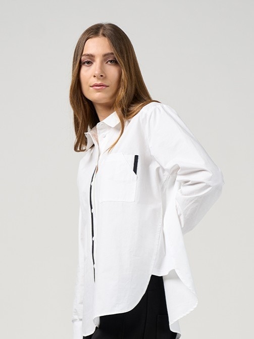 Button-through collared shirt with curved shirt tails, and ribbed cuffs, featuring contrast tape detail highlighting the front button stand and on the cut-away pocket detail.