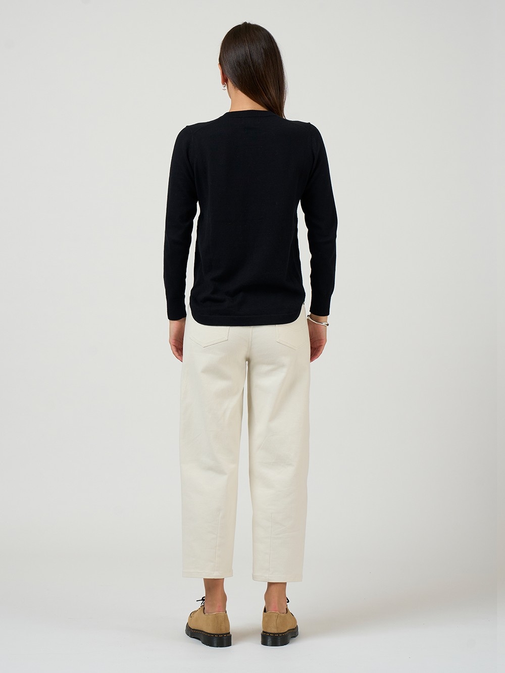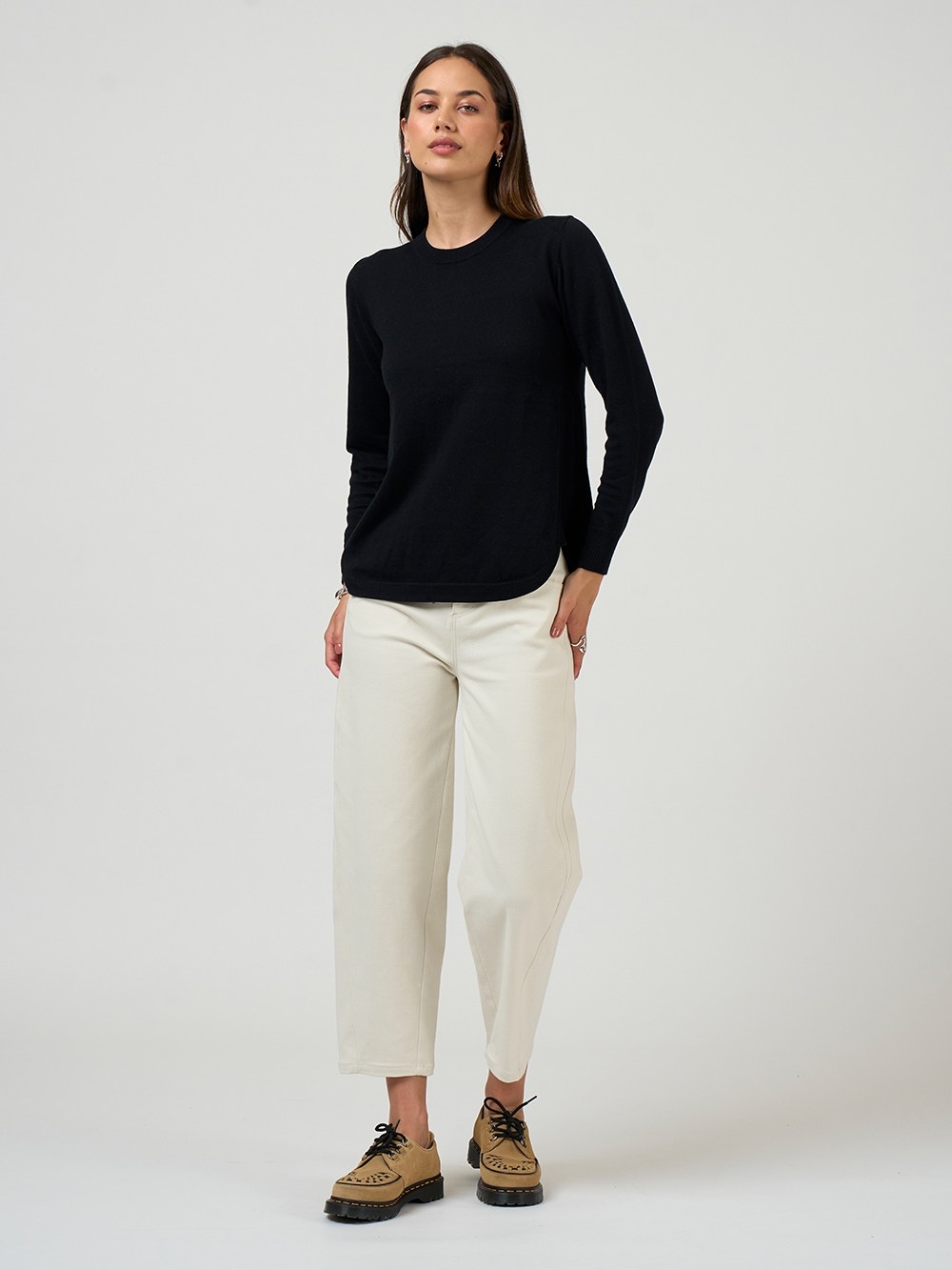 Stretch pant with a barrel style shaped leg, featuring angled seams that wrap around the leg, with jean-style pockets, top stitching and hardware and hem darts for a flattering leg line.