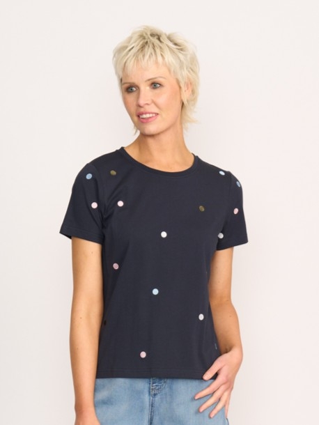 This playful top would be the perfect pair with your favourite denim. Multi-coloured embroidery dots feature all over the t-shirt. Body length from the shoulder to the hem is approx. 62.5cm (size M).