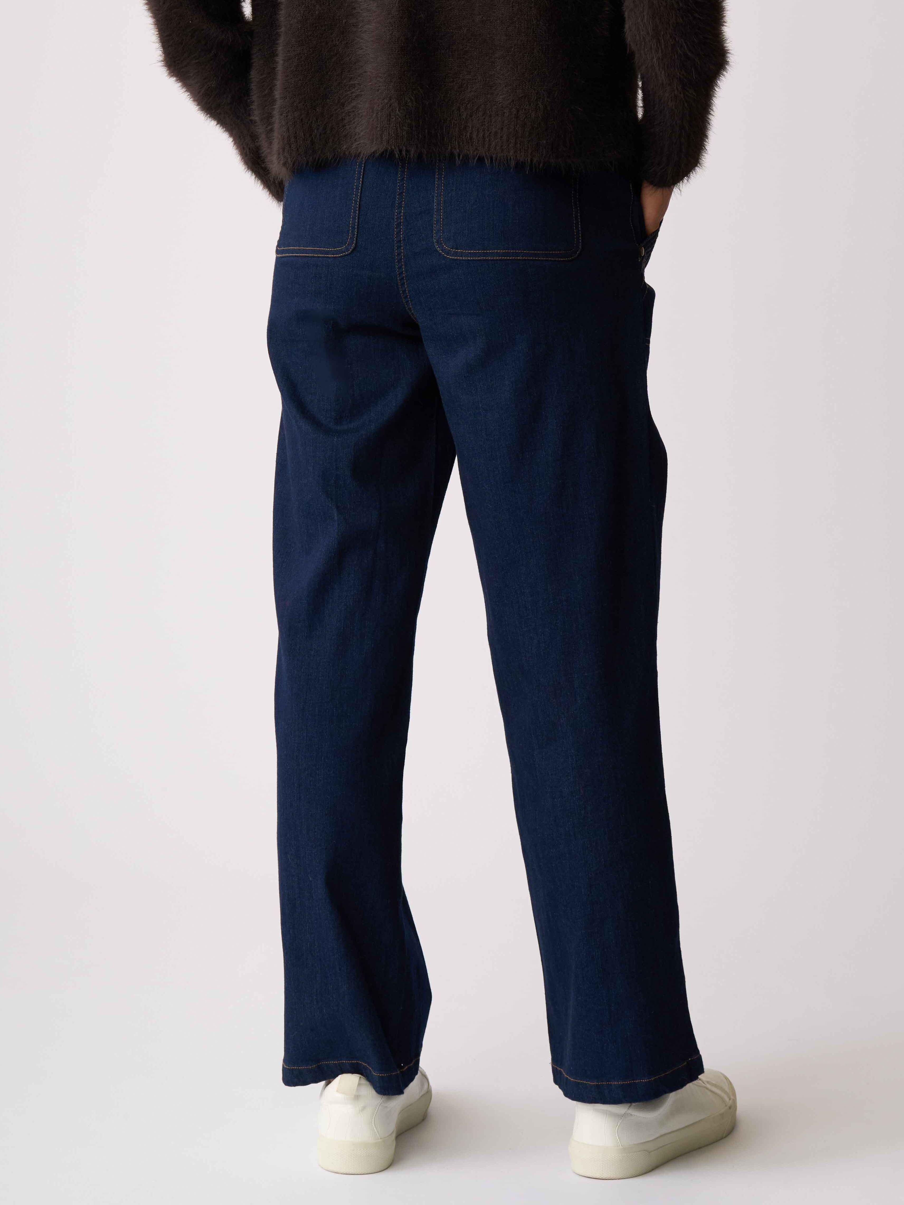 - High waisted, wide leg denim with decorative topstitching detail.
