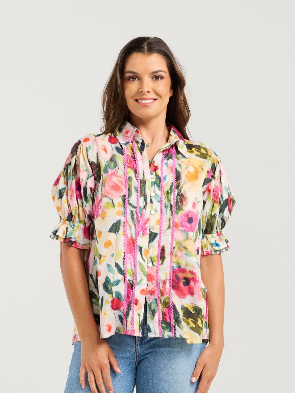 This is a romantic,painterly floral blouse. With a collared neckline, shell buttons and vertical lace trim. The gathered elbow length sleeves with soft ruffles add a touch of charm.