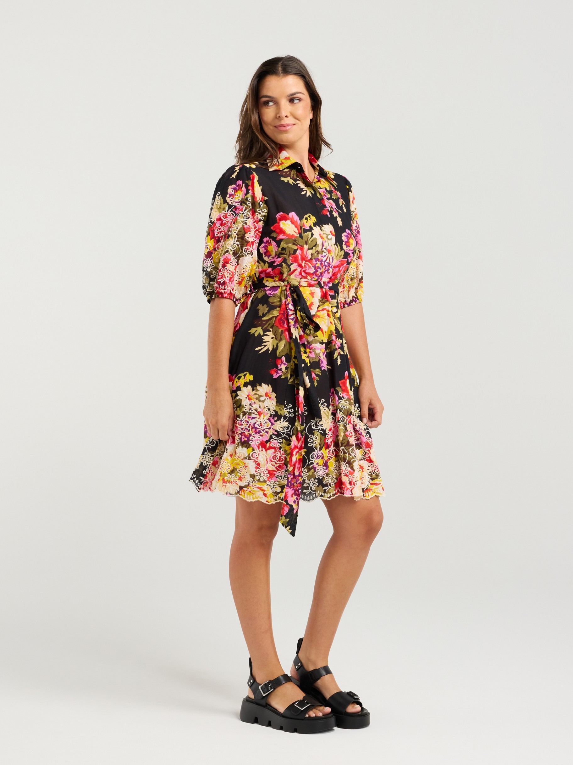 Description:A floral shirt dress with embroidered sleeves and a bold black base. Features a collared neckline, tie waist and scallop hem for a polished yet playful finish. Composition:100% Cotton