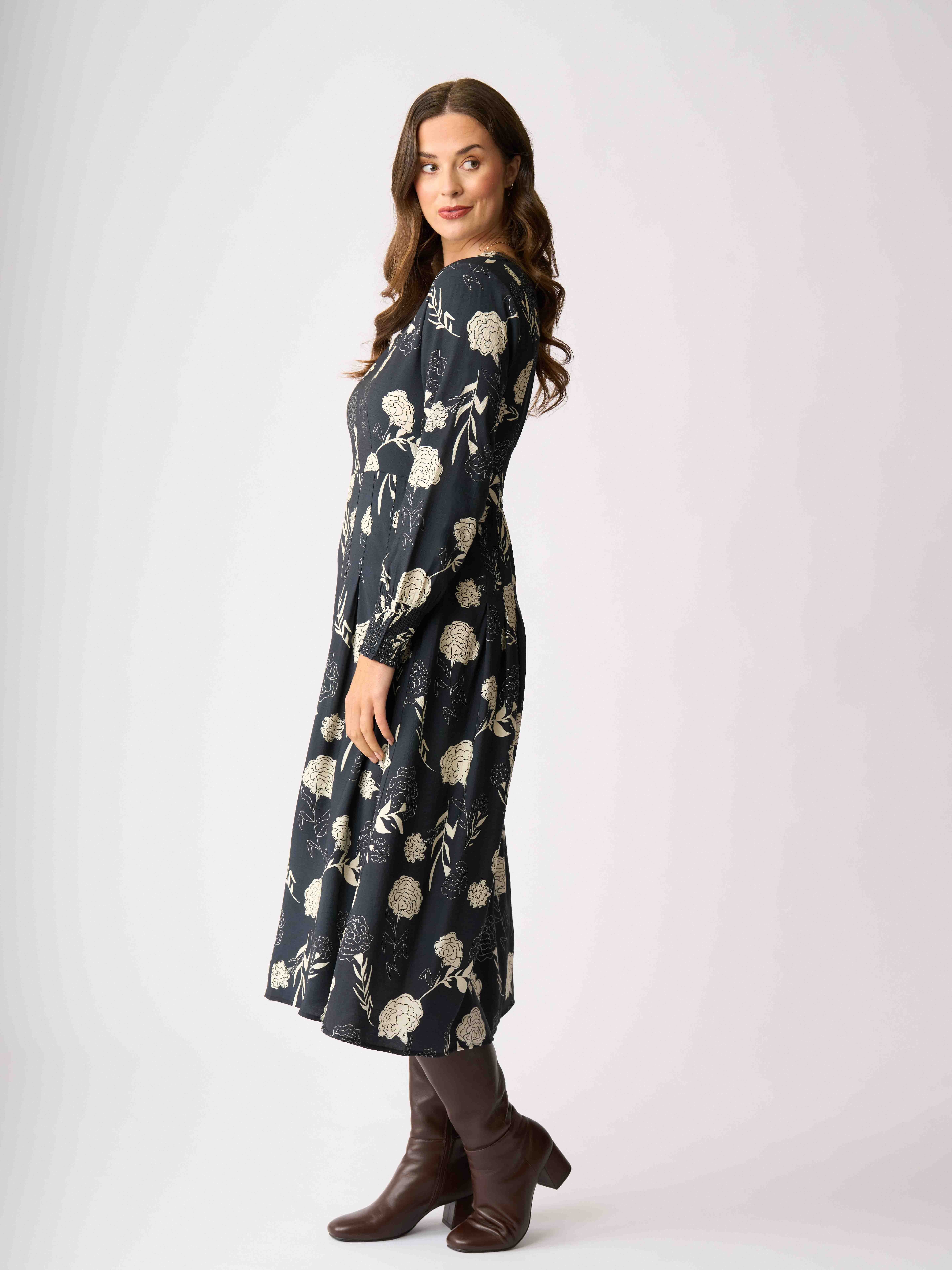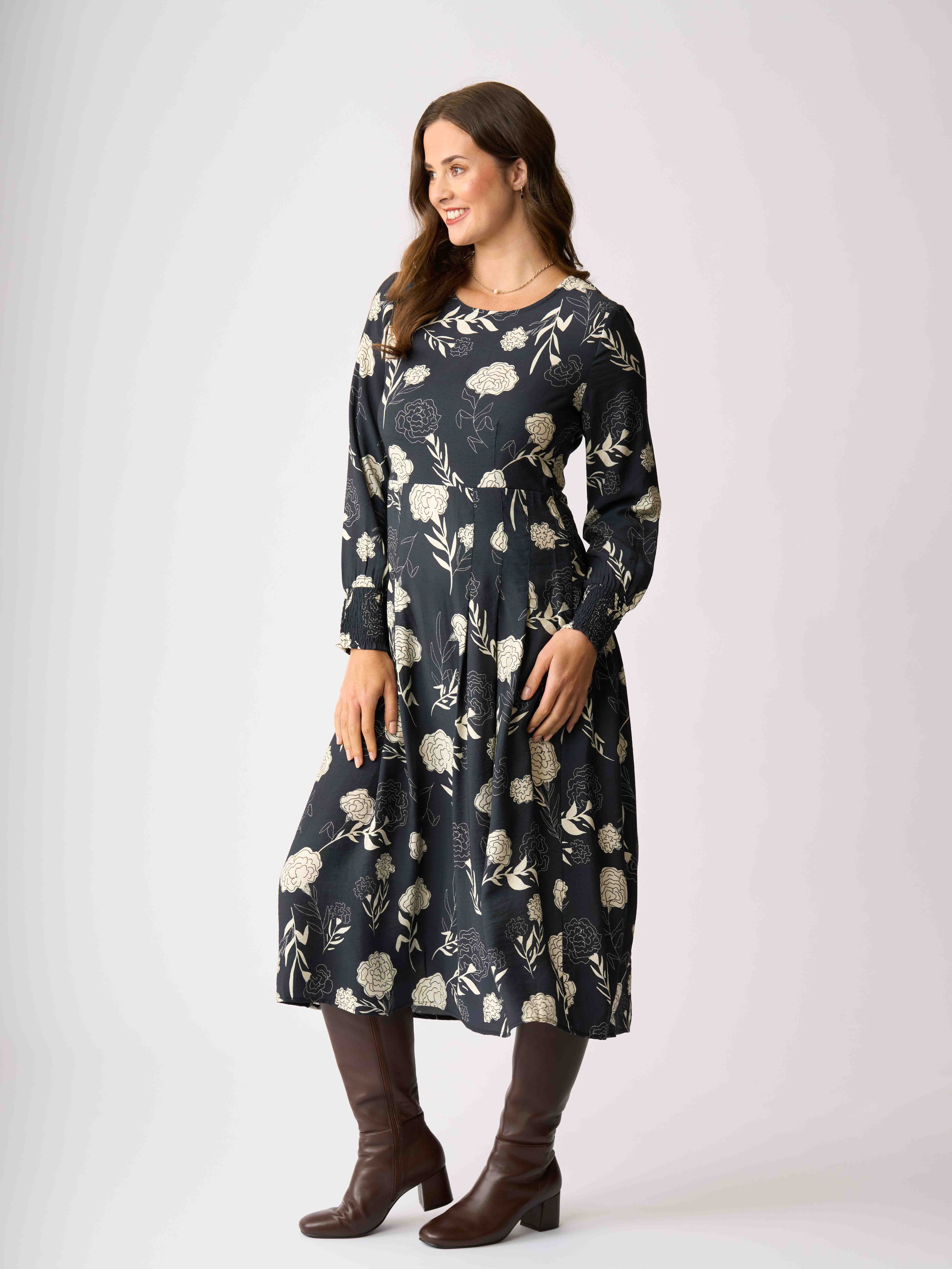 - Scoop neck dress with full length sleeves that have a shirred cuff.