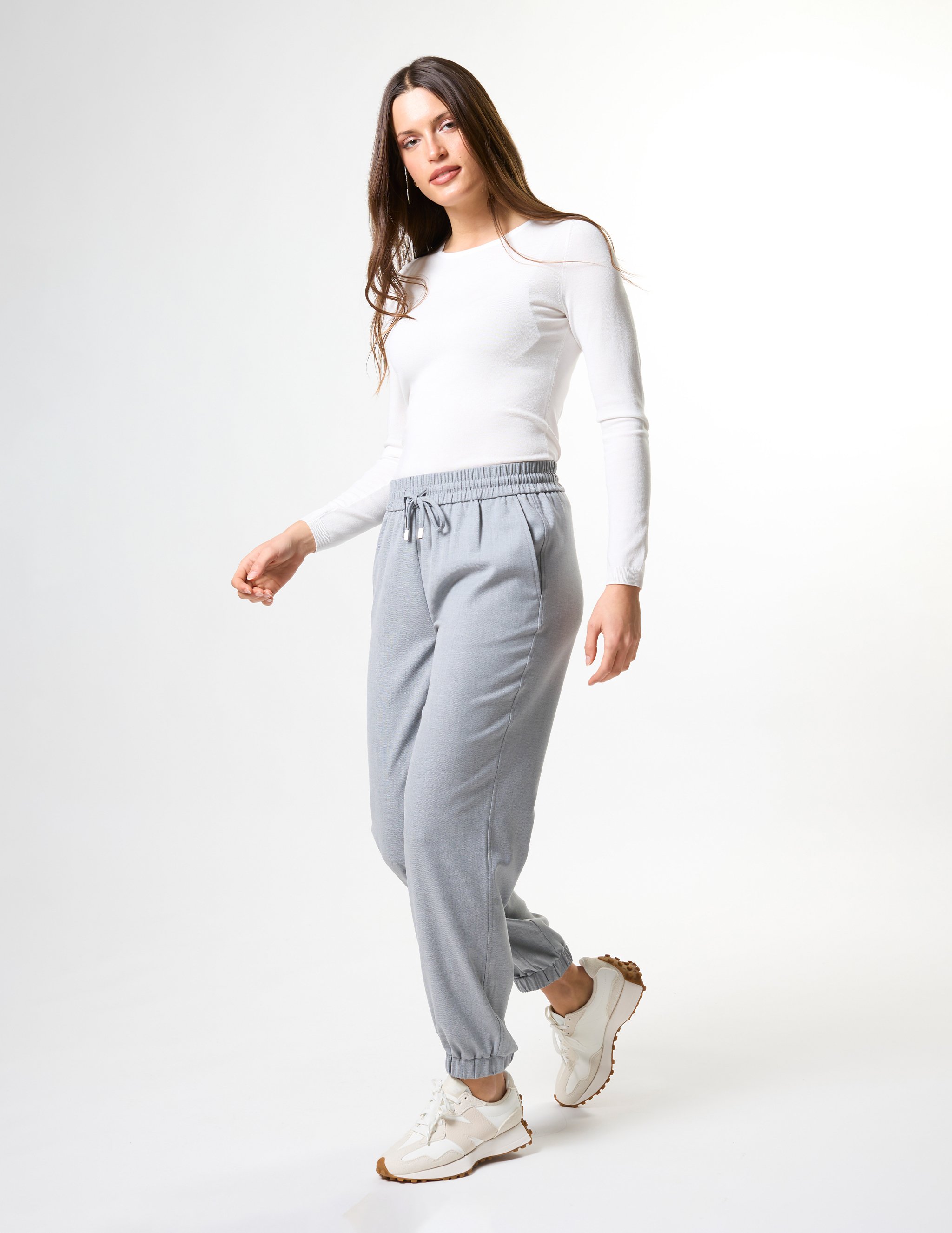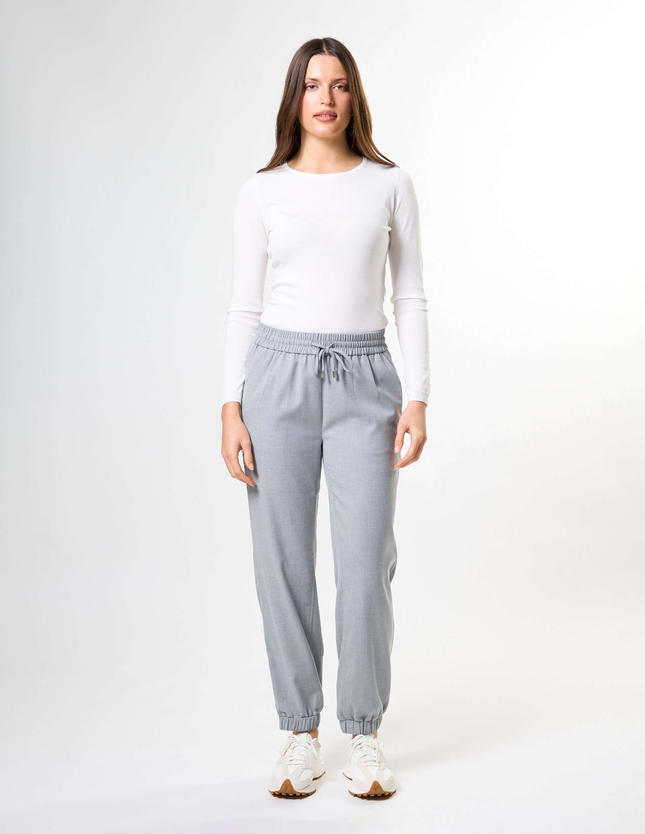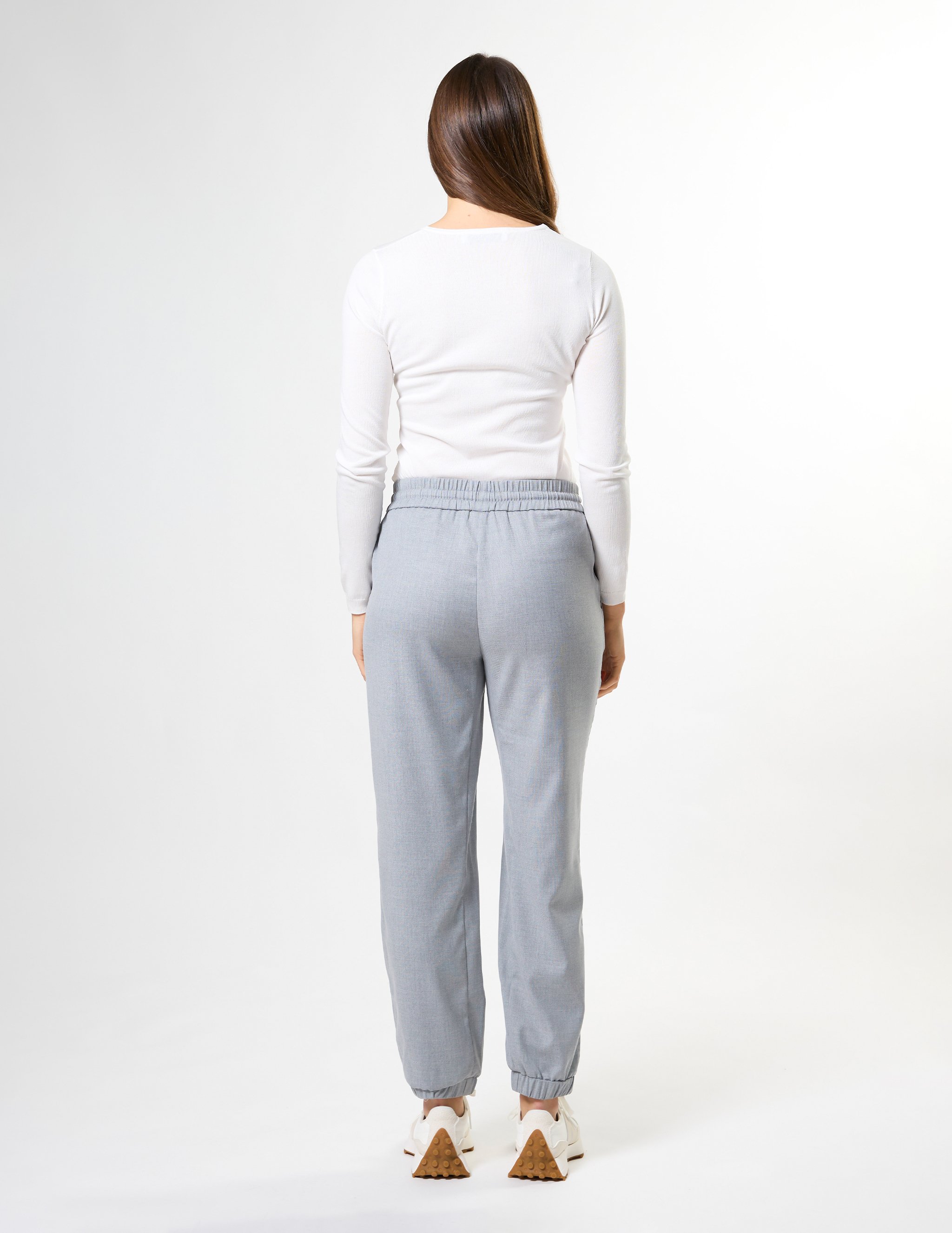 Slim fit pant with elasticated waist, side angle pockets and elasticated hem cuff. Self fabric drawcord at waist.