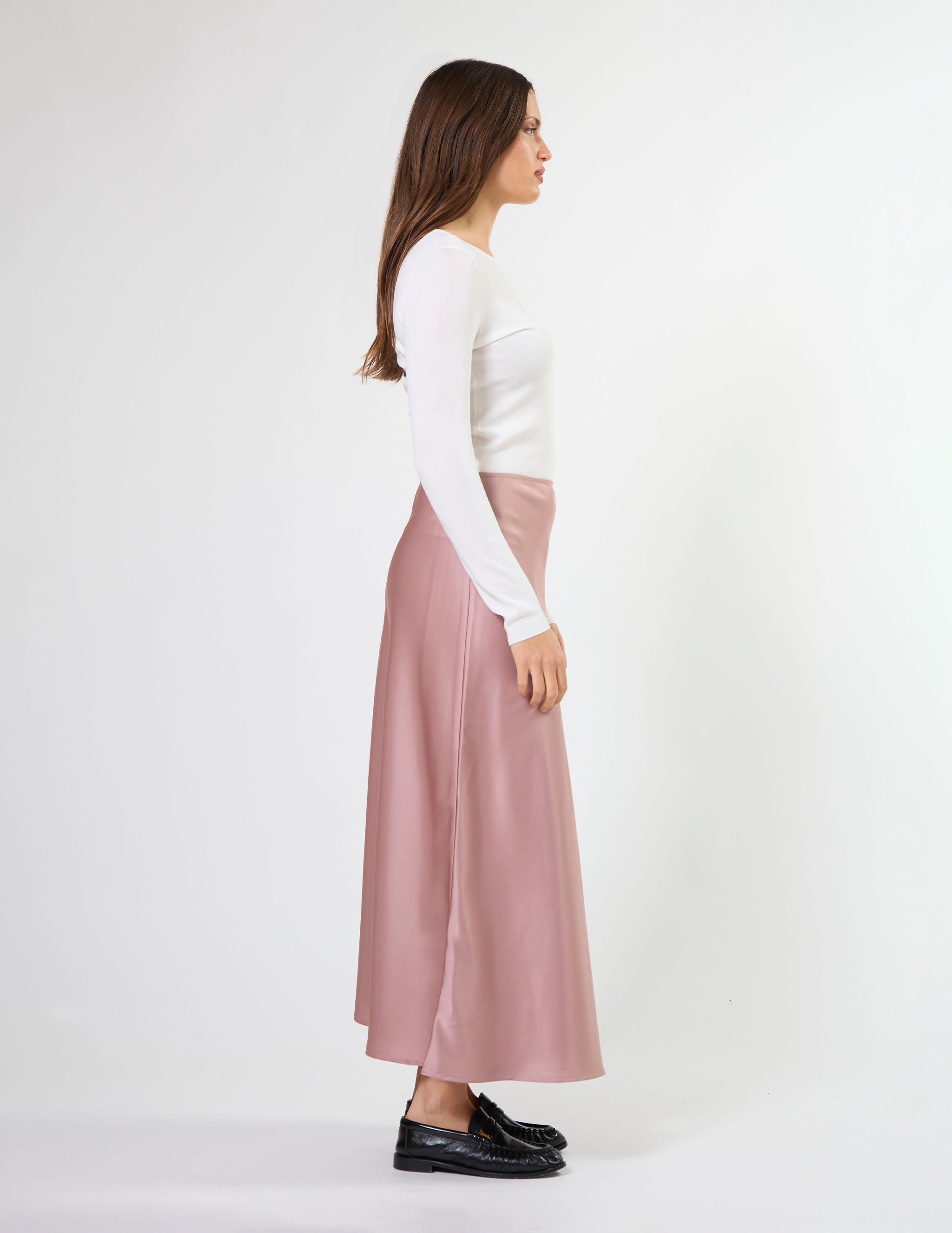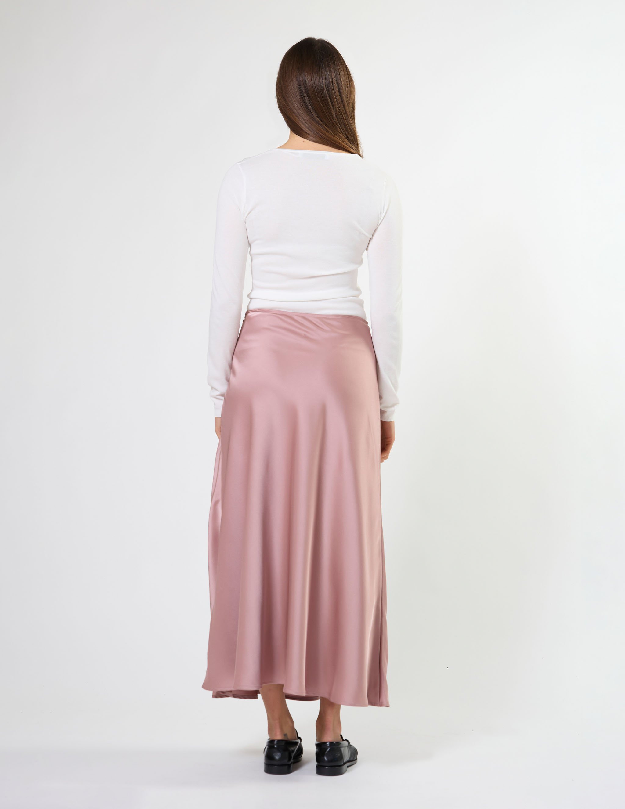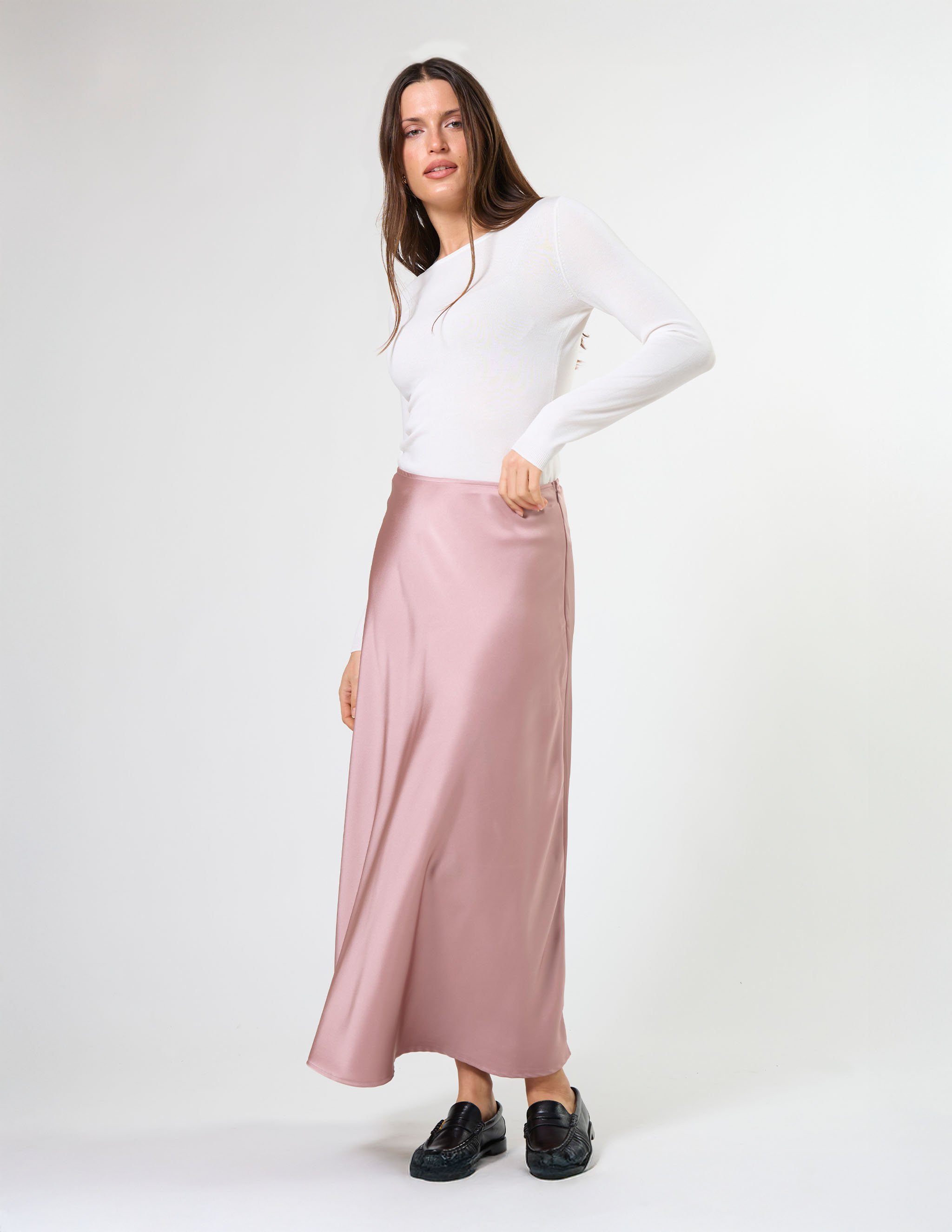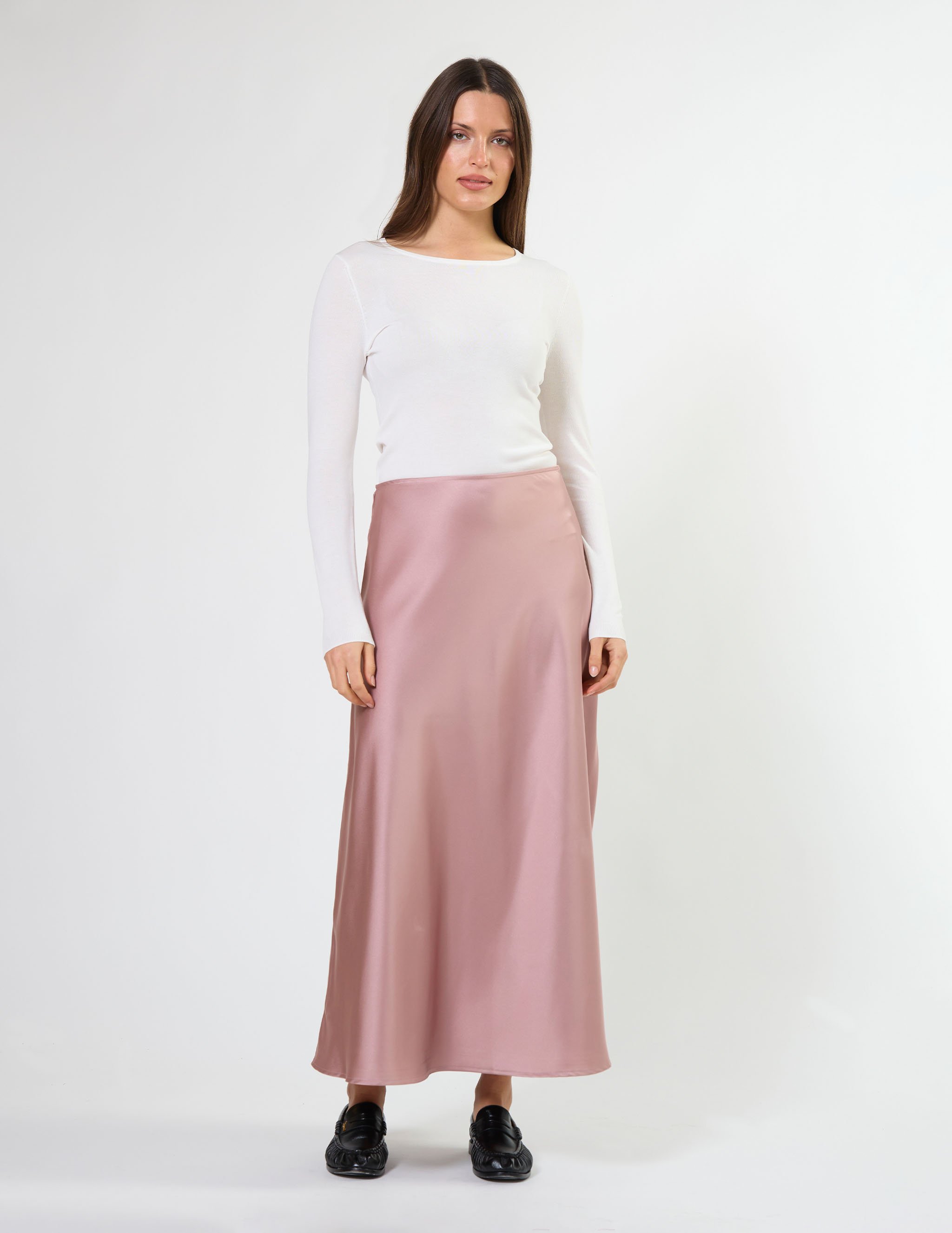 Bias cut satin maxi skirt with invisible zip and hook and eye fastening at side seam.