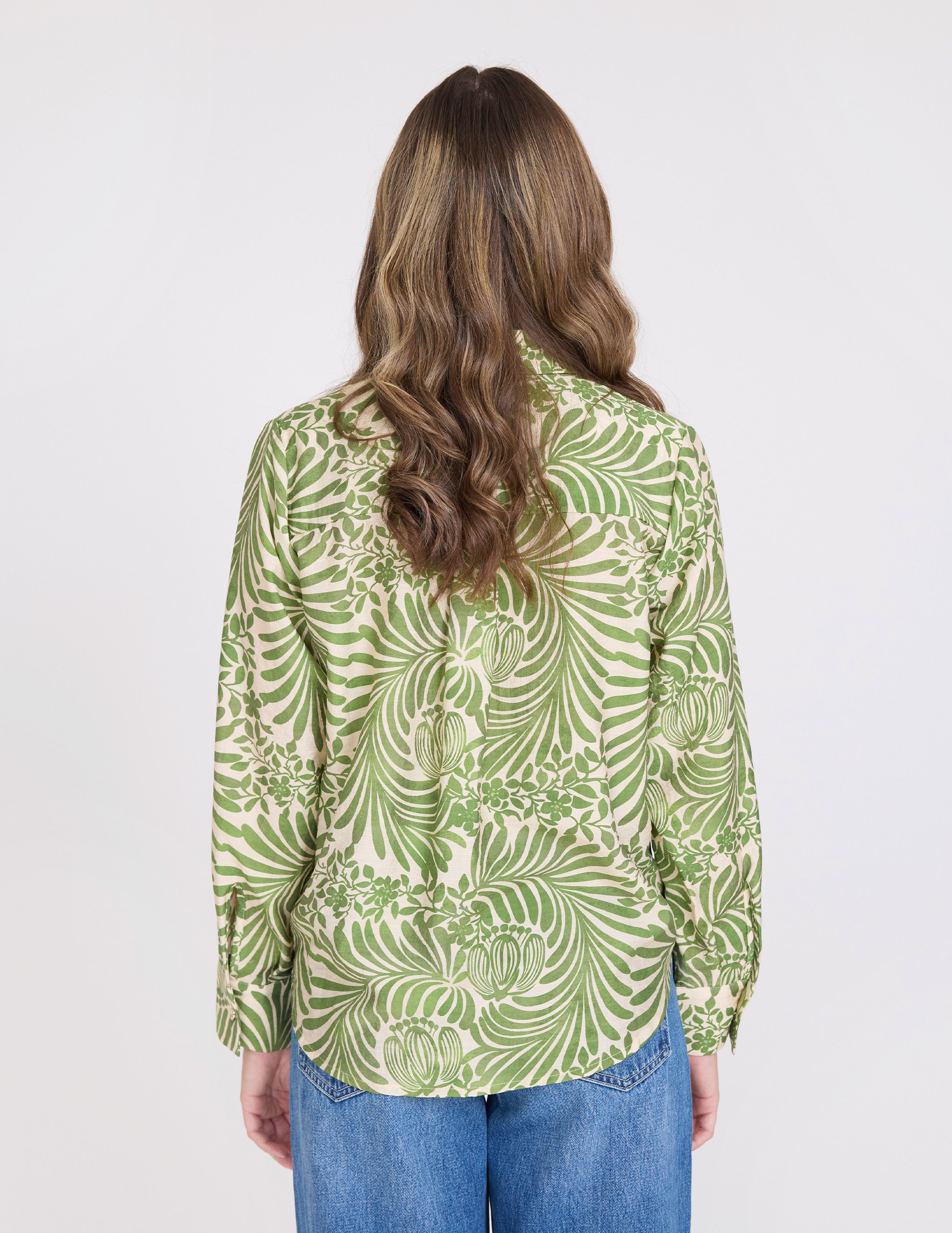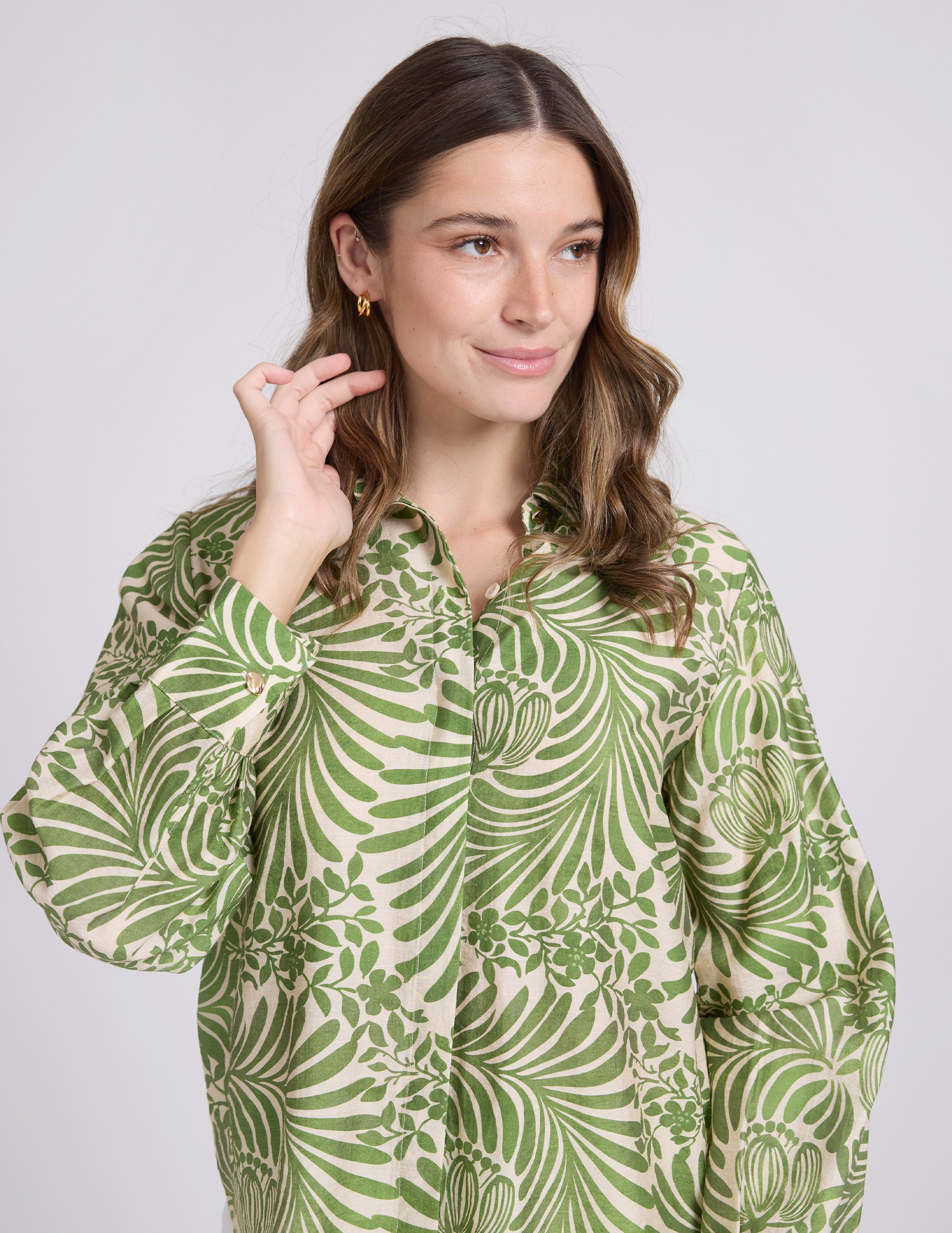 Printed blouse with concealed placket and gold novelty button at collar.