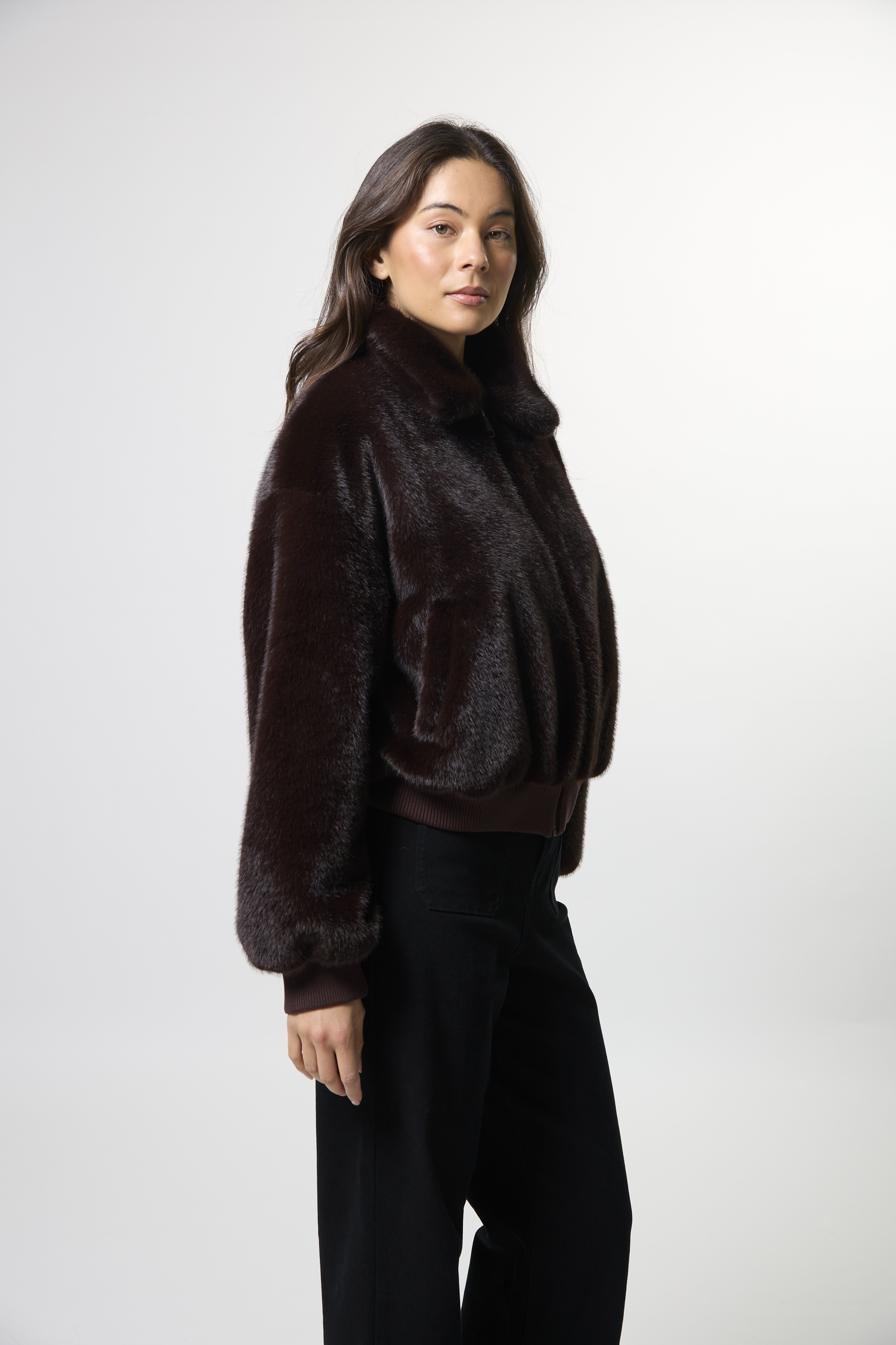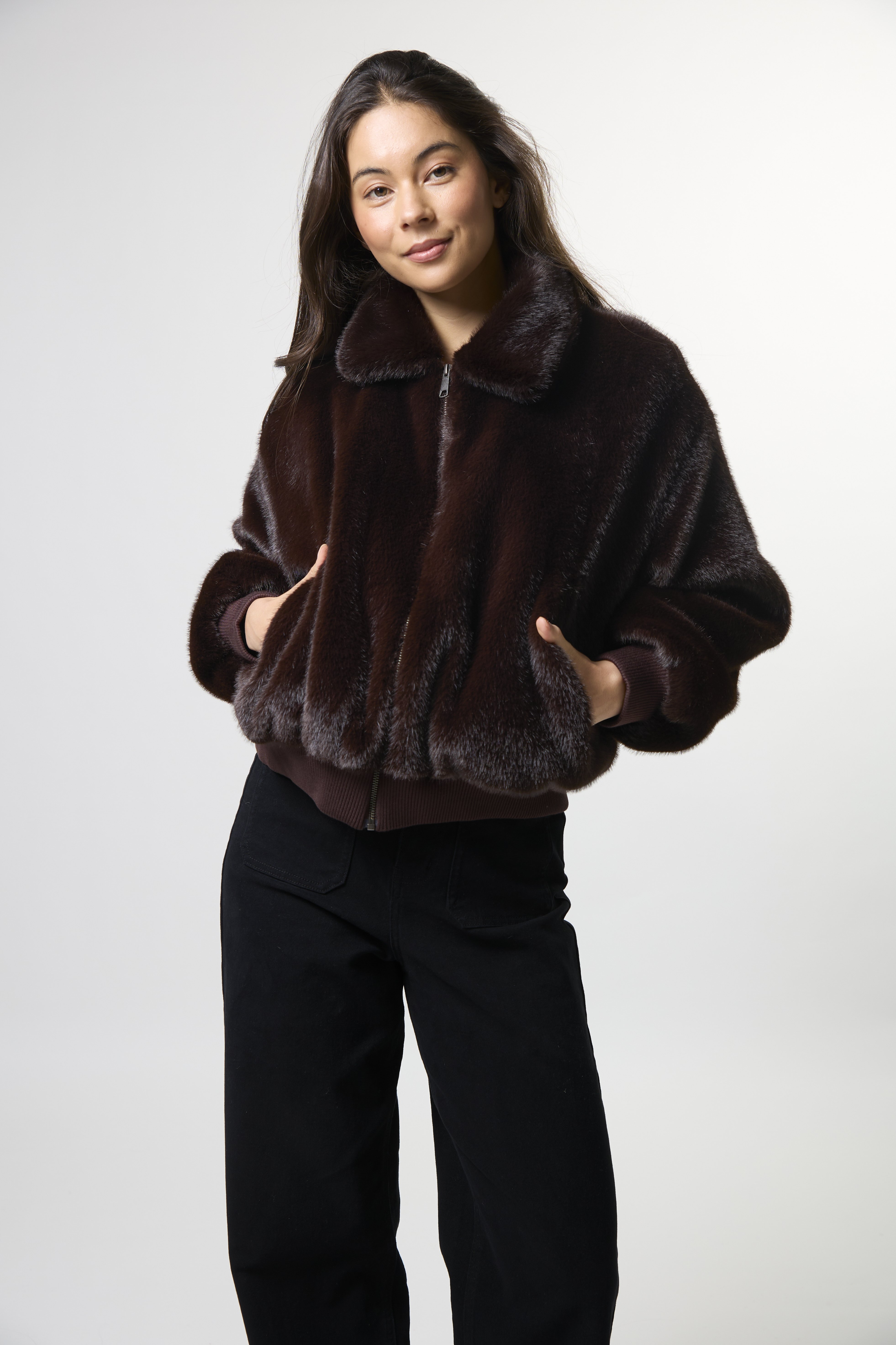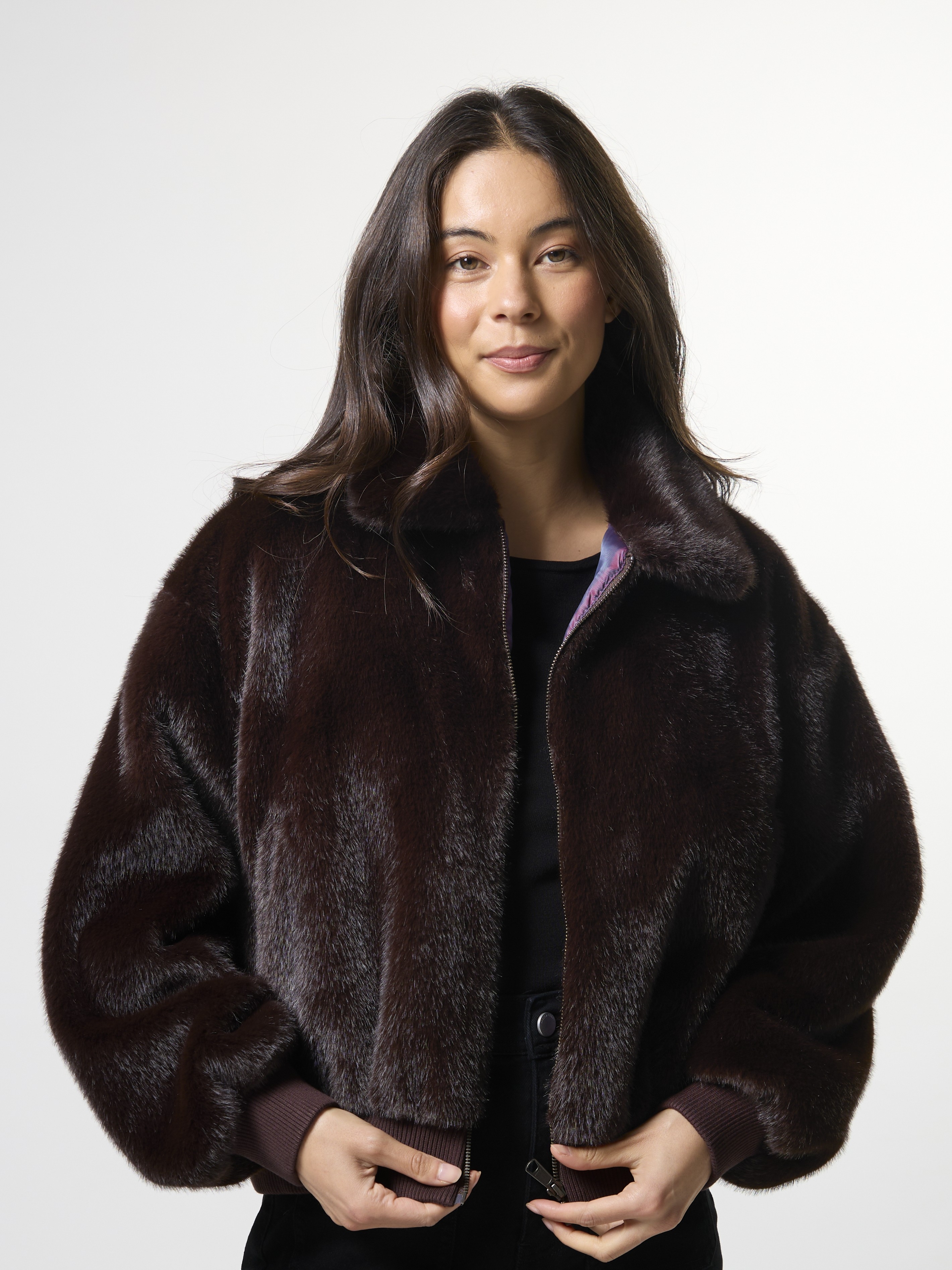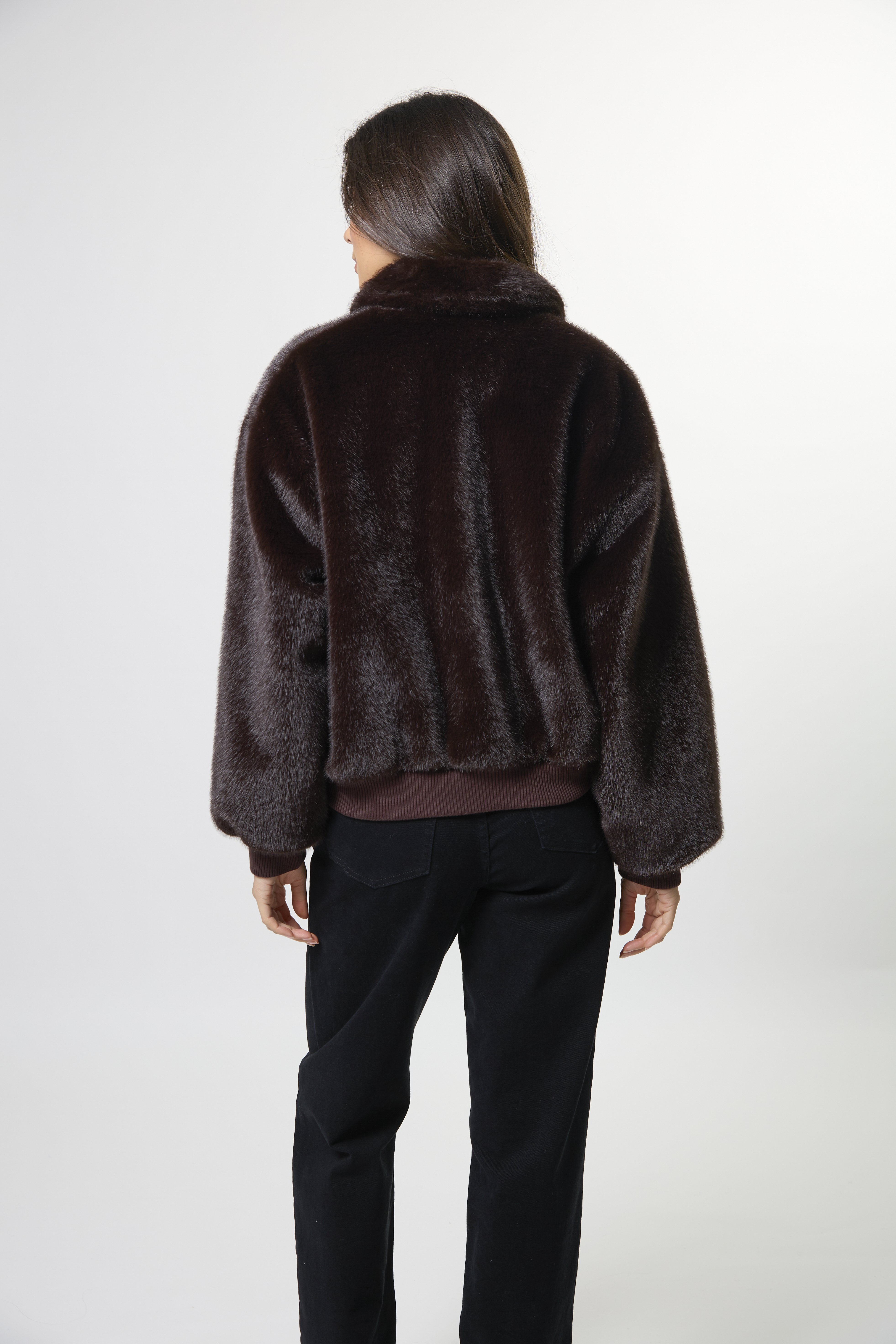Fur bomber jacket with zip front, collar and ribbed trims on hem and cuff. Fully lined.