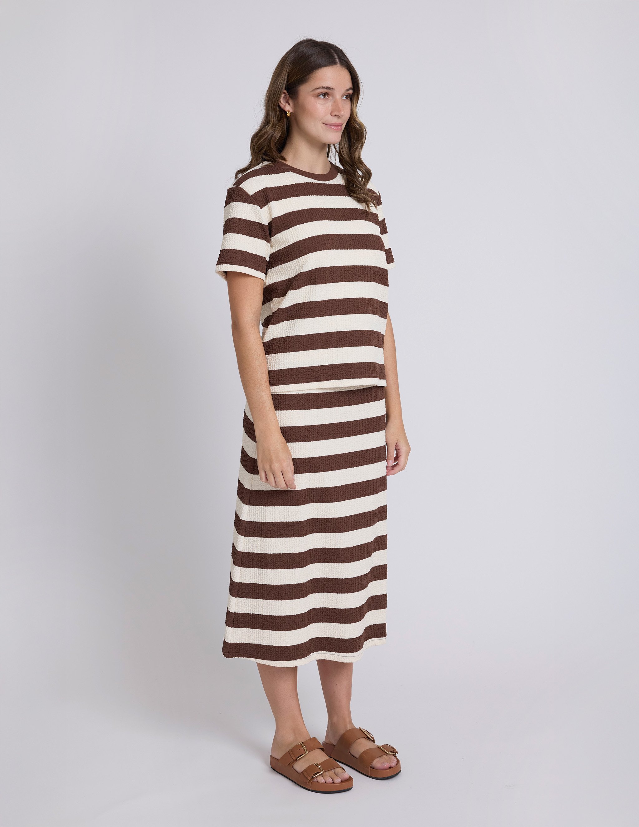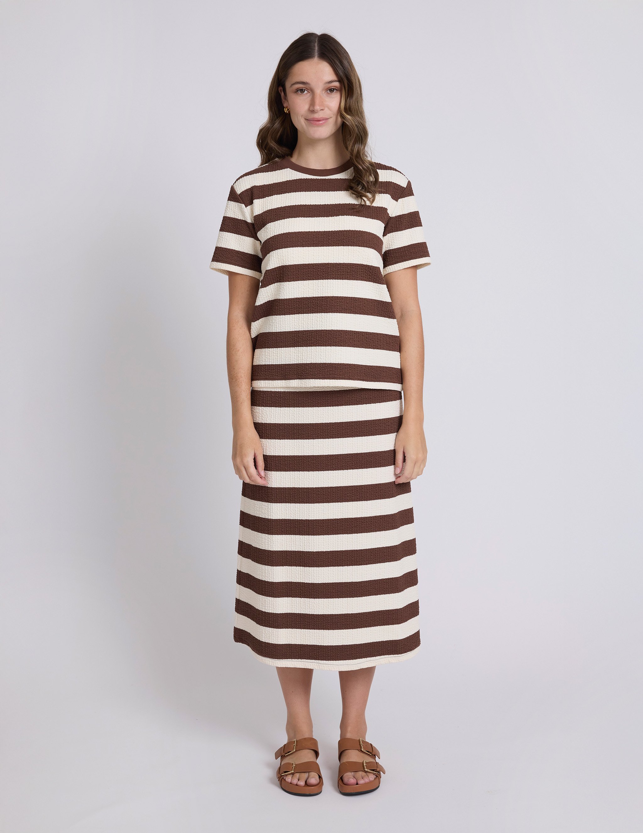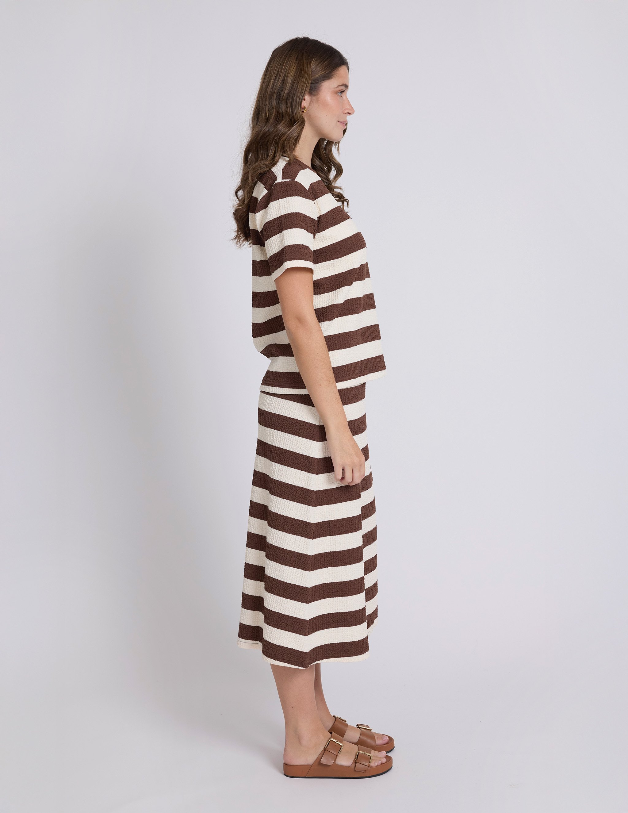 Textured jersey knit skirt in bold stripe. Mid length A line shaping with concealed elasticated waistband.