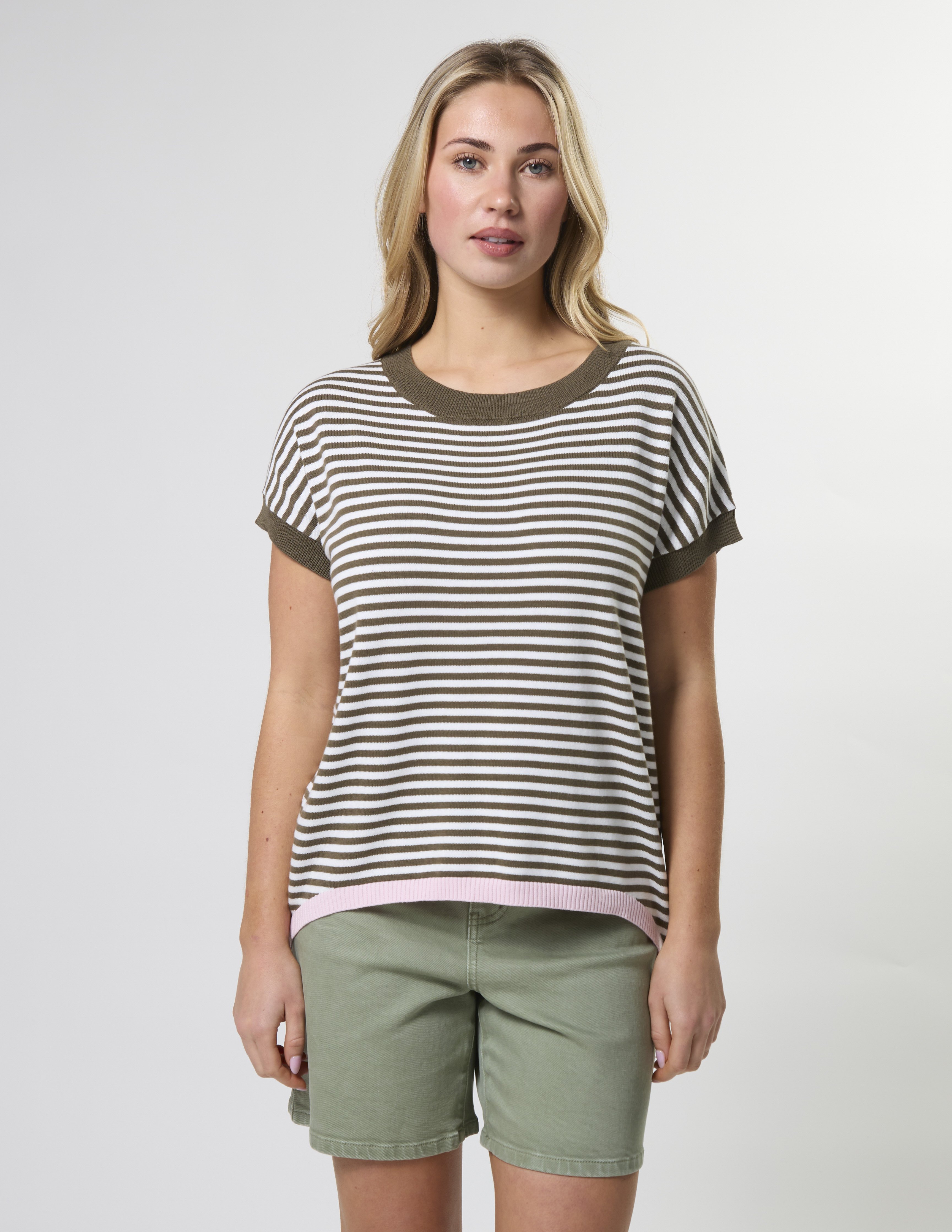 Lightweight striped knit with contrast colour trims. Crew neck, dropped cap sleeve shoulder and hi lo hemline.
