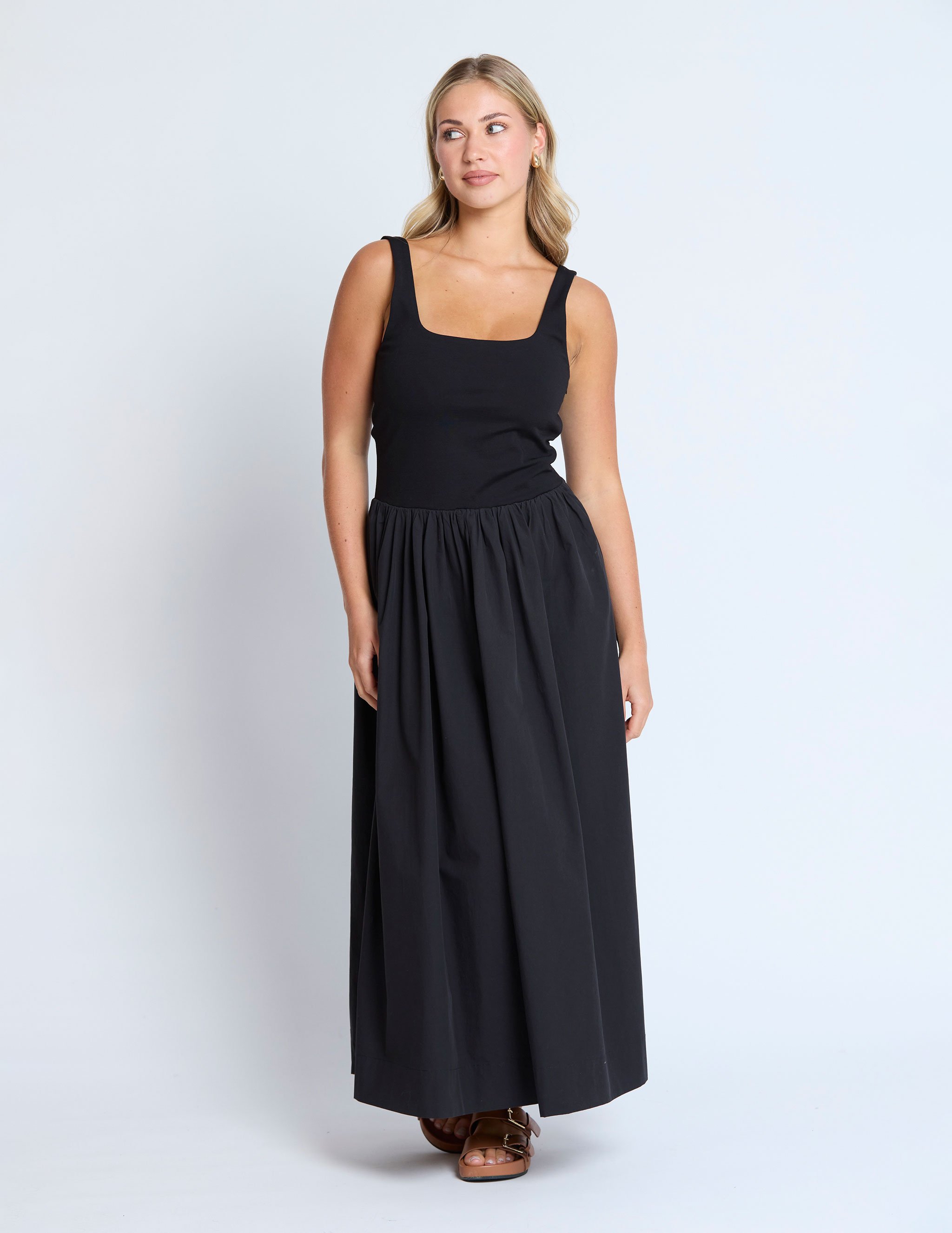 Maxi Dress With Fitted Shaped Bodice And Full Gathered Skirt. Side Zip Opening In Bodice.